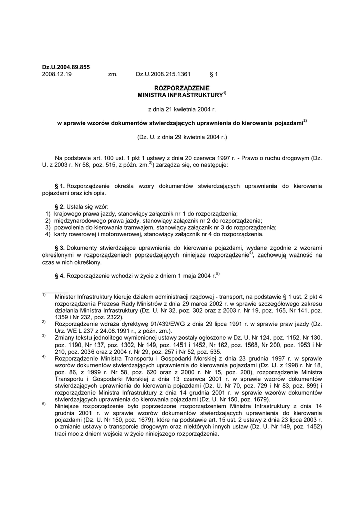 Dz.U.2004.89.855 2008.12.19 zm. Dz.U.2008.215.1361 §1 ROZPORZĄDZENIE 1) MINISTRA INFRASTRUKTURY z dnia 21 kwietnia 2004 r. w sprawie wzorów dokumentów stwierdzających uprawnienia do kierowania pojazdami 2) (Dz. U. z dnia 29 kwietnia 2004 r.) Na podstawie art. 100 ust. 1 pkt 1 ustawy z dnia 20 czerwca 1997 r. - Prawo o ruchu drogowym (Dz. 3) U. z 2003 r. Nr 58, poz. 515, z późn. zm. ) zarządza się, co następuje: § 1. Rozporządzenie określa wzory dokumentów stwierdzających uprawnienia do kierowania pojazdami oraz ich opis. 1) 2) 3) 4) § 2. Ustala się wzór: krajowego prawa jazdy, stanowiący załącznik nr 1 do rozporządzenia; międzynarodowego prawa jazdy, stanowiący załącznik nr 2 do rozporządzenia; pozwolenia do kierowania tramwajem, stanowiący załącznik nr 3 do rozporządzenia; karty rowerowej i motorowerowej, stanowiący załącznik nr 4 do rozporządzenia. § 3. Dokumenty stwierdzające uprawnienia do kierowania pojazdami, wydane zgodnie z wzorami 4) określonymi w rozporządzeniach poprzedzających niniejsze rozporządzenie , zachowują ważność na czas w nich określony. § 4. Rozporządzenie wchodzi w życie z dniem 1 maja 2004 r.5) ________ 1) Minister Infrastruktury kieruje działem administracji rządowej - transport, na podstawie § 1 ust. 2 pkt 4 rozporządzenia Prezesa Rady Ministrów z dnia 29 marca 2002 r. w sprawie szczegółowego zakresu działania Ministra Infrastruktury (Dz. U. Nr 32, poz. 302 oraz z 2003 r. Nr 19, poz. 165, Nr 141, poz. 1359 i Nr 232, poz. 2322). 2) Rozporządzenie wdraża dyrektywę 91/439/EWG z dnia 29 lipca 1991 r. w sprawie praw jazdy (Dz. Urz. WE L 237 z 24.08.1991 r., z późn. zm.). 3) Zmiany tekstu jednolitego wymienionej ustawy zostały ogłoszone w Dz. U. Nr 124, poz. 1152, Nr 130, poz. 1190, Nr 137, poz. 1302, Nr 149, poz. 1451 i 1452, Nr 162, poz. 1568, Nr 200, poz. 1953 i Nr 210, poz. 2036 oraz z 2004 r. Nr 29, poz. 257 i Nr 52, poz. 535. 4) Rozporządzenie Ministra Transportu i Gospodarki Morskiej z dnia 23 grudnia 1997 r. w sprawie wzorów dokumentów stwierdzających uprawnienia do kierowania pojazdami (Dz. U. z 1998 r. Nr 18, poz. 86, z 1999 r. Nr 58, poz. 620 oraz z 2000 r. Nr 15, poz. 200), rozporządzenie Ministra Transportu i Gospodarki Morskiej z dnia 13 czerwca 2001 r. w sprawie wzorów dokumentów stwierdzających uprawnienia do kierowania pojazdami (Dz. U. Nr 70, poz. 729 i Nr 83, poz. 899) i rozporządzenie Ministra Infrastruktury z dnia 14 grudnia 2001 r. w sprawie wzorów dokumentów stwierdzających uprawnienia do kierowania pojazdami (Dz. U. Nr 150, poz. 1679). 5) Niniejsze rozporządzenie było poprzedzone rozporządzeniem Ministra Infrastruktury z dnia 14 grudnia 2001 r. w sprawie wzorów dokumentów stwierdzających uprawnienia do kierowania pojazdami (Dz. U. Nr 150, poz. 1679), które na podstawie art. 15 ust. 2 ustawy z dnia 23 lipca 2003 r. o zmianie ustawy o transporcie drogowym oraz niektórych innych ustaw (Dz. U. Nr 149, poz. 1452) traci moc z dniem wejścia w życie niniejszego rozporządzenia. ZAŁĄCZNIKI ZAŁĄCZNIK Nr 1 I. Wzór krajowego prawa jazdy wzór II. Opis wzoru krajowego prawa jazdy 1.1 Format karty identyfikacyjnej (układ poziomy) o wymiarze 53,98 x 85,60 mm i promieniu zaokrągleń 3,18 mm i grubości 0,76 mm (+80 µm/-300 µm), której inne właściwości fizyczne i chemiczne odpowiadają standardom określonym w normach: 1) PN-ISO/IEC 7810:1997, Karty identyfikacyjne. Charakterystyki fizyczne, 2) PN-EN ISO/IEC 10373:1997, Karty identyfikacyjne. Metody testowania. 1.2 Karta składa się z rdzenia karty i folii laminującej. 1.3 Barwa tła rdzenia prawa jazdy jest utrzymana w tonacji różowej z nadrukami wyrazów "Prawo jazdy" w językach krajów członkowskich, z zastrzeżeniem pkt 2.5. Poza rdzeń wystaje przezroczysty margines folii laminującej. 1.4 Barwa tekstu, symboli i znaków graficznych prawa jazdy jest czarna, z zastrzeżeniem pkt 2.2 i 2.3. 1.5 Prawo jazdy zawiera elementy zabezpieczające dokument przed sfałszowaniem i podrobieniem. 1.6 Prawo jazdy ma dwie strony. 2.1 Na pierwszej stronie umieszcza się: 2.2 W dwóch wierszach - wyrazy o treściach: "RZECZPOSPOLITA POLSKA", "PRAWO JAZDY" barwy niebieskiej rozdzielone elementem zabezpieczającym. 2.3 W lewym górnym rogu - symbol "PL" wpisany w okrąg utworzony przez 12 gwiazdek o barwie żółtej na niebieskim tle w kształcie prostokąta o wymiarze 12,5 x 21 mm. 2.4 Następujące cyfry i dane oznaczające: 1nazwisko, 2imię (imiona), 3datę i miejsce urodzenia, 4a - datę wydania prawa jazdy, 4b - datę ważności prawa jazdy( znak "-" oznacza bezterminową ważność prawa jazdy), 4c - organ wydający, 4d - nr PESEL, 5numer prawa jazdy, 7podpis posiadacza, 8adres, 9kategorie, z wyjątkiem tych, których posiadanie jest warunkiem uzyskania następnych lub zakres uprawnień stanowi część lub całość uprawnień innej kategorii. 2.5 Pod symbolem, o którym mowa w pkt 2.3 - fotografię. 2.6 W prawym dolnym rogu elementy zabezpieczające w postaci znaku graficznego i umieszczonej nad nim pomniejszonej fotografii posiadacza wykonanej specjalną techniką. 3.1 Na drugiej stronie umieszcza się: 3.2 W lewym górnym rogu - ramkę ograniczającą obszar o wymiarze 7 x 18 mm, oznaczoną liczbą 13; odstęp pomiędzy krótszym bokiem ramki a krótszym bokiem tabeli, o której mowa w pkt 3.5, wynosi 7,5 mm. W przestrzeni między ramką a tabelą znajduje się element zabezpieczający. 3.3 Poniżej ramki, o której mowa w pkt 3.2, umieszcza się kod kreskowy zawierający cechy identyfikujące dokument oraz poniżej numer druku składający się z jednej litery alfabetu łacińskiego i siedmiu cyfr arabskich. 3.4 W lewym dolnym rogu - objaśnienie dotyczące rodzaju wypełnianych danych: 1nazwisko, 2imię (imiona), 3data i miejsce urodzenia, 4a - data wydania prawa jazdy, 4b - data ważności prawa jazdy, 4c - organ wydający, 4d - nr PESEL, 5numer prawa jazdy, 7podpis posiadacza 8adres, 9kategorie, 10 - data wy