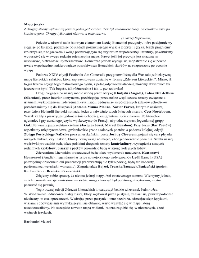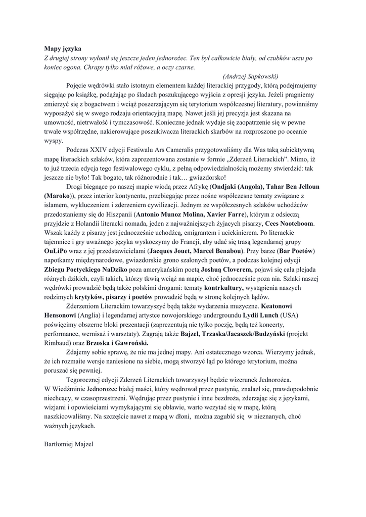 Mapy języka Z drugiej strony wyłonił się jeszcze jeden jednorożec. Ten był całkowicie biały, od czubków uszu po koniec ogona. Chrapy tylko miał różowe, a oczy czarne. (Andrzej Sapkowski) Pojęcie wędrówki stało istotnym elementem każdej literackiej przygody, którą podejmujemy sięgając po książkę, podążając po śladach poszukującego wyjścia z opresji języka. Jeżeli pragniemy zmierzyć się z bogactwem i wciąż poszerzającym się terytorium współczesnej literatury, powinniśmy wyposażyć się w swego rodzaju orientacyjną mapę. Nawet jeśli jej precyzja jest skazana na umowność, nietrwałość i tymczasowość. Konieczne jednak wydaje się zaopatrzenie się w pewne trwałe współrzędne, nakierowujące poszukiwacza literackich skarbów na rozproszone po oceanie wyspy. Podczas XXIV edycji Festiwalu Ars Cameralis przygotowaliśmy dla Was taką subiektywną mapę literackich szlaków, która zaprezentowana zostanie w formie „Zderzeń Literackich”. Mimo, iż to już trzecia edycja tego festiwalowego cyklu, z pełną odpowiedzialnością możemy stwierdzić: tak jeszcze nie było! Tak bogato, tak różnorodnie i tak… gwiazdorsko! Drogi biegnące po naszej mapie wiodą przez Afrykę ( Ondjaki (Angola), Tahar Ben Jelloun (Maroko )), przez interior kontynentu, przebiegając przez nośne współczesne tematy związane z islamem, wykluczeniem i zderzeniem cywilizacji. Jednym ze współczesnych szlaków uchodźców przedostaniemy się do Hiszpanii ( Antonio Munoz Molina, Xavier Farre ), którym z odsieczą przyjdzie z Holandii literacki nomada, jeden z najważniejszych żyjacych pisarzy, Cees Nooteboom . Wszak każdy z pisarzy jest jednocześnie uchodźcą, emigrantem i uciekinierem. Po literackie tajemnice i gry uważnego języka wyskoczymy do Francji, aby udać się trasą legendarnej grupy OuLiPo wraz z jej przedstawicielami ( Jacques Jouet, Marcel Benabou ). Przy barze ( Bar Poetów ) napotkamy międzynarodowe, gwiazdorskie grono szalonych poetów, a podczas kolejnej edycji Zbiegu Poetyckiego NaDziko poza amerykańskim poetą Joshuą Cloverem, pojawi się cała plejada różnych dzikich, czyli takich, którzy tkwią wciąż na mapie, choć jednocześnie poza nia. Szlaki naszej wędrówki prowadzić będą także polskimi drogami: tematy kontrkultury, wystąpienia naszych rodzimych krytyków, pisarzy i poetów prowadzić będą w stronę kolejnych lądów. Zderzeniom Literackim towarzyszyć będą także wydarzenia muzyczne. Keatonowi Hensonowi (Anglia) i legendarnej artystce nowojorskiego undergroundu Lydii Lunch (USA) poświęcimy obszerne bloki prezentacji (zaprezentują nie tylko poezję, będą też koncerty, performance, wernisaż i warsztaty). Zagrają także Bajzel, Trzaska/Jacaszek/Budzyński (projekt Rimbaud) oraz Brzoska i Gawroński. Zdajemy sobie sprawę, że nie ma jednej mapy. Ani ostatecznego wzorca. Wierzymy jednak, że ich rozmaite wersje naniesione na siebie, mogą stworzyć ląd po którego terytorium, można poruszać się pewniej. Tegorocznej edycji Zderzeń Literackich towarzyszył będzie wizerunek Jednorożca. W Wiedźminie Jednorożec białej maści, który wędrował przez pustynię, znalazł się, prawdopodobnie niechcący, w czasoprzestrzeni. Wędrując przez pustynie i inne bezdroża, zderzając się z językami, wizjami i opowieściami wymykającymi się obławie, warto wczytać się w mapę, którą naszkicowaliśmy. Na szczęście nawet z mapą w dłoni, można zagubić się w nieznanych, choć ważnych językach. Bartłomiej Majzel