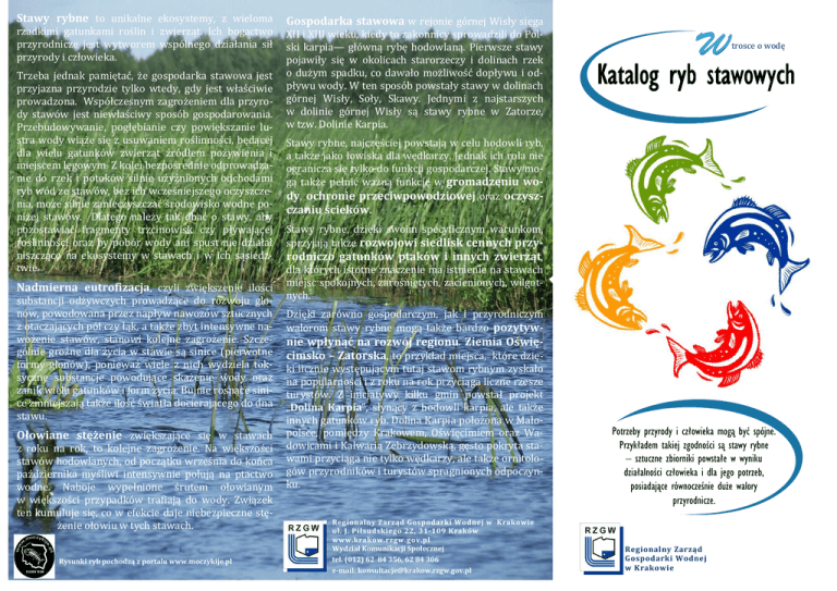 Stawy rybne to unikalne ekosystemy, z wieloma rzadkimi gatunkami roślin i zwierząt. Ich bogactwo przyrodnicze jest wytworem wspólnego działania sił przyrody i człowieka. Trzeba jednak pamiętać, że gospodarka stawowa jest przyjazna przyrodzie tylko wtedy, gdy jest właściwie prowadzona. Współczesnym zagrożeniem dla przyrody stawów jest niewłaściwy sposób gospodarowania. Przebudowywanie, pogłębianie czy powiększanie lustra wody wiąże się z usuwaniem roślinności, będącej dla wielu gatunków zwierząt źródłem pożywienia i miejscem lęgowym. Z kolei bezpośrednie odprowadzanie do rzek i potoków silnie użyźnionych odchodami ryb wód ze stawów, bez ich wcześniejszego oczyszczenia, może silnie zanieczyszczać środowisko wodne poniżej stawów. Dlatego należy tak dbać o stawy, aby pozostawiać fragmenty trzcinowisk czy pływającej roślinności oraz by pobór wody ani spust nie działał niszcząco na ekosystemy w stawach i w ich sąsiedztwie. Nadmierna eutrofizacja, czyli zwiększenie ilości substancji odżywczych prowadzące do rozwoju glonów, powodowana przez napływ nawozów sztucznych z otaczających pól czy łąk, a także zbyt intensywne nawożenie stawów, stanowi kolejne zagrożenie. Szczególnie groźne dla życia w stawie są sinice (pierwotne formy glonów), ponieważ wiele z nich wydziela toksyczne substancje powodujące skażenie wody oraz zanik wielu gatunków i form życia. Bujnie rosnące sinice zmniejszają także ilość światła docierającego do dna stawu. Ołowiane stężenie zwiększające się w stawach z roku na rok, to kolejne zagrożenie. Na większości stawów hodowlanych, od początku września do końca października myśliwi intensywnie polują na ptactwo wodne. Naboje wypełnione śrutem ołowianym w większości przypadków trafiają do wody. Związek ten kumuluje się, co w efekcie daje niebezpieczne stężenie ołowiu w tych stawach. Rysunki ryb pochodzą z portalu www.moczykije.pl Gospodarka stawowa w rejonie górnej Wisły sięga XII i XIII wieku, kiedy to zakonnicy sprowadzili do Polski karpia— główną rybę hodowlaną. Pierwsze stawy pojawiły się w okolicach starorzeczy i dolinach rzek o dużym spadku, co dawało możliwość dopływu i odpływu wody. W ten sposób powstały stawy w dolinach górnej Wisły, Soły, Skawy. Jednymi z najstarszych w dolinie górnej Wisły są stawy rybne w Zatorze, w tzw. Dolinie Karpia. trosce o wodę Katalog ryb stawowych Stawy rybne, najczęściej powstają w celu hodowli ryb, a także jako łowiska dla wędkarzy. Jednak ich rola nie ogranicza się tylko do funkcji gospodarczej. Stawy mogą także pełnić ważną funkcję w gromadzeniu wody, ochronie przeciwpowodziowej oraz oczysz- czaniu ścieków. Stawy rybne, dzięki swoim specyficznym warunkom, sprzyjają także rozwojowi siedlisk cennych przyrodniczo gatunków ptaków i innych zwierząt, dla których istotne znaczenie ma istnienie na stawach miejsc spokojnych, zarośniętych, zacienionych, wilgotnych. Dzięki zarówno gospodarczym, jak i przyrodniczym walorom stawy rybne mogą także bardzo pozytyw- nie wpłynąć na rozwój regionu. Ziemia Oświęcimsko – Zatorska, to przykład miejsca, które dzięki licznie występującym tutaj stawom rybnym zyskało na popularności i z roku na rok przyciąga liczne rzesze turystów. Z inicjatywy kilku gmin powstał projekt „Dolina Karpia”, słynący z hodowli karpia, ale także innych gatunków ryb. Dolina Karpia położona w Małopolsce, pomiędzy Krakowem, Oświęcimiem oraz Wadowicami i Kalwarią Zebrzydowską, gęsto pokryta stawami przyciąga nie tylko wędkarzy, ale także ornitologów przyrodników i turystów spragnionych odpoczynku. Regionalny Zarząd Gospodarki Wodnej w Krakowie ul. J. Piłsudskiego 22, 31-109 Kraków www.krakow.rzgw.gov.pl Wydział Komunikacji Społecznej tel. (012) 62 84 356, 62 84 306 e-mail: [email protected] Potrzeby przyrody i człowieka mogą być spójne. Przykładem takiej zgodności są stawy rybne – sztuczne zbiorniki powstałe w wyniku działalności człowieka i dla jego potrzeb, posiadające równocześnie duże walory przyrodnicze. Regionalny Zarząd Gospodarki Wodnej w Krakowie Płoć– występuje w wodach stojących i wolno płynących. Stanowi zdecydowanie najczęstszą zdobycz wędkarską. Jako najbardziej rozpowszechniona ryba naszych wód występuje niemal wszędzie, z wyjątkiem najwyższych, przyźródłowych odcinków górskich rzek. Żyje w stadach, żeruje gromadnie. Ryba ta jest płochliwa i bardzo ostrożna. Osiąga: 30–40 (maksymalnie 50) cm długości, 0,5–2 kg masy ciała. Lin– występuje praktycznie w każdym rodzaju wód stojących i płynących, jednak najchętniej żyje w ciepłych, płytkich, silnie zarośniętych wodach stojących (tzw. jeziora linowo-szczupakowe). Bardzo odporny na niską zawartość tlenu. Jest gatunkiem ciepłolubnym, aktywniejszym nocą. Zimę spędza zagrzebany w mule. Powszechnie hodowany jest w stawach rybnych, wraz z karpiem. Unika światła żyjąc samotnie. W ciągu dnia przebywa przeważnie blisko dna i ożywia się wraz z nadejściem zmroku. Amur— żyje w jeziorach, stawach i rzekach. Jest rybą ciepłolubną; najchętniej żeruje na nagrzanych płyciznach, często pływa tuż pod powierzchnią wody. Żywi się roślinnością. Zęby tego gatunku przystosowane są do rozdrabniania pokarmu na jednomilimetrowe cząstki. Amur żywiący się miękką roślinnością podwodną niszczy podłoże, na którym składają ikrę inne gatunki ryb. Szczupak– to drapieżnik, a jego pożywienie stanowią inne ryby, a nawet inne szczupaki. Występuje w jeziorach, rzekach i słonej wodzie. Najczęściej czatuje ukryty w zaroślach roślin wodnych a w jeziorach na skraju trzciny. Maskuje się swoim pięknym ubarwieniem. Duża trójkątna głowa, zaostrzony pysk i płetwy przesunięte do tyłu upodabniają go do strzały. Prawie 700 drobnych ząbków pokrywa całe niemalże wnętrze paszcz