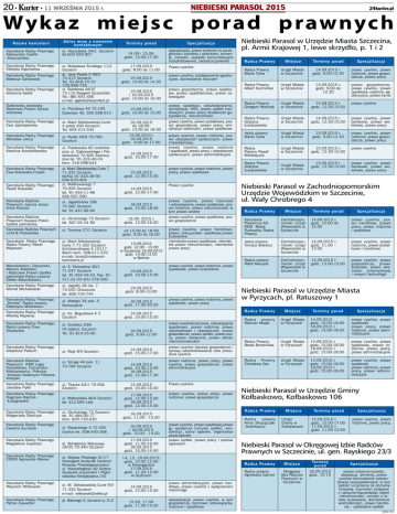 20 • • 11 września 2015 r. Niebieski parasol 2015 24kurier.pl Wykaz miejsc porad prawnych Nazwa kancelarii Adres wraz z numerem kontaktowym Kancelaria Radcy Prawnego Aleksandra Cieślik-Koszczyńska ul. Kaszubska 34/2, Szczecin tel.609 029 807 Kancelaria Radcy Prawnego Elżbieta Dąbrowska ul. Bolesława Śmiałego 11/2 Szczecin al. Jana Pawła II 9A/2 70-415 Szczecin Tel. 91-818-19-10 735-936-735 ul. Skarbowa 4A/1E 73-110 Stargard Szczeciński Tel.: 881-641-456 e-mail: [email protected] Kancelaria Radcy Prawnego Mateusz Galikowski Kancelaria Radcy Prawnego Adrianna Gebel Terminy porad Specjalizacja 14.09 i 15.09. godz. 15.00-17.00 specjalizacja: prawo rodzinne (w szczególności: kontakty z dzieckiem, alimenty, rozwód), wypadki komunikacyjne (odszkodowania, zadośćuczynienie) 17.09.2015 godz. 8.00 do 11.00 15.09.2015 godz. 10.00 do 14.30 15.09.2015 i 16.09.2015 godz. 10.00 do 16.00 Prawo cywilne prawo cywilne, postępowanie egzekucyjne, dochodzenie roszczeń prawo gospodarcze, prawo spadkowe, prawo upadłościowe, prawo zobowiązań ul. Pocztowa 44 72-100 Goleniów Tel. 505-558-014 15.09.2015 godz. 10.00 do 15.00 prawo spadkow, odszkodowania, windykacje, KRS, prawo spółek handlowych, prawo pracy działalność gospodarcza, nieruchomości Kancelaria Radcy Prawnego Ewa Jędrzejewska ul. Marii Skłodowskiej-Curie 4 pokój 200 Szczecin Tel. 604-212-444 16.09.2015 do 18.09. godz. 13.00 do 16.00 prawo cywilne, prawo podatkowe, prawo gospodarcze, prawo pracy, windykacja należności, prawo spadkowe Kancelaria Radcy Prawnego Mirosław Jońca ul. Rydla 45/9 70-783 Szczecin 15.09.2015 i 16.09.2015 godz. 9.00 do 17.00 Kancelaria Radcy Prawnego Karolina Kondzielewska ul. Piastowska 60 (siedziba przy ul. Dąbrowskiego i Piastowskiej) 72-600 Świnoujście tel. 91-322-40-24 kom. 516-098-643 prawo cywilne, prawo rodzinne, prawo ubezpieczeń społecznych, prawo mieszkaniowe, prawo cywilne, prawo rodzinne i spadkowe, prawo pracy i ubezpieczeń społecznych, prawo administracyjne Kancelaria Radcy Prawnego Ewa Kosowska-Czapla ul. Marii Skłodowskiej Curie 7 71-332 Szczecin tel/Fax 91-433-28-90 694-633-404 ul. Małkowskiego 7 70-305 Szczecin tel. 91-434-11-98 692-597-590 Dalkowska Jeżowska Radcowie Prawni Sylwia Jeżowska Kancelaria Radcy Prawnego Paweł Kowalski Kancelaria Radców Prawnych Joanna Jarosz Anna Koziura ul. Jagiellońska 39b 70-382 Szczecin tel. 91-431-06-56 Kancelaria Radców Prawnych Kujawa Piskor Spółka partnerska Kancelaria Radców Prawnych Licht & Przeworska ul. Okulickiego 73 Szczecin tel. 507 05 24 90 Kancelaria Radcy Prawnego Radca Prawny Paweł Majewski ul. Marii SkłodowskiejCurie 7 71-332 Szczecin Schützenstrasse 5 10117 Berlin kom. 508-211-570 e-mail: [email protected] ul. Tuwima 27/1 Szczecin 14.09.2015 godz. 10.00-17.00 15.09.2015 godz. 12.00-15.00 14.09.2015 godz. 12.00-17.00 18.09.2015 godz. 15.00-18.00 15.09. 2015 r. godz. 13.00-16.00 od 14.09 do 18.09 godz. 9.00 do 16.00 15.09.2015 godz. 12.00 - 15.00 w Szczecinie 16.09.2015 godz. 10.00-13.00 w Berlinie Mazurkiewicz, Cieszyński, Mazuro Adwokaci i Radcowie Prawni Spółka partnerska Radca prawny Stefan Mazurkiewicz ul. S. Klonowica 30/1 71-247 Szczecin tel. 91-434-43-23, Fax: 91311-22-53 601-576-500 19.09.2015 godz. 10.00-14.00 Kancelaria Radcy Prawnego Michał Michałowski ul. Jagiełły 28 lok. 7 73-200 Choszczno tel. 606-734-744 19.09.2015 godz. 8.00-13.00 Kancelaria Radcy Prawnego „Temida” Radca prawny Katarzyna Miśkiewicz ul. Matejki 34 pok. 5 Świnoujście 16.09.2015 godz. 17.00-20.00 Kancelaria Radcy Prawnego Mikołaj Napieraj ul. Ks. Bogusława X 3 Szczecin 14.09.2015 godz. 10.00-15.00 Kancelaria Radcy Prawnego, Radca prawny Ewa Olszewska ul. Grodzka 20/6 (III piętro), Szczecin Tel. 91-814-25-00 Kancelaria Radcy Prawnego Arkadiusz Paduch ul. Reja 9/4 Szczecin prawo cywilne, prawo rodzinne, prawo pracy, prawo spadkowe Prawo cywilne prawo cywilne, prawo rzeczowe i zobowiązania, prawo spadkowe, prawo rodzinne, prawo nieruchomości w tym prawo wodne prawo cywilne, prawo spadkowe, prawo gospodarcze prawo cywilne, prawo handlowe, prawo pracy,prawo spadkowe,prawo budowlane niemieckie prawo spadkowe, niemieckie prawo nieruchomości, niemieckie prawo pracy prawo cywilne, prawo rodzinne, prawo spadkowe, prawo budowlane prawo cywilne, prawo rodzinne, prawo spadkowe, prawo pracy 16.09.2015 godz. 9.00-12.00 prawo cywilne(rzeczowe, zobowiązania spadkowe), prawo rodzinne, prawo odszkodowań i ubezpieczeń, prawo gospodarcze, prawo spółek, prawo pracy, prawo medyczne, prawo obrotu nieruchomościami 14.09.2015 godz. 15.00-17.00 prawo cywilne (sprawy gospodarcze i sprawy odszkodowawcze oraz procedura cywilna Kancelaria Radców Prawnych KMK Legis Korszewska, FutrzyńskaMielcarzewicz, Potocka-Korejwo Katarzyna PotockaKorejwo ul. Struga 44 pok. 11 70-784 Szczecin Kancelaria Radcy Prawnego Jarosław Pyfel ul. Tkacka 64/1 70-556 Szczecin 14.09.2015 godz. 10.00-16.00 Prawo cywilne ul. Małopolska 46/4 Szczecin tel. 512-095-166 17.09.2015 godz. 13.00-15.00 18.09.2015 godz. 12.00-14.00 prawo cywilne, prawo pracy, prawo rodzinne, prawo gospodarcze ul. Okulickiego 73 Szczecin tel. 91-484-90-77 kom. 605-730-630 16.09.2015 godz. 11.00 - 13.00 ul. Rapackiego 4 72-300 Gryfice tel. 508-440-268 16.09.2015 i 18.09.2015 godz. 10.00 - 14.00 al. Bohaterów Warszawy 34/35 70-340 Szczecin 17.09.2015 godz. 11.00-16.00 18.09.2015 godz. 10.00-14.00 Kancelaria Radcy Prawnego Dagmara Rajchel-Łodygowska Kancelaria Radcy Prawnego Małgorzata Stańczyk Kancelaria Radcy Prawnego Ewelina Sucholas Kancelaria Radcy Prawnego Magdalena Superson Kancelaria Radcy Prawnego CORVI Agnieszka Warian Kancelaria Radcy Prawnego Wojciech Witkowski Kancelaria Radcy Prawnego Patryk Zawadzki 14.09.2015 godz. 10.00-13.00 16.09.2015 godz. 15.30-17.30 prawo rodzinne, prawo pracy, prawo cywilne, prawo gospodarcze, prawo administracyjne prawo cywilne, prawo spadkowe,prawo go spodarcze (umowy spółki), windykacja, spory sądowe, organizacje pozarządowe prawo spół