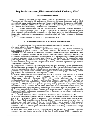 Regulamin konkursu „Mistrzostwa Młodych Kucharzy 2016” § 1 Postanowienia ogólne 1. Organizatorem konkursu, jest MAKRO Cash and Carry Polska S.A. z siedzibą w Warszawie, Al. Krakowska 61, wpisaną do Krajowego Rejestru Sądowego pod nr KRS 0000057355 przez Sąd Rejonowy dla m.st. Warszawy XIII Wydział Gospodarczy, NIP: 522000-28-60, REGON: 012775559 kapitał zakładowy 257 068 680,00 zł, kapitał wpłacony 257 068 680,00 zł zwana dalej Organizatorem, bądź MAKRO. 2. Konkurs adresowany jest do dwuosobowych zespołów uczniów średnich i wyższych szkół gastronomicznych oraz osób pracujących w zawodzie kucharza, którzy w dniu przesłania zgłoszenia nie ukończyli 21. roku życia, zwanymi dalej „Zespołami” oraz Nauczycieli i opiekunów w restauracjach zespołów szkolnych (jeden opiekun do każdego zespołu). 3. Termin Konkursu: 20. marca – 21. października 2016 r. § 2 Warunki Uczestnictwa w Konkursie. Etapy Konkursu 1. Etap I Konkursu. Zgłoszenie udziału w Konkursie - do 30. czerwca 2016 r. Aby wziąć udział w Konkursie Zespół powinien: a) Prawidłowo wypełnić Formularz Zgłoszeniowy dostępny na stronie internetowej www.makro.pl poprzez podanie w nim: imion i nazwisk, dat urodzenia, wieku członków Zespołów oraz ich adresów zamieszkania, telefonów i adresów mailowych, wskazanie szefa Zespołu, w przypadku uczniów nazwy, adresu, telefonu i adresu mailowego do szkoły, w której uczą się członkowie Zespołu, imię i nazwisko oraz numer telefonu do Nauczyciela lub opiekuna zespołu, który wesprze przygotowania do konkursu. W przypadku osób pracujących, należy podać nazwę restauracji, w której pracują członkowie zespołów oraz opiekuna zespołu, który wesprze przygotowania. Wzór Formularza Zgłoszeniowego stanowi załącznik nr 1 do regulaminu; b) Samodzielnie opracować przepis na danie konkursowe w formie ciepłej przystawki lub dania głównego z wykorzystaniem ryb słodkowodnych. Przygotować danie według przepisu i wykonać samodzielnie zdjęcia dania głównego lub przekąski przygotowanych na bazie tych przepisów (zdjęcia wykonane techniką cyfrową powinny mieć następujące parametry: format jpg, wielkość nie większa niż 1025x768 pikseli, 200 Kb). c) Wysłać Organizatorowi na adres pocztowy MAKRO Cash and Carry Polska S.A. Dział PR i Komunikacji Wewnętrznej, Aleja Krakowska 61, 02-183 Warszawa z dopiskiem „Mistrzostwa Młodych Kucharzy 2016” lub pocztą elektroniczną na adres [email protected] - z tytułem „Mistrzostwa Młodych Kucharzy 2016” prawidłowo wypełniony Formularz Zgłoszeniowy i Formularze Przygotowania Przepisu z załączonymi zdjęciami, o których mowa w punkcie powyżej, należy przesłać w nieprzekraczalnym terminie do dnia 30 czerwca 2016 r. (data otrzymania Formularzy przez Organizatora). W przypadku wysyłki na adres pocztowy z dopiskiem „Mistrzostwa Młodych Kucharzy 2016”. d) Poprzez wypełnienie i wysłanie Formularza Zgłoszeniowego i Formularzy Przygotowania Przepisu, Zespół wyraża zgodę na uczestnictwo w Konkursie na warunkach określonych w niniejszym Regulaminie. 2. Etap II Konkursu. Wybór uczestników Półfinałów - do 01 października 2016 r. a) Spośród wszystkich zgłoszeń udziału w Konkursie, spełniających warunki określone w ust. 1, Jury w składzie : Justyna Adamczyk, Paweł Oszczyk, Michał Kuter, Agata Wojda, Michał Bryś, Witek Iwański wybierze Zespoły, których przepisy uznane przez ww. Jury za najciekawsze pod względem ich formy i treści, które wezmą udział w indywidualnej rozmowie. Indywidualne rozmowy zostaną przeprowadzone przez jurorów w dniach 1-30 września 2016 r. O lokalizacjach zakwalifikowane zespoły zostaną poinformowane drogą mailową i telefoniczną. b) Lista Zespołów, które zostaną zakwalifikowane do udziału w Półfinałach zostanie zamieszczona na stronie www.makro.pl do dnia 1 października 2016 r., ponadto ww. 1 Zespoły zostaną powiadomione o zakwalifikowaniu do udziału w Półfinałach: listownie lub telefonicznie lub mailowo, zgodnie z danymi podanymi w Formularzu Zgłoszeniowym. 3. Etap III Konkursu. Półfinał – 20. października 2016 r. a) Półfinał odbędzie w Akademii Efektywnej Przedsiębiorczości Makro w Warszawie przy Al. Jerozolimskich 184, 02-586 Warszawa, w dniu 20. października 2016 r. w godzinach 08:00 – 21.00. b) Wszystkie ekipy są zobowiązane do udziału w odprawie organizacyjnej, która odbędzie się w dniu 19. października 2016 r. o godzinie 18:00 w Akademii Efektywnej Przedsiębiorczości Makro w Warszawie. c) W Półfinale wezmą udział 24 (dwadzieścia cztery) Zespoły, spośród których Jury wyznaczone przez Organizatora wybierze 12 (dwanaście) Zespołów, które zakwalifikują się do Finału Konkursu. d) Organizator zapewni każdemu Zespołowi biorącemu udział w Półfinale Konkursu: wyposażenie stoiska kulinarnego o takim samym standardzie, na które składać się będzie piec konwekcyjno-parowy, płyta indukcyjna dwupalnikowa, stół roboczy z lodówką pod blatem, malakser, maszyna uniwersalna do rozdrabniania, mielenia i mieszania, zlewozmywak jednokomorowy wraz ze stołem odstawczym oraz stół roboczy, taki sam drobny sprzęt potrzebny do wykonania Pracy konkursowej oraz zastawę (talerze). e) Organizator zapewni każdemu Zespołowi biorącemu udział w Półfinale Konkursu: takie same komplety ubrań kucharskich: kitel + zapaska + czapka, po dwa komplety na każdego członka Zespół Uczniów, w których Zespoły Uczniów są zobowiązane występować w trakcie Półfinału i Finału Konkursu, a także podczas Gali, o której mowa w § 2 punkt 4 ustęp c. f) Podczas Półfinału Konkursu każdy Zespół zobowiązany jest przygotować danie konkursowe składające się z dania głównego i deseru („Praca konkursowa”) w liczbie po 6 (sześć) porcji na podstawie przepisu własnego pomysłu przy użyciu produktów z „BLACK BOX”, z którymi zapozna się bez