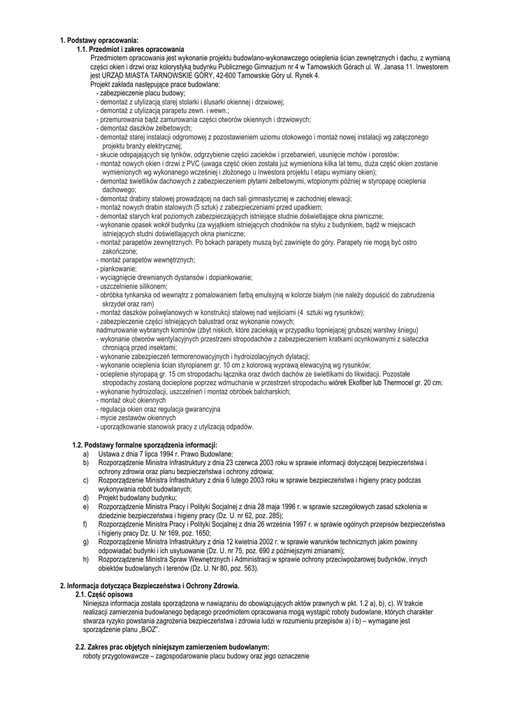 1. Podstawy opracowania: 1.1. Przedmiot i zakres opracowania Przedmiotem opracowania jest wykonanie projektu budowlano-wykonawczego ocieplenia ścian zewnętrznych i dachu, z wymianą części okien i drzwi oraz kolorystyką budynku Publicznego Gimnazjum nr 4 w Tarnowskich Górach ul. W. Janasa 11. Inwestorem jest URZĄD MIASTA TARNOWSKIE GÓRY, 42-600 Tarnowskie Góry ul. Rynek 4. Projekt zakłada następujące prace budowlane: - zabezpieczenie placu budowy; - demontaż z utylizacją starej stolarki i ślusarki okiennej i drzwiowej; - demontaż z utylizacją parapetu zewn. i wewn.; - przemurowania bądź zamurowania części otworów okiennych i drzwiowych; - demontaż daszków żelbetowych; - demontaż starej instalacji odgromowej z pozostawieniem uziomu otokowego i montaż nowej instalacji wg załączonego projektu branży elektrycznej; - skucie odspajających się tynków, odgrzybienie części zacieków i przebarwień, usunięcie mchów i porostów; - montaż nowych okien i drzwi z PVC (uwaga część okien została już wymieniona kilka lat temu, duża część okien zostanie wymienionych wg wykonanego wcześniej i złożonego u Inwestora projektu I etapu wymiany okien); - demontaż świetlików dachowych z zabezpieczeniem płytami żelbetowymi, wtopionymi później w styropapę ocieplenia dachowego; - demontaż drabiny stalowej prowadzącej na dach sali gimnastycznej w zachodniej elewacji; - montaż nowych drabin stalowych (5 sztuk) z zabezpieczeniami przed upadkiem; - demontaż starych krat poziomych zabezpieczających istniejące studnie doświetlające okna piwniczne; - wykonanie opasek wokół budynku (za wyjątkiem istniejących chodników na styku z budynkiem, bądź w miejscach istniejących studni doświetlających okna piwniczne; - montaż parapetów zewnętrznych. Po bokach parapety muszą być zawinięte do góry. Parapety nie mogą być ostro zakończone; - montaż parapetów wewnętrznych; - piankowanie; - wyciągnięcie drewnianych dystansów i dopiankowanie; - uszczelnienie silikonem; - obróbka tynkarska od wewnątrz z pomalowaniem farbą emulsyjną w kolorze białym (nie należy dopuścić do zabrudzenia skrzydeł oraz ram) - montaż daszków poliwęlanowych w konstrukcji stalowej nad wejściami (4 sztuki wg rysunków); - zabezpieczenie części istniejących balustrad oraz wykonanie nowych; nadmurowanie wybranych kominów (zbyt niskich, które zaciekają w przypadku topniejącej grubszej warstwy śniegu) - wykonanie otworów wentylacyjnych przestrzeni stropodachów z zabezpieczeniem kratkami ocynkowanymi z siateczka chroniącą przed insektami; - wykonanie zabezpieczeń termorenowacyjnych i hydroizolacyjnych dylatacji; - wykonanie ocieplenia ścian styropianem gr. 10 cm z kolorową wyprawą elewacyjną wg rysunków; - ocieplenie styropapą gr. 15 cm stropodachu łącznika oraz dwóch dachów ze świetlikami do likwidacji. Pozostałe stropodachy zostaną docieplone poprzez wdmuchanie w przestrzeń stropodachu wiórek Ekofiber lub Thermocel gr. 20 cm; - wykonanie hydroizolacji, uszczelnień i montaż obróbek balcharskich; - montaż okuć okiennych - regulacja okien oraz regulacja gwarancyjna - mycie zestawów okiennych - uporządkowanie stanowisk pracy z utylizacją odpadów. 1.2. Podstawy formalne sporządzenia informacji: a) Ustawa z dnia 7 lipca 1994 r. Prawo Budowlane; b) Rozporządzenie Ministra Infrastruktury z dnia 23 czerwca 2003 roku w sprawie informacji dotyczącej bezpieczeństwa i ochrony zdrowia oraz planu bezpieczeństwa i ochrony zdrowia; c) Rozporządzenie Ministra Infrastruktury z dnia 6 lutego 2003 roku w sprawie bezpieczeństwa i higieny pracy podczas wykonywania robót budowlanych; d) Projekt budowlany budynku; e) Rozporządzenie Ministra Pracy i Polityki Socjalnej z dnia 28 maja 1996 r. w sprawie szczegółowych zasad szkolenia w dziedzinie bezpieczeństwa i higieny pracy (Dz. U. nr 62, poz. 285); f) Rozporządzenie Ministra Pracy i Polityki Socjalnej z dnia 26 września 1997 r. w sprawie ogólnych przepisów bezpieczeństwa i higieny pracy Dz. U. Nr 169, poz. 1650; g) Rozporządzenie Ministra Infrastruktury z dnia 12 kwietnia 2002 r. w sprawie warunków technicznych jakim powinny odpowiadać budynki i ich usytuowanie (Dz. U. nr 75, poz. 690 z późniejszymi zmianami); h) Rozporządzenie Ministra Spraw Wewnętrznych i Administracji w sprawie ochrony przeciwpożarowej budynków, innych obiektów budowlanych i terenów (Dz. U. Nr 80, poz. 563). 2. Informacja dotycząca Bezpieczeństwa i Ochrony Zdrowia. 2.1. Część opisowa Niniejsza informacja została sporządzona w nawiązaniu do obowiązujących aktów prawnych w pkt. 1.2 a), b), c). W trakcie realizacji zamierzenia budowlanego będącego przedmiotem opracowania mogą wystąpić roboty budowlane, których charakter stwarza ryzyko powstania zagrożenia bezpieczeństwa i zdrowia ludzi w rozumieniu przepisów a) i b) – wymagane jest sporządzenie planu „BiOZ”. 2.2. Zakres prac objętych niniejszym zamierzeniem budowlanym: roboty przygotowawcze – zagospodarowanie placu budowy oraz jego oznaczenie roboty demontażowe – demontaż okien i drzwi wg zakresu, demontaż świetlików dachowych, demontaż instalacji odgromowych, demontaż daszkói) żelbetowych nad wejściami, demontaż starych parapetów (wewn. i zewn.), demontaż obróbek blacharskich, demontaż części balustrad stalowych zewnętrznych, demontaż części chodnika przy szkole celem wykonania termo i hydroizolacji ścian fundamentowych, demontaż części czap kominowych. roboty ziemne – wykopy przyścienne celem wykonania termo i hydroizolacji ścian fundamentowych, z wykonaniem opaski wokół budynku, wykonanie małej skarpy przy rampie bez balustrady w narożniku północno-wschodnim szkoły, wykopy celem podłączenia instalacji odgromowych do istniejącego uziomu. roboty betonowe – ułożenie obrzeży na chudym betonie przy opaskach. roboty izolacyjne, malarskie i tynkarskie – wykonanie termomodernizacji budynku,