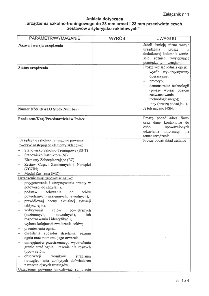 Załącznik nr 1 Ankieta dotycząca „urządzenia szkolno-treningowego do 23 mm armat i 23 mm przeciwlotniczych zestawów artyleryjsko-rakietowych” PARAMETR/WYMAGANIE Nazwa i wersja urządzenia Status urządzenia WYRÓB UWAGI IU Jeżeli istnieją różne wersje urządzenia proszę w dodatkowel kolumnie zamie ścić różnice występujące pomiędzy tymi wersjami. Proszę wpisać jednąz opcji: wyrób wykorzystywany operacyjnie; prototyp; demonstrator technologii (proszę wpisać poziom zaawansowania technologicznego); inny (proszę podać jaki). Jeżeli nadano NSN. — — — — Numer NSN (NATO Stock Number) ProducentlKrajfPrzedstawiciel w Polsce Urządzenie szkolno-treningowe powinny tworzyć następujące elementy składowe: Stanowisko Szkolno-Treningowe (SS-T) Stanowisko Instruktora (SI). Elementy Zabezpieczające (EZ). Zestaw Części Zamiennych i Narzędzi (ZCZiN). Moduł Zasilania (MZ). Urządzenie musi zapewniać naukę: przygotowania i utrzymywania armaty W gotowości do strzelania; podstaw celowania celów do powietrznych (naziemnych, nawodnych); prawidłowej oceny aktualnej sytuacji taktycznej tła; wykrywania celów powietrznych naziemnych, nawodnych), ich ( rozpoznawania i identyfikacji; wyboru kolejności zwalczania celów; przeniesienia ognia; określania sposobu strzelania, reżimu ognia oraz momentu jego otwarcia; umiejętności przestrzennego wyobrażenia granic stref ognia i rażenia dla różnych typów celów; obserwacji strzelania wyników i uwzględniania zdobytych doświadczeń z wcześniejszych treningów. Urządzenie powinno umożliwiać symulację Proszę podać adres firmy oraz dane kontaktowe do upoważnionych osób udzielania informacji na temat urządzenia. Proszę podać skład zestawu — — — — — — — — — — — — — — str. 1 z 4 _________________________ ____________________________ Załącznik nr 1 realnych warunków prowadzenia ognia w różnych sytuacjach taktycznych. Stanowisko Szkolno-Treningowe (SS-T) w postaci: - - Proszę podać skład oferowanego stanowiska podwozia 23 mm zestawu artyleryjskorakietowego ZUR-23-2KG wraz z mechanizmami napędowymi i układami naprowadzania, dołączonych makiet gabarytowo-masowych magazynów amunicji, w tym rakiet, ekwiwalentu masowego i gabarytowego automatów 2A14, luf i stołu startowego GROM, - monitora kolorowego o rozmiarach zapewniających zobrazowanie celownika i sytuacji taktycznej minimum trzykrotnie większej niż obraz widziany przez wyświetlany celownik, zamontowany w miejsce rzeczywistego celownika, układu imitacji blysku wystrzałów z luf podczas prowadzenia ognia artyleryjskiego zsynchronizowany ze spustem, - układu symulującego przeładowanie automatów oraz zachowanie się armaty podczas strzelania, układu zliczającego wystrzały i umożliwiającego strzelanie w przypadku wykorzystania całej amunicji do momentu ponownego załadowania, układu imitacji akustycznej. - 51 powinny tworzyć następujące elementy składowe: zestaw komputerowy instruktora z drukarką - dedykowane oprogramowanie. Elementy zabezpieczające powinny tworzyć następujące elementy składowe: zestaw nagłaśniający; - - - - - wymagane okablowanie odpowiednimi z adapterami; zasilanie awaryjne akumulatorów; w urządzenia postaci baterii indywidualne opakowania transportowe dla poszczególnych elementów składowych urządzenia. Zestaw Części Zamiennych i Narzędzi ZCZiN) oraz podstawowych materiałów eksploatacyjnych zawierający środki wystarczające do prowadzenia obsługi technicznej i konserwacji, przynajmniej str. 2 z 4 ________________________ _________________________ __________________________ _________________ Załącznik nr 1 w okresie 24-miesięcznego okresu gwarancji Dokumentacja Techniczna (DT) w składzie dokumentacja eksploatacyjna; dokumentacja konstrukcyjna; plansze, schematy połączeii poszczególnych elementów -_ukompletowanie_ZCZiN Moduł zasilania powinien mieć możliwość współpracy z zewnętrzną przemysłową siecią energetyczną lub siecią polową o napięciu przemiennym 230V, częstotliwości 50 Hz. Zestaw komputerowy powinien być kompatybilny z PC. Licencja na oprogramowanie powinna pozwalać na instalowanie go na innym PC, w przypadku pogwarancyjnej wymiany komputera na komputer kompatybilny z zastosowanym w_urządzeniu. Parametry (poszczególne zdolności i ich charakterystyki) wymagane dla przyszłego - - - UiSW urządzenie powinno zapewniać tożsame parametry pracy zasadniczych elementów funkcjonalnych armat bojowych, a w szczególności: • elektrycznych i ręcznych napędów w azymucie i kącie podniesienia; • zaimplementowanych w dedyko wanym oprogramowaniu typów celowników; • symulację realnego zagrożenia obsługi (w przypadku zbyt późnego wykrycia lub złej decyzji kolejności o zwalczania celów wyeliminowanie obsługi- efekty wizualne dowolne); -zestaw nagłaśniający powinien umożliwiać generowanie dźwięków pola walki. symulowane strzelania rakietowe powinny sygnalizować przechwycenie sygnału termicznego przez rakietę. dołączane makiety magazynków amunicji powinny mieć możliwość imitowania różnych stanów ich załadowania. urządzenie powinno zapewniać ergonomię pracy poszczególnych osób funkcyjnych obsługi armaty na podobnym poziomie jak w realnych działaniach z wykorzystaniem 23 mm ZU/ZUR. Stanowisko pracy instruktora powinno zapewniać: projektowanie zadań bojowych; przenoszenie zadań bojowych na inne urządzenia szkolno- treningowe; archiwizowanie wyników szkolenia; — — — — — — — — — str. 3 z 4 Załcznik nr 1 przenoszenie zarchiwizowanych danych; drukowanie wyników szkolenia; stabelaryzowany podgląd informacji 0: • ilości dostępnej amunicji, w tym rakiet; • ilości celów; • przynależności celów; • odległości celów od szkolnego stanowiska ogniowego podczas odbywania ćwiczeń na urządzeniu. — — — w urządzeniu powinny być zastosowane rozwiązania zapewni