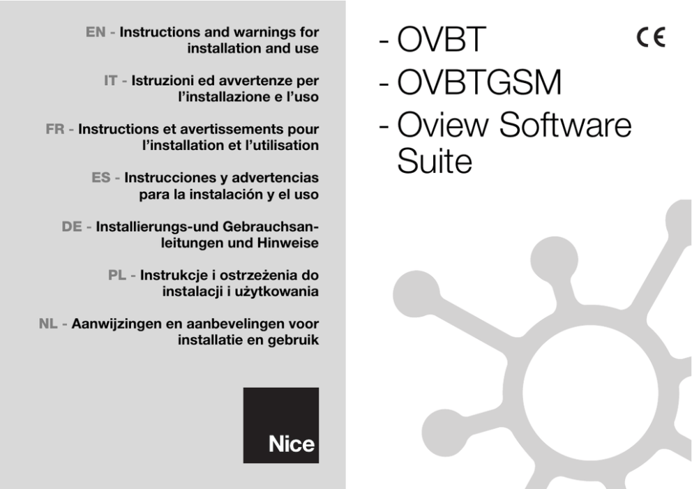 EN - Instructions and warnings for installation and use IT - Istruzioni ed avvertenze per l’installazione e l’uso FR - Instructions et avertissements pour l’installation et l’utilisation ES - Instrucciones y advertencias para la instalación y el uso DE - Installierungs-und Gebrauchsanleitungen und Hinweise PL - Instrukcje i ostrzeżenia do instalacji i użytkowania NL - Aanwijzingen en aanbevelingen voor installatie en gebruik - OVBT - OVBTGSM - Oview Software Suite INFORMACJE O ZNAKACH FIRMOWYCH Znaki AMD®, INTEL®, BLUETOOTH®, GPRS®, GSM®, WINDOWS®, MICROSOFT®, są zarejestrowanymi przez odpowiednich właścicieli znakami towarowymi; nazwy produktów stosowane w niniejszej instrukcji mogą być również zarejestrowane przez ich właścicieli. LICENCJA NA UŻYWANIE OPROGRAMOWANIA Programy “Oview Software Desktop” i “Oview Software Mobile” są chronione prawem autorskim i prawem własności intelektualnej; te oprogramowania nie są sprzedawane ale udostępniane na nie wyłącznej licencji na ich używanie. Firma Nice s.p.a. pozostaje właścicielem tej kopii programu. Programy “Oview Software Desktop” i “Oview Software Mobile” są udostępniane na licencji razem z urządzeniami “OVBT”, “OVBTGSM” oraz “Oview” jako jeden produkt, wyprodukowany przez firmę Nice. Te oprogramowania są dostarczane bez gwarancji dotyczących trybu użytkowania i bezpieczeństwa. Firma Nice s.p.a. nie jest ponadto odpowiedzialna za szkody bezpośrednie i pośrednie, włącznie ze szkodami za straty w zyskach, przerwy w pracy i tym podobne, wynikające z nieprawidłowej obsługi niniejszego oprogramowania. OGÓLNE WARUNKI DOTYCZĄCE OBSŁUGI MODUŁU OVBTGSM • Opis funkcji i usług dostępnych z zastosowaniem modułu OVBTGSM Sterowanie automatyką z telefonu: Ta funkcja umożliwia wysyłanie do automatyki polecenia “otwieranie” poprzez zwykłe połączenie telefoniczne, nawiązywane z autoryzowanego numeru. Są przez nią wykorzystywane zwykłe usługi “głosowe” oddane do dyspozycji przez operatora telefonicznego, jedynym wymogiem jest posiadanie numeru telefonicznego, z którego nawiązywane jest połączenie. Zwykle usługa ta nie jest obciążana żadnymi opłatami przez operatora telefonicznego, ponieważ moduł OVBTGSM nie odpowiada na połączenie. Sterowanie automatyką za pomocą wiadomości SMS: Ta funkcja umożliwia wysyłanie do automatyki określonych poleceń za pomocą wiadomości SMS. Jeżeli to konieczne, po odebraniu wiadomości SMS moduł OVBTGSM może wysłać w odpowiedzi własny SMS. Funkcja ta wykorzystuje usługę umożliwiającą wysyłanie wiadomości SMS, oddaną do dyspozycji przez operatora telefonicznego. Koszty wysyłania wiadomości SMS są zależne od taryfy stosowanej przez danego operatora telefonicznego. Połączenie zdalne i teleserwis: Ta funkcja służy do nawiązywania połączenia pomiędzy modułem OVBTGSM i oprogramowaniem “Nice Oview Software Suite” w celu umożliwienia automatyce wykonywania operacji teleserwisu. Wykorzystuje ona połączenie GPRS oddane do dyspozycji przez zarządzających i operatorów usług telefonii komórkowej oraz sieci internetowej. Koszty przesyłania danych z zastosowaniem technologii GPRS oraz koszty połączenia internetowego są ustalane przez odpowiednich operatorów internetowych i telefonicznych, w zależności od obowiązującej taryfy. Nice nie obciąża żadnymi kosztami za wszystkie opisane usługi i nie pobiera również żadnej opłaty od zarządzających i operatorów telefonicznych. • Klauzule wyłączenia odpowiedzialności Wszystkie funkcje opisane w poprzednim paragrafie są wykonywane z wykorzystaniem, całkowitym lub częściowym, technologii, infrastruktur oraz usług oddanych do dyspozycji przez operatorów trzecich w stosunku do firmy Nice. Aby uaktywnić te usługi należy podpisać odpowiednie umowy z ich dostawcami, na przykład podczas dokonywania zakupu i uaktywniania karty SIM. Jedynie dla funkcji “zdalne połączenie i teleserwis” Nice dostarcza, poprzez zastosowanie własnych serwerów, część usług, które są niezbędne dla nawiązania połączenia pomiędzy modułem OVBTGSM i oprogramowaniem “Nice Oview Software Suite”. Następuje ono poprzez sieć internetową, wykorzystując połączenie GPRS oferowane przez zarządzających usługami telefonii komórkowej. Z tych powodów Nice wyklucza wszelką odpowiedzialność dotyczącą funkcji oferowanych przez moduł OVBTGSM, a w szczególności: – Użytkownik modułu OVBTGSM jest zobowiązany do dokładnego zapoznania się z niniejszymi “Ogólnymi warunkami dotyczącymi obsługi modułu OVBTGSM” przed jego użyciem oraz do wykorzystywania usług oferowanych przez Nice S.p.a. Wykorzystywanie lub uaktywnianie usług odpowiada jednoznacznemu zaakceptowaniu wszystkich warunków. – Nice sprzedaje moduł OVBTGSM i oferuje użytkownikowi własne usługi w oparciu o niniejsze ogólne warunki dotyczące obsługi modułu OVBTGSM; stanowią one zobowiązującą umowę pomiędzy firmą Nice i użytkownikiem. Nice zastrzega sobie prawo do wprowadzenia zmian w każdej chwili do Polski – 1 PL POLSKI PL “Ogólnych warunków dotyczących obsługi modułu OVBTGSM”. – Użytkownik uwzględnia, że usługi oferowane przez firmę Nice są dostarczane bezpłatnie, a w związku z tym przyjmuje i akceptuje usługi “W TEJ POSTACI” oraz “W POSTACI DOSTĘPNEJ” i w związku z tym Nice nie ponosi żadnej odpowiedzialności za ich używanie i dostępność. – Nice zastrzega sobie prawo do modyfikowania lub dezaktywowania w każdej chwili, czasowego lub stałego, usług oddawanych przez siebie do dyspozycji, również bez powiadomienia użytkownika. Przyjmuje on do wiadomości i akceptuje, że Nice nie może w żaden sposób ponosić odpowiedzialności w stosunku do użytkownika lub podmiotów trzecich za modyfikację, zawieszenie lub dezaktywację tych usług. – Użytkownik uwzględnia, że Nice mo