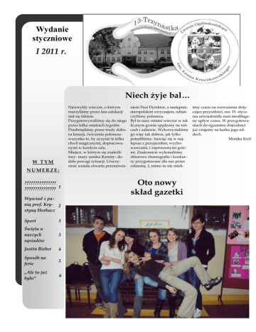 Wydanie styczniowe I 2011 r. Niech żyje bal… Niezwykły wieczór, o którym marzyliśmy przez lata edukacji stał się faktem. Przygotowywaliśmy się do niego przez kilka ostatnich tygodni. Przebrnęliśmy przez trudy doboru kreacji, ćwiczenia polonezawszystko to, by uczynić te kilka chwil magicznymi, dopracowanymi w każdym calu. Miejsce, w którym się znaleźliśmy- mury zamku Karnity- dodało powagi sytuacji. Uroczystość została otwarta przemówie- W TYM niem Pani Dyrektor, a następnie, staropolskim zwyczajem, odtańczyliśmy poloneza. Był to nasz ostatni wieczór w tak licznym gronie spędzony na tańcach i zabawie. Wykorzystaliśmy go więc tak dobrze, jak tylko potrafiliśmy- bawiąc się w najlepsze z przyjaciółmi, wychowawcami, i zaproszonymi gośćmi. Znakomicie wykonaliśmy zbiorowe choreografie i konkursy przygotowane dla nas przez orkiestrę. I, mimo że nie mieli- NUMERZE: ??????????????? ??????????????? 1 Wywiad z panią prof. Kry- 2 styną Horbacz Sport 3 Święta u naszych sąsiadów 3 Justin Bieber 4 Sposób na ferie 5 „Ale to już było” 6 Oto nowy skład gazetki śmy czasu na rozważania dotyczące przyszłości, noc 15. stycznia uświadomiła nam nieubłagany upływ czasu. W przygotowaniach do egzaminu dojrzałości już czujemy na karku jego oddech. Monika Król STR. 2 GAZETKA TRZYNASTKA Wywiad z Panią Profesor Krystyną Horbacz Czy od zawsze wiedziała Pani, że będzie nauczycielem? Rozczaruje was, ale nie. Zadecydowały względy praktyczne. P prostu-ponad 20 lat temu było wiele wolnych etatów w szkolnictwie, więc… Co sprawiło, że zainteresowała się Pani teatrem? Zawdzięczam to mojej polonistce z liceum, która zabierała nas do teatru i zaraziła duszą Melpomeny. Potem napisałam pracę magisterskąmonografię nt. historii Teatru im. J. Osterwy w Gorzowie Wlkp. Ukończyłam też roczne Studium Teatralne w Olsztynie, wiele kursów teatralnych. Teraz realizuję te zainteresowania i z dziećmi, i z młodzieżą, a nawet ze studentami Uniwersytetu III. Wieku. Lubi Pani pracować z uczniami? Lepiej współpracuję się z nimi czy z członkami Uniwersytetu III. Wieku? Macie zapewne na myśli prace w zajęciach teatralnych? Sprawia mi ogromną przyjemność praca i z młodzieżą, i z osobami starszymi, dlatego że na te zajęcia przychodzą osoby chętne, czyli takie, które dobrowolnie chcą się pobawić w teatr. No, może starsze osoby mają więcej czasu, nie są ograniczone klasówkami, meczami, dodatkowymi zajęciami etc. W jaki sposób spędza Pani wolny czas? Ja nie mam wolnego czasu. Jeśli pytacie natomiast, czym się relaksuję, to z pewnością lubię np. poeksperymentować w kuchni, poczytać książkę (ale pozycję poleconą). Znajduję przyjemność również w podróżowaniu i spędzaniu czasu w wąskim gronie znajomych. Co by Pani zabrała na bezludna wyspę i dlaczego? Odpowiem kogo, a nie co. Ludzi. Zaludniłabym tę wyspę i nie byłaby już bezludna. Jaka byłaby Pani reakcja, gdyby podczas lekcji wybuchła III wojna światowa? Chyba taka, jak podczas próbnych alarmów. Zastanawiałabym się, ile razy dzwonił dzwonek i czy jest to alarm właściwy? A późniejsze reakcje? Nie biorę takiej możliwości pod uwagę… Ma Pani ulubione zdanie, sentencję? ,,Nil admirari” Horacego, czyli ,,nic mnie nie zadziwi”. Czy ma Pani niespełnione marzenia z dzieciństwa? Jak każdy. Ale nie powiem jakie, bo są z dzieciństwa, więc baaardzo infantylne. Czy nie jest nudno co roku uczyć tego samego? Nigdy nie jest to samo, bo zawsze są inni uczniowie. Nawet, jeśli omawiam ten sam utwór w dwóch klasach, to zawsze są inne spostrzeżenia, wnioski, argumentacje. Czasami aż trudno przewidzieć, więc- NIL ADMIRARI. Jak to jest pracować z mężem w jednej szkole? Trzeba robić to, co należy do zakresu moich obowiązków i tyle. Jestem takim samym nauczycielempodwładnym jak każdy, a mój mąż w pracy jest moim zwierzchnikiem. Jak Pani robi, że posiada Pani więcej energii niż niejeden uczeń? Wyznaję zasadę, że chcieć to móc. Dużo mogę, bo mi się chce. Skąd zna Pani tyle cytatów? Zaskakujące jest to, że prawie na każdej lekcji cytuje Pani fragmenty z pamięci. Tak naprawdę znam tylko jeden długi utwór na pamięć i za każdym razem odtwarzam inna zwrotkę, a uczniom się wydaje, że ciągle jest to coś nowego. A. Urban, T. Zmaczyńska STR. 3 GAZETKA TRZYNASTKA „Gdy sie Chrystus rodzi” Dnia 20 grudnia 2010 r. w naszej liceum odbyło się przedstawienie pt. „Święta u naszych sąsiadów”. Na trzech kolejnych godzinach lekcyjnych, uczniowie naszej szkoły mieli okazję zapoznać się z tradycjami bożonarodzeniowymi Rosjan oraz Niemców. W trakcie występu nasi szkolni koledzy mieli również okazję wysłuchać kolęd i utworów, które goszczą w domach sąsiadów Polski. Uczniom podobało się to, iż przedstawienie nie ograniczało się do nudnych recytacji. Mogli dowiedzieć się między innymi tego, że w Rosji święta obchodzi się dopiero 7 stycznia, a także, że to Nowy Rok świętowany jest uroczyściej. Na stołach w Niemczech, w przeciwieństwie do Polski, królują natomiast pieczeń i kiełbaski. Na uroczystość zaproszeni zostali goście z Uniwersytetu Warmińsko-Mazurskiego, z Uniwersytetu w Kaliningradzie oraz lokalna telewizja. Każdy z zainteresowaniem oglądał występ. Wielu śpiewało kolędy wspólnie z występującymi. Wszyscy wspólnie zgodzili się, że w następnych latach, przedstawienie trzeba razu nie czując znużenia. Aktorzy, którozszerzyć o tradycje Francuzów i rzy według mnie bardzo dobrze wczuli Brytyjczyków. Monika Pawlukiewicz się w swoje role (w pamięci utkwiła mi szczególnie postać Heroda, jego żony Święta, święta i po świętach-jak mówi oraz dwóch diabłów), oprócz poważnasze stare, polskie powiedzenie. Tyle nych kwestii zmuszających niekiedy do oczekiwań, tyle przygotowań, a nawet refleksji, zaserwowali nam również kilka nie sp