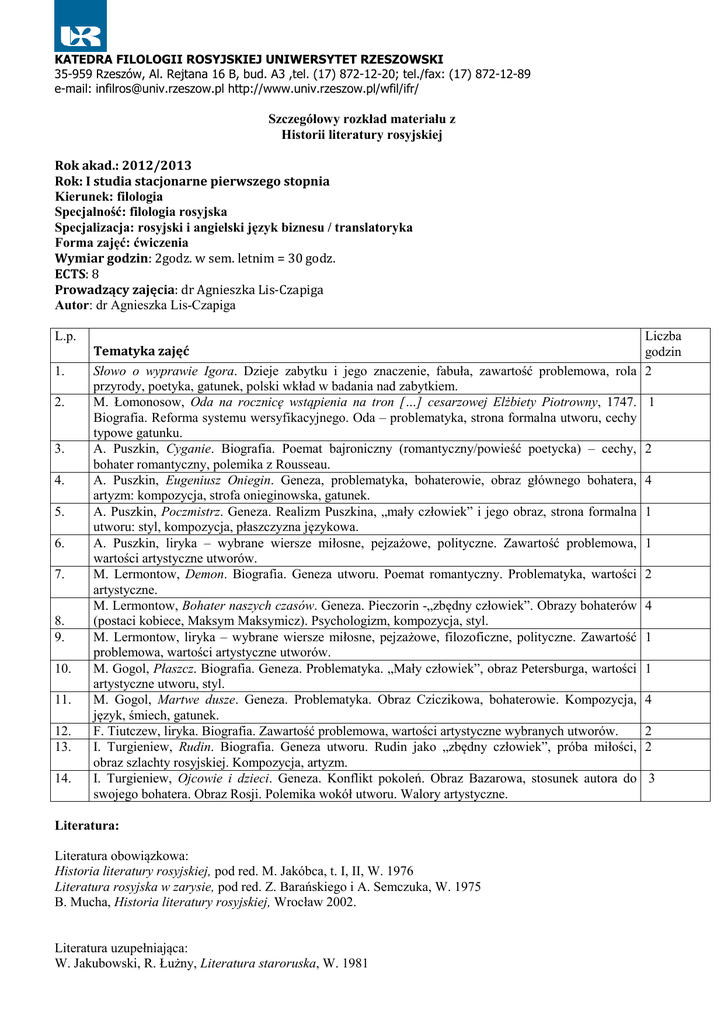 Szczegółowy rozkład materiału z Historii literatury rosyjskiej Rok akad.