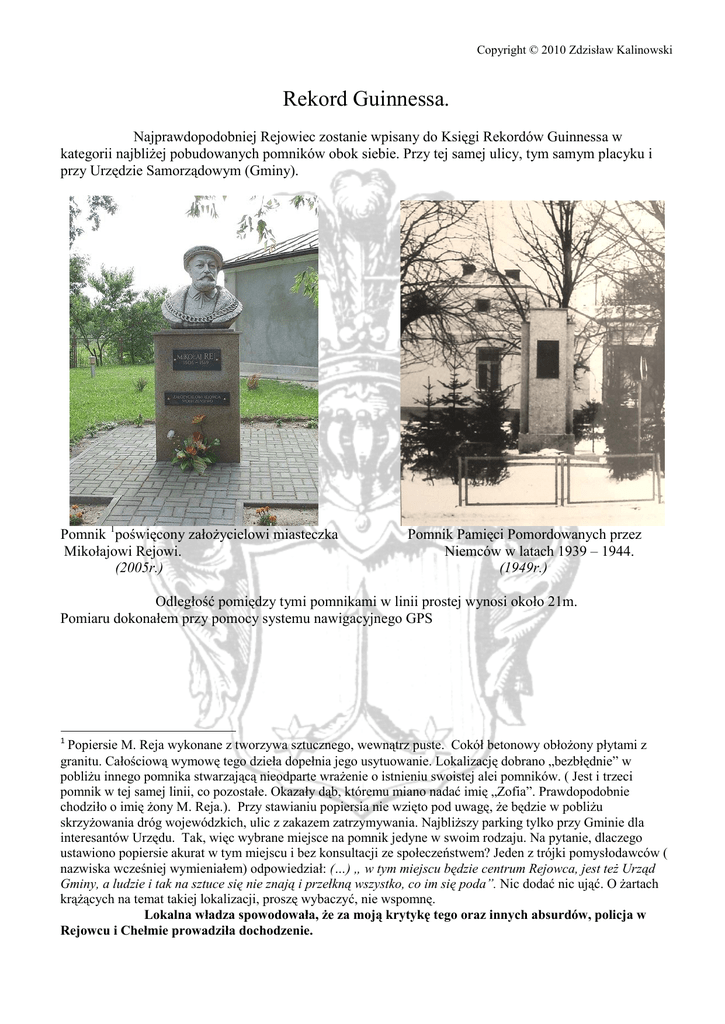 Copyright © 2010 Zdzisław Kalinowski Rekord Guinnessa. Najprawdopodobniej Rejowiec zostanie wpisany do Księgi Rekordów Guinnessa w kategorii najbliżej pobudowanych pomników obok siebie. Przy tej samej ulicy, tym samym placyku i przy Urzędzie Samorządowym (Gminy). Pomnik 1poświęcony założycielowi miasteczka Mikołajowi Rejowi. (2005r.) Pomnik Pamięci Pomordowanych przez Niemców w latach 1939 – 1944. (1949r.) Odległość pomiędzy tymi pomnikami w linii prostej wynosi około 21m. Pomiaru dokonałem przy pomocy systemu nawigacyjnego GPS 1 Popiersie M. Reja wykonane z tworzywa sztucznego, wewnątrz puste. Cokół betonowy obłożony płytami z granitu. Całościową wymowę tego dzieła dopełnia jego usytuowanie. Lokalizację dobrano „bezbłędnie” w pobliżu innego pomnika stwarzającą nieodparte wrażenie o istnieniu swoistej alei pomników. ( Jest i trzeci pomnik w tej samej linii, co pozostałe. Okazały dąb, któremu miano nadać imię „Zofia”. Prawdopodobnie chodziło o imię żony M. Reja.). Przy stawianiu popiersia nie wzięto pod uwagę, że będzie w pobliżu skrzyżowania dróg wojewódzkich, ulic z zakazem zatrzymywania. Najbliższy parking tylko przy Gminie dla interesantów Urzędu. Tak, więc wybrane miejsce na pomnik jedyne w swoim rodzaju. Na pytanie, dlaczego ustawiono popiersie akurat w tym miejscu i bez konsultacji ze społeczeństwem? Jeden z trójki pomysłodawców ( nazwiska wcześniej wymieniałem) odpowiedział: (…) „ w tym miejscu będzie centrum Rejowca, jest też Urząd Gminy, a ludzie i tak na sztuce się nie znają i przełkną wszystko, co im się poda”. Nic dodać nic ująć. O żartach krążących na temat takiej lokalizacji, proszę wybaczyć, nie wspomnę. Lokalna władza spowodowała, że za moją krytykę tego oraz innych absurdów, policja w Rejowcu i Chełmie prowadziła dochodzenie.