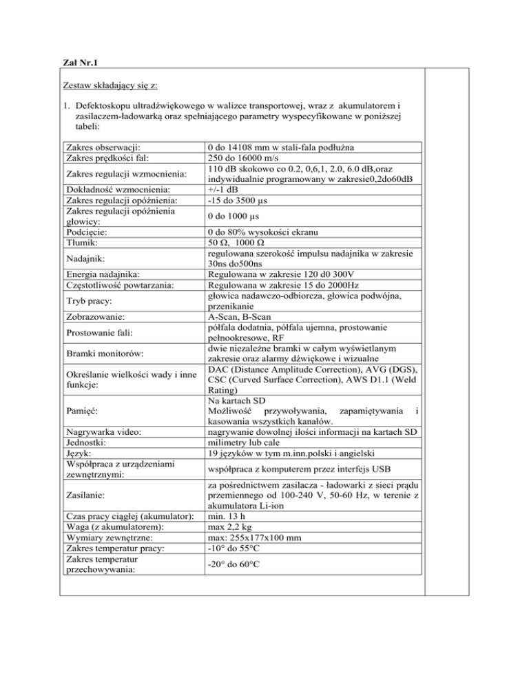 Zał Nr.1 Zestaw składający się z: 1. Defektoskopu ultradźwiękowego