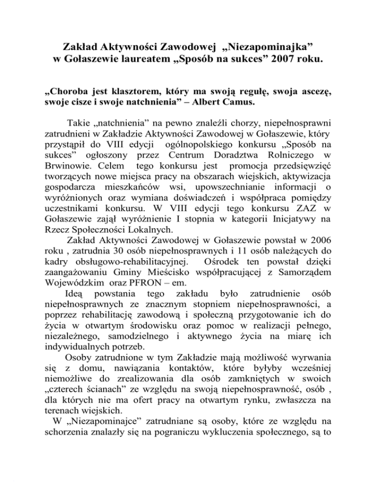 Zakład Aktywności Zawodowej „Niezapominajka” w Gołaszewie laureatem „Sposób na sukces” 2007 roku. „Choroba jest klasztorem, który ma swoją regułę, swoja ascezę, swoje cisze i swoje natchnienia” – Albert Camus. Takie „natchnienia” na pewno znaleźli chorzy, niepełnosprawni zatrudnieni w Zakładzie Aktywności Zawodowej w Gołaszewie, który przystąpił do VIII edycji ogólnopolskiego konkursu „Sposób na sukces” ogłoszony przez Centrum Doradztwa Rolniczego w Brwinowie. Celem tego konkursu jest promocja przedsięwzięć tworzących nowe miejsca pracy na obszarach wiejskich, aktywizacja gospodarcza mieszkańców wsi, upowszechnianie informacji o wyróżnionych oraz wymiana doświadczeń i współpraca pomiędzy uczestnikami konkursu. W VIII edycji tego konkursu ZAZ w Gołaszewie zajął wyróżnienie I stopnia w kategorii Inicjatywy na Rzecz Społeczności Lokalnych. Zakład Aktywności Zawodowej w Gołaszewie powstał w 2006 roku , zatrudnia 30 osób niepełnosprawnych i 11 osób należących do kadry obsługowo-rehabilitacyjnej. Ośrodek ten powstał dzięki zaangażowaniu Gminy Mieścisko współpracującej z Samorządem Wojewódzkim oraz PFRON – em. Ideą powstania tego zakładu było zatrudnienie osób niepełnosprawnych ze znacznym stopniem niepełnosprawności, a poprzez rehabilitację zawodową i społeczną przygotowanie ich do życia w otwartym środowisku oraz pomoc w realizacji pełnego, niezależnego, samodzielnego i aktywnego życia na miarę ich indywidualnych potrzeb. Osoby zatrudnione w tym Zakładzie mają możliwość wyrwania się z domu, nawiązania kontaktów, które byłyby wcześniej niemożliwe do zrealizowania dla osób zamkniętych w swoich „czterech ścianach” ze względu na swoją niepełnosprawność, osób , dla których nie ma ofert pracy na otwartym rynku, zwłaszcza na terenach wiejskich. W „Niezapominajce” zatrudniane są osoby, które ze względu na schorzenia znalazły się na pograniczu wykluczenia społecznego, są to osoby ze schorzeniami narządu ruchu, upośledzeniem umysłowym, chorobą psychiczną, epilepsją oraz niewidomi. W Zakładzie Aktywności Zawodowej w Gołaszewie utworzono trzy działy usługowo-produkcyjne: 1.Dział ogrodniczo-porządkowy zajmujący się utrzymaniem terenów zielonych na obszarze Gminy Mieścisko, świadczeniem usług transportowych, uprawą warzyw, kwiatów i roślin ozdobnych, hodowlą dżdżownicy kalifornijskiej dla własnych potrzeb, utrzymaniem ciągów pieszych w sezonie zimowym. 2. Dział krawiecko-pamiątkarski – sekcja krawiecka prowadzi działalność wytwórczą w postaci szycia kompletów pościeli, podkładów medycznych, toreb lnianych z możliwością nadruku reklamowego itp. Sekcja pamiątkarska natomiast przygotowuje kartki okolicznościowe, torebki papierowe, pudełka i wieńce ozdobne. 3. Dział niszczenia dokumentów zajmuje się niszczeniem dokumentów z instytucji państwowych oraz firm prywatnych. Zakład w Gołaszewie powołany został nie tylko do prowadzenia działalności gospodarczej, jest to także miejsce do organizowania różnorodnych form rehabilitacji takich jak: - rehabilitacja lecznicza w ramach, której przeprowadza się elektroterapię, laseroterapię, krioterapię, terapię lampą „Sollux”, kąpiele wirowe, kinezyterapię, masaż klasyczny i leczniczy oraz ćwiczenia ogólnousprawniające, - rehabilitacja społeczno-zawodowa dostosowana jest do potrzeb poszczególnych pracowników uwzględniając posiadane umiejętności i indywidualne predyspozycje. Każda z zatrudnionych osób niepełnosprawnych ma opracowany indywidualny program rehabilitacji leczniczej, zawodowej i społecznej z uwzględnieniem zakresu przewidywanej poprawy, indywidualnych predyspozycji psychofizycznych, zaradności i funkcjonowania w zbiorowości. Pracownicy biorą udział w turnusach rehabilitacyjnych, różnych formach kulturalnych skierowanych do osób niepełnosprawnych, imprezach sportowych oraz spotkaniach integracyjnych. Przykładem takiego spotkania może być udział w spotkaniu integracyjnym między pracownikami zakładów aktywności zawodowej z Wielkopolski oraz beneficjentami podobnych placówek z Dolnej Saksonii. Zakład Aktywności Zawodowej podjął współpracę z Powiatowym Urzędem Pracy w Wągrowcu w zakresie organizacji prac interwencyjnych, przygotowania zawodowego oraz staży absolwenckich. Osoby korzystające z tych form przeciwdziałania bezrobociu oprócz zdobywania kwalifikacji zawodowych m.in. w zakresie takich zawodów jak: krawiec, ogrodnik, fizjoterapeuta, czy pracownik biurowy, zyskują cenne doświadczenie życiowe i pogłębiają wrażliwość na problemy osób niepełnosprawnych. Wyraźną zasługą powstania ZAZ jest zmiana mentalności mieszkańców Gołaszewa i gminy Mieścisko w sposobie podejścia do problemu niepełnosprawności .Trudno przecież zrozumieć dogłębnie ten problem osobom, które na co dzień nie spotykają się z niepełnosprawnością, osobom, które są zdrowe. Zetknięcie się z tą kwestią, ukazanie pozytywnych rozwiązań problemu, bez zbędnego teoretyzowania, uczy wrażliwości i tolerancji a o to przecież chodzi – by ludzie zauważali na co dzień w sposób pozytywny tych , którzy sami o swoje sprawy się nie upomną . Zespół Doradczy w powiecie wągrowieckim – Beata Mączyńska .