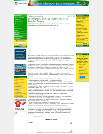Aktualno ści: Aktualności: wszystkie 2009 -07-30 - biura podr óży - hotelarze - przewoźnicy - gastronomia Newslettery Są pieniądze na promocję turystyki biznesowej Gdańska i Pomorza Gdańska Organizacja Turystyczna otrzyma ła fundusze unijne na kampanię promocyjn ą turystyki biznesowej Gdańska i Pomorza. Forum r e k l a m a Ogłoszenia Humor Reklama Kontakt Bilety lotnicze Wycieczki Wyszukiwarka Szukaj Aktualno ści Majorka: wybuch ła bomba w pobliżu plaży. Są utrudnienia dla turystów 1100 zł kary za klauzule niedozwoloną? Są pieniądze na promocję turystyki biznesowej Gda ńska i Pomorza TripAdvisor: wykaz najbardziej niehigienicznych atrakcji turystycznych świata MSZ ostrzega podróżujących przed grypą A/H1N1 więcej » Polecamy Polecamy Ankieta W dniu 30 lipca 2009 r. odby ło się uroczyste podpisanie umowy o dofinansowanie projektu. Pieni ądze pochodz ą z Regionalnego Programu Operacyjnego dla Województwa Pomorskiego na lata 2007-2013 (RPO WP), O ś priorytetowa 6 Turystyka i dziedzictwo kulturowe, działanie 6.2 - Promocja i informacja turystyczna. Przedmiotem projektu "Promocja turystyki biznesowej jako markowego produktu Gdańska i Pomorza" jest kompleksowa kampania promocyjna turystyki biznesowej na krajowym i zagranicznym rynku turystycznym. Jej efektem ma by ć wzmocnienie marki i wizerunku Gda ńska i Pomorza jako celu turystyki biznesowej. Jakie oferty wyjazd ów letnich najcz ęściej wybieraj ą klienci Twojego biura w tym roku? j wakacje w k l m n Polsce j tańsze wakacje k l m n za granicą Ca łkowita wartość projektu to 2 958 393,00 zł. Wysoko ść dofinansowania z funduszy unijnych - 2 082 820,00 zł. Projekt planowany jest na 3 lata - do końca 2011 roku. Ogłoszenia » Last minute do branży » Last minute dla turystów » Dla turystów » Promocje » Szukam partnera » Kupię » Sprzedam » Wynajmę » Oddam w wynajem » Dam prac ę » Szukam pracy W ramach projektu realizowane b ędą następujące dzia łania: - wykonanie portalu informacyjnego o turystyce biznesowej, - opracowanie materia łów promocyjnych - katalogu obiektów konferencyjnych, folderu, filmu reklamowego i prezentacji multimedialnej oraz innych materiałów promocyjnych, - przeprowadzenie bada ń dotyczących dynamiki turystyki biznesowej w regionie pomorskim w latach 2009 - 2011, - udział w międzynarodowych targach turystyki biznesowej (m. in. we Frankfurcie IMEX, w Barcelonie EIBTM, w Brukseli EMIF oraz Londynie CONFEX) oraz zakup stoiska targowego, - organizacja cyklu podr óży studyjnych dla bran żowych dziennikarzy zagranicznych i biur podr óży, - promocja oferty regionu w mi ędzynarodowej prasie (CIM, CAT Publications, wydawnictwa targowe, Bedouk, MICE Poland) i Internecie, - organizacja cyklu szkole ń dla branży turystycznej pt. "Tr ójmiejska Akademia Organizatora Spotka ń Biznesowych", - utworzenie i promocja produktów turystyki biznesowej - udział w międzynarodowych sieciach wsp ółpracy - ICCA (International Congress & Convention Association) i MPI (Meeting Professionals International). Podmiotem odpowiedzialnym za realizacj ę przedsi ęwzięcia jest wyodrębniona komórka GOT - Gdańsk Convention Bureau, kt óra zgodnie z porozumieniem zawartym między GOT a Pomorsk ą Regionalną Organizacj ą Turystyczn ą, jako jedyna zajmuje si ę promocją Gdańska i ca łego Pomorza w sferze turystyki biznesowej. wersja do druku Skomentuj tekst: Tre ść: (kiedy jest to mo żliwe, sugerujemy podpisanie si ę imieniem, nazwiskiem i j droższe wyjazdy k l m n w odległe części świata Głosuj Zobacz wyniki firm ą, aby unikn ąć pos ądze ń o anonimowe oczernianie konkurencji) Opcjonalny e-mail: (podaj je ś li chcesz by ć powiadamiany o nowych wypowiedziach w tym wątku, Tw ój e - mail nie jest ujawniany publicznie, ani nikomu udost ępniany) Tagi: promocja turystyki biznesowej Gda ńska Pomorza turystyka biznesowa w gda ńsku Dział gastronomia: Są pieniądze na promocj ę turystyki biznesowej Gda ńska i Pomorza POT zostanie zlikwidowana? Warszawa: restauratorzy obs ługują tylko klientów, którzy kupuj ą więcej? British Airways: nie będzie już butelek z wodą, kanapek ani krakers ów Krak ów: niegroźny pożar w restauracji w Sukiennicach Starsze aktualno ści: TripAdvisor: wykaz najbardziej niehigienicznych atrakcji turystycznych świata MSZ ostrzega podr óżujących przed grypą A/H1N1 Nowa atrakcja Karpacza: "Parking Masturbacja" Arabski fundusz inwestuje w kosmiczn ą turystykę Imprezy bran ży turystycznej nad Zalewem Sulejowskim Słowacja: nowa letnia inwestycja na terenie k ąpieliska Vrbov Airbus zalecił przewoźnikom zmianę dostawcy czujników Powstanie hotel na wodzie przy spichrzach BRE Już od grudnia będzie działał superszybki poci ąg Moskwa Petersburg Na Mazurach tegoroczny sezon turystyczny jest wyj ątkowo dobry Kolejna awaria samolotu Polskich Linii Lotniczych LOT MSZ odradza wyjazdy do p ółnocnej Nigerii POT zostanie zlikwidowana? Warszawa: restauratorzy obs ługują tylko klientów, którzy kupuj ą więcej? Ryanair uruchomi 39 tras na Wyspy Kanaryjskie British Airways kontroluje pasa żerów z podejrzeniem A/H1N1 Francuzi wybieraj ą tańsze formy spędzania urlopu Nowa seria przewodnik ów po górach wydawnictwa Bezdro ża 3 sierpnia startuje system p łatnego parkowania w centrum Gdyni Bazylika św. Piotra w Rzymie: problem z niefrasobliwymi turystami Dział centra informacji i promocji: Są pieniądze na promocj ę turystyki biznesowej Gda ńska i Pomorza TripAdvisor: wykaz najbardziej niehigienicznych atrakcji turystycznych świata Słowacja: nowa letnia inwestycja na terenie k ąpieliska Vrbov Już od grudnia będzie działał superszybki poci ąg Moskwa Petersburg MSZ odradza wyjazdy do p ółnocnej Nigerii Dział hotele, pensjonaty: Są pieniądze na promocj ę turystyki biznesowej Gda ńska i Pomorza Słowacja: nowa letnia inwestycja na terenie k ąpieliska Vrbov Powstanie hotel na wodzie przy s