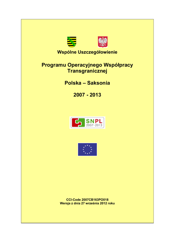 Wspólne Uszczegółowienie Programu Operacyjnego Współpracy Transgranicznej Polska – Saksonia 2007 - 2013 CCI-Code 2007CB163PO018 Wersja z dnia 27 września 2012 roku Wspólne Uszczegółowienie Programu Współpracy Transgranicznej Polska-Saksonia 2007-2013 Impressum Niniejsze Wspólne Uszczegółowienie Programu Operacyjnego Współpracy Transgranicznej Polska – Saksonia 2007-2013 zostało opracowane przez Saksońskie Ministerstwo Gospodarki, Pracy i Transportu oraz polskie Ministerstwo Rozwoju Regionalnego. Wydawca: Saksońskie Ministerstwo Gospodarki, Pracy i Transportu Referat 54 – Instytucja Zarządzająca Data: 27 września 2012 r. 2 Wspólne Uszczegółowienie Programu Współpracy Transgranicznej Polska-Saksonia 2007-2013 Spis treści IMPRESSUM 2 SPIS TREŚCI 3 WYKAZ SKRÓTÓW 6 SŁOWNICZEK TERMINÓW 7 I. CZĘŚĆ OGÓLNA 9 1. Podstawa prawna / Cel wsparcia 9 1.1. 2. 3. 4. 5. 6. Podstawy prawne Przedmiot wsparcia 9 11 1. Oś priorytetowa 1 – Rozwój transgraniczny 11 2. Oś priorytetowa 2 – Transgraniczna integracja społeczna 11 Beneficjenci i obszar wsparcia 12 3.1. Beneficjenci 12 3.2. Obszar wsparcia 12 Warunki uzyskania wsparcia 13 4.1. Kontekst transgraniczny 13 4.2. Zastosowanie zasady Partnera Wiodącego 14 4.3. Wymogi dotyczące finansowania projektu 14 Rodzaj i wysokość wsparcia 14 5.1. Rodzaj wsparcia 14 5.2. Wysokość wsparcia 15 5.3. Zasady dotyczące kwalifikowalności wydatków 15 5.4. Wydatki kwalifikowalne 18 5.5. Wydatki niekwalifikowalne 24 Inne postanowienia 24 6.1. Okres przechowywania dowodów 24 6.2. Zasada jawności projektów 25 6.3. Obowiązki publikacji i promocji 25 6.4. Umowa partnerska 25 6.5. Okres trwałości 25 6.6. Zapewnienie finansowania 25 Data: 27 września 2012 r. 3 Wspólne Uszczegółowienie Programu Współpracy Transgranicznej Polska-Saksonia 2007-2013 6.7. 7. Przekazywanie środków wsparcia podmiotom zewnętrznym Procedura 25 26 7.1. Przygotowanie wniosku o dofinansowanie 26 7.2. Doradztwo i szkolenia na rzecz beneficjentów 26 7.3. Wypełnianie wniosku 26 7.4. Złożenie wniosku o dofinansowanie 26 7.5. Korespondencja z wnioskodawcą 28 7.6. Ocena wniosku o dofinansowanie pod względem specyfiki programu 28 7.7. Rejestracja wniosku 28 7.8. Ocena formalno-prawna i merytoryczna 28 7.9. Ocena jakości transgranicznej 30 7.10. Przygotowanie decyzji w sprawie wniosku o dofinansowanie 31 7.11. Podejmowanie uchwały w sprawie wniosku o dofinansowanie 31 7.12. Komunikat w sprawie uchwały 31 7.13. Kontrola z art. 16 Rozporządzenia (WE) nr 1080/2006 32 7.14. Wypłata środków 33 7.15. Zakończenie projektu 33 7.16. 34 Zmiana umowy o dofinansowanie Wejście w życie 8. II. CZĘŚĆ SZCZEGÓŁOWA 1. Oś priorytetowa 1 – Rozwój Transgraniczny 34 35 35 1.1. Dziedzina Wsparcia 1 – Gospodarka i nauka 35 1.2. Dziedzina wsparcia 2 – Turystyka i działalność uzdrowiskowa 44 1.3. Dziedzina wsparcia 3 – Transport i komunikacja 55 1.4. Dziedzina wsparcia 4 – Środowisko przyrodnicze 61 1.5. Dziedzina wsparcia 5 – Ład przestrzenny i planowanie regionalne 67 2. Oś priorytetowa 2 – Transgraniczna integracja społeczna 69 2.1. Dziedzina wsparcia 1 – Kształcenie i szkolenie 69 2.2. Dziedzina wsparcia 2 – Kultura i sztuka 74 2.3. Dziedzina wsparcia 3 – Infrastruktura społeczna 81 2.4. Dziedzina wsparcia 4 – Bezpieczeństwo publiczne 86 2.5. Dziedzina wsparcia 5 – Rozwój współpracy partnerskiej 90 2.6. Dziedzina wsparcia 6 – Fundusz Małych Projektów 92 CZĘŚĆ III - ZAŁĄCZNIK 94 Zasada Partnera Wiodącego 94 Data: 27 września 2012 r. 4 Wspólne Uszczegółowienie Programu Współpracy Transgranicznej Polska-Saksonia 2007-2013 Załącznik nr 1 Kryteria wyboru projektów Załącznik nr 2 Obowiązki związane z informacją i promocją Data: 27 września 2012 r. 96 101 5 Wspólne Uszczegółowienie Programu Współpracy Transgranicznej Polska-Saksonia 2007-2013 Wykaz skrótów AfA Amortyzacja ANBestP Postanowienia Ogólne dotyczące dofinansowania projektów (Allgemeine Nebenbestimmungen für Zuwendungen zur Projektförderung) BiR Badania i Rozwój EWWiS Europejska Wspólnota Węgla i Stali FMP Fundusz Małych Projektów IC Instytucja Certyfikująca IZ Instytucja Zarządzająca LSF Urząd Krajowy ds. Podatków i Finansów (Landesamt für Steuern und Finanzen) MRR Ministerstwo Rozwoju Regionalnego ÖPNV Miejscowa publiczna komunikacja osobowa (Öffentlicher Personennahverkehr) PKW Samochód osobowy (Personenkraftwagen) RO Rozporządzenie SAB Saksoński Bank Odbudowy – Bank Wsparcia (Sächsische Aufbaubank – Förderbank) SäHO Saksońska Ustawa Budżetowa (Sächsische Haushaltsordnung) SMF Saksońskie Ministerstwo Finansów SMI Saksońskie Ministerstwo Spraw Wewnętrznych (Sächsisches Staatsministerium des Innern) SMUL Saksońskie Ministerstwo Środowiska i Rolnictwa SMWA Saksońskie Ministerstwo Gospodarki, Pracy i Transportu TMGS Spółka Turystyka Marketing (Tourismus Marketing Gesellschaft) VwV Przepisy administracyjne (Verwaltungsvorschrift) WE Wspólnota Europejska WST Wspólny Sekretariat Techniczny Data: 27 września 2012 r. 6 Wspólne Uszczegółowienie Programu Współpracy Transgranicznej Polska-Saksonia 2007-2013 Słowniczek terminów Fundusz Małych Projektów W ramach Funduszu Małych Projektów każdorazowo wsparcie mogą otrzymać projekty o wartości dofinansowania do 15 000 euro lub w przypadku spełnienia kryterium wspólnego finansowania - projekty maksymalnie do 34 000 euro, które służą pielęgnowaniu i intensyfikowaniu transgranicznej wymiany informacji, komunikacji oraz współpracy pomiędzy obywatelami, stowarzyszeniami i instytucjami na wspólnym obszarze wsparcia, a także służą wzmacnianiu identyfikacji mieszkańców ze wspólnym obszarem wsparcia. Fundusz Małych Projektów wdrażany jest w porozumieniu przez saksońską i polską część Euroregionu Neisse-Nisa-Nysa jak również przez polską część Euroregionu Sprewa-Nysa-Bóbr. Szczegółowe uregulowania zapisa