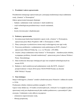 1 1. Przedmiot i zakres opracowania Przedmiotem niniejszego opracowania jest „koncepcja modernizacji stacji uzdatniania wody „Granica” w Świnoujściu” Zakres opracowania koncepcji obejmuje: - badania uzdatniania wody wykonane w skali modelowej - część technologiczną przedstawioną w trzech wariantach, - akpia - koszty inwestycyjne i eksploatacyjne 2. Podstawy opracowania 1. Inwentaryzacja budowlana budynków ujęcia wody „Granica” w Świnoujściu, opracowana przez Biuro Projektów ABC w Świnoujściu w 2003r. 2. Plany sytuacyjno wysokościowe terenu stacji wodociągowej oraz ujęć wody. 3. Przyczyny problemów z uzdatnianiem wody podziemnej na SUW „Granica” – opracowanie Mikrosil Polska Sp. z o.o. we Wrześni z 09-2006r. 4. Artykuł „Stacja uzdatniania wody Granica” w Świnoujściu – charakterystyka obiektu, występujące problemy, kierunki modernizacji”, opracowany przez Łukasza Webera i Piotra Deresińskiego. 5. Dane techniczne dotyczące istniejących ujęć oraz urządzeń technologicznych na terenie SUW. 6. Badania w skali modelowej nad uzdatnianiem wody dla SUW „Granica”, przeprowadzone w lutym 2012r przez TECH-WOD Poznań, na zlecenie PPW”WOGA” Poznań 3. Stan istniejący Stacja wodociągowa „Granica” została wybudowana przez Niemców i oddana do użytku w 1910r. Przekazanie obiektu władzom polskim nastąpiło w 1951r. Ujęcie wody składa się z 10 studni czwartorzędowych, z których 5 ze względu na jakość ujmowanej wody jest eksploatowanych jako studnie podstawowe, a pozostałych 5 jako awaryjne. Uzdatnianie wody odbywa się poprzez: - ciśnieniowe napowietrzanie wody, - filtrację pospieszną. 2 Napowietrzanie wody odbywa się na dwóch aeratorach o średnicy 1,4 m i pojemności 2 x 1,8 m³ Powietrze do napowietrzania dostarczane jest ze sprężarki CF 75 D 6 o mocy 37 kW i gromadzone jest w zbiorniku powietrza o średnicy 1,4 m. Filtracja wody odbywa się na czterech filtrach piętrowych o średnicy 2,2 m każdy. System rurociągów został tak zaprojektowany, że istnieje możliwość wykorzystania filtrów dwupółkowych w filtracji jednostopniowej, lub dwustopniowej. Właściwa warstwa filtracyjna złoża chalcedonitowego posiada uziarnienie 0,8 – 2,0 mm, a jej wysokość wynosi 0,6 m (półka dolna) i 0,7 m (półka górna). Filtry płukane są przy jednoczesnym użyciu wody i powietrza. Ten sposób płukania powoduje wyrzucanie złoża filtracyjnego do popłuczyn i warstwa filtracyjna maleje i w niektórych filtrach wynosi zaledwie 0,5 – 0,6 m. Schemat technologiczny stacji wodociągowej przedstawia się następująco: Woda surowa ujmowana pompami głębinowymi tłoczona jest do aeratorów i na filtry, a z filtrów do zbiornika wody czystej o pojemności 100 m³. Ze zbiornika woda jest pobierana zestawem pomp IIº i tłoczona do zbiorników sieciowych odległych o ~1,5 km od SUW. Zbiorniki posiadają pojemność 2 x 1800 m³. Ze zbiorników woda spływa grawitacyjnie do sieci miejskiej. Płukanie filtrów odbywa się wodą i powietrzem. Woda do płukania jest pobierana ze zbiornika wody czystej pompą głębinową GC5.04 o wydajności 60 m³/h i mocy N = 15 kW. Powietrze do płukania jest pobierane ze zbiornika sprężonego powietrza. Płukanie powietrzem trwa początkowo 1 – 2 minut, po czym włącza się pompę głębinową i odbywa się płukanie emulsją woda-powietrze przez ~20 min. Woda z płukania filtrów jest odprowadzana do studni zbiorczej o średnicy 1,6 m, i pojemności 6 m³,skąd jest przepompowywana do oczyszczalni ścieków. Obecnie zainstalowana do popłuczyn jest pompa typu ABS AFP 0834.2-M 110/2 o wydajności Q = 33 m³/h, H = 40 m i N = 13,3 kW. Roczna produkcja wody ujęcia „Granica” w roku 20112 wynosiła 872.168 m³, co stanowi ~2.400 m³/dobę (100m³/h). Produkcja wody w ciągu roku jest bardzo zróżnicowana, ze względu na wypoczynkowy charakter miasta. W maksymalnych dobach letnich ze stacji podaje się do miasta 170 – 220 m³/h. 3 4. Jakość wody i technologia uzdatniania Jakość wody w poszczególnych studniach jest bardzo zróżnicowana. Najkorzystniejszą jakość posiadają studnie:SD1,SD2,SD3,D3 i D4, a najgorszą studnie D5,C3,C8,C10 i C12 Parametry wody w grupie studni o gorszej jakości wody przedstawiają się następująco: - żelazo 5 – 10 mg/dm³, - mangan 0,8 – 2,3 mg/dm³, - amoniak 1,3-2,4 mg/dm³, - utlenialność 8-13 mg O2/dm³ - węgiel organiczny 4,6 mg/dm³ Jakość mieszanej wody jest uzależniona od wyboru podłączonych studni oraz od ich wydajności. Podczas badań badań technologicznych przeprowadzonych w 2012r. otrzymano następujące wskaźniki jakości wody - patrz tabela 1 W badanym ujęciu stwierdzono duże stężenie tlenu w wodzie surowej dopływającej do SUW. Wynosi ono 3-4 mg O2/dm³. Obecność tlenu w wodzie surowej powoduje wytrącanie żelaza w rurociągach tłoczących wodę ze studni na stację. Osady żelaza nie zatrzymywane przez obecny układ aeracji są wprowadzane na filtry powodując ich kolmatację. Z dotychczasowej eksploatacji oraz badań technologicznych przeprowadzonych w 2012r. i wcześniejszych w 2006r. (Mikrosil Polska sp.z o.o.) wynika, że obecne uzdatnianie wody realizowane przez napowietrzanie wody w układzie ciśnieniowym z bardzo krótkim czasem reakcji oraz filtracją przez złoże kwarcowe wpracowane oraz chalcedonitowe, nie zapewnia uzyskania odpowiedniego efektu, nawet przy ograniczonej prędkości filtracji. Konstrukcja istniejących filtrów piętrowych nie pozwala na zastosowanie odpowiedniej wysokości złóż filtracyjnych. Brak jest jakichkolwiek urządzeń pozwalających na równomierne obciążenie poszczególnych filtrów. Nieodpowiednie jest też płukanie filtrów. Wydajność istniejącej pompy płucznej – 60 m³/h pozwala osiągnąć intensywność płukania zaledwie 4,4 l/s m², co nie wywołuje żadnej ekspansji złoża filtracyjnego. Dla uzyskania efektu wypłukania filtrów stosuje się em