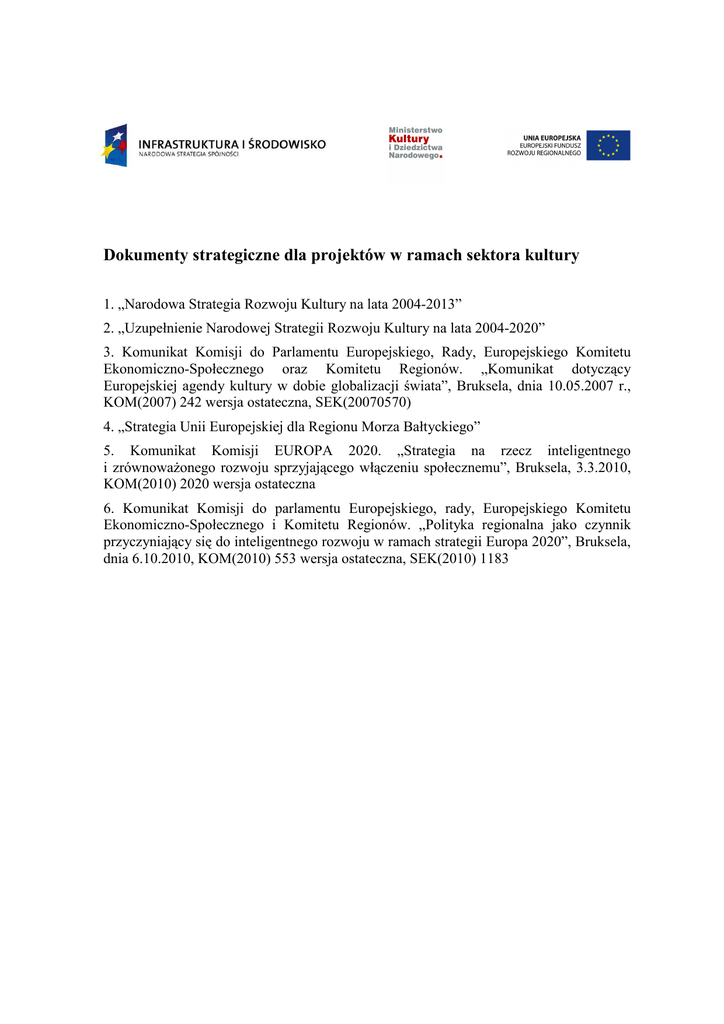 Dokumenty strategiczne dla projektów w ramach sektora kultury 1. „Narodowa Strategia Rozwoju Kultury na lata 2004-2013” 2. „Uzupełnienie Narodowej Strategii Rozwoju Kultury na lata 2004-2020” 3. Komunikat Komisji do Parlamentu Europejskiego, Rady, Europejskiego Komitetu Ekonomiczno-Społecznego oraz Komitetu Regionów. „Komunikat dotyczący Europejskiej agendy kultury w dobie globalizacji świata”, Bruksela, dnia 10.05.2007 r., KOM(2007) 242 wersja ostateczna, SEK(20070570) 4. „Strategia Unii Europejskiej dla Regionu Morza Bałtyckiego” 5. Komunikat Komisji EUROPA 2020. „Strategia na rzecz inteligentnego i zrównowaŜonego rozwoju sprzyjającego włączeniu społecznemu”, Bruksela, 3.3.2010, KOM(2010) 2020 wersja ostateczna 6. Komunikat Komisji do parlamentu Europejskiego, rady, Europejskiego Komitetu Ekonomiczno-Społecznego i Komitetu Regionów. „Polityka regionalna jako czynnik przyczyniający się do inteligentnego rozwoju w ramach strategii Europa 2020”, Bruksela, dnia 6.10.2010, KOM(2010) 553 wersja ostateczna, SEK(2010) 1183