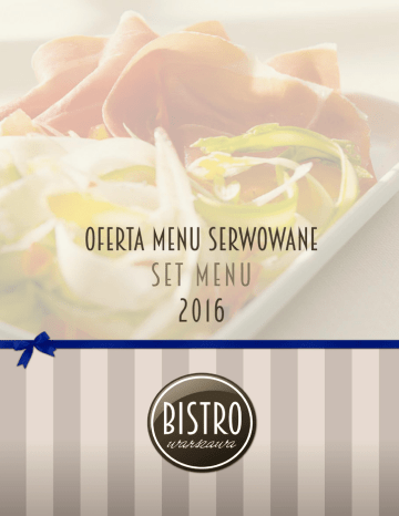 Bistro Warszawa • Rynek Starego Miasta • ul. Jezuicka 1/3 • 00-281 Warszawa tel.: +48 (22) 635 37 69 • mob.: +48 501 438 007 • www.bistrowarszawa.pl Menu 1 Zupy / Soups (do wybory przez Gości / optional) Zupa grzybowa z grzankami Mushrooms soup with croutons lub/or Tradycyjny żurek podany z jajkiem i białą kiełbasą Traditional sour cream soup served with eggs and sausage Dania Główne/ Mains (do wybory przez Gości / optional) Pierś z kurczaka z kremowym sosem kaparowym, pieczonym ziemniakiem & zieloną sałatą Chicken breast with creamy capers sauce, baked potato & green salad lub/or Pierogi ze szpinakiem, kaszą i serem feta Homemade dumplings stuffed with buckwheat, spinach and feta cheese Desery / Sweet Things Sernik puszysty na migdałowej poduszce Cheesecake on an almond pillow Napoje – bez limitu / Drinks – unlimited Kawa i Herbata Coffee & tea Woda niegazowana, soki owocowe Still water, fruit juices 65,- od osoby / 65,-per person Bistro Warszawa • Rynek Starego Miasta • ul. Jezuicka 1/3 • 00-281 Warszawa tel.: +48 (22) 635 37 69 • mob.: +48 501 438 007 • www.bistrowarszawa.pl Menu 2 Przystawki podane w stół / Starters served buffet style Liście szpinaku, carpaccio z buraków, gruszka i ser kozi Spinach leaves, beetroot carpaccio, pear & goat cheese Placki przekładane musem z wątróbek i brandy Pancakes layered with liver and brandy mousse Płaty cielęciny na sosie kaparowo-tuńczykowym Veal Carpaccio served on caper & tuna sauce Dodatki / Sides Kosz pieczywa podany z masłem czosnkowym Basket of bread with garlic butter Dania Główne / Main Course (do wybory przez Gości / optional) Wstążki makaronu z krewetkami na białym winie z czosnkiem Pasta ribbons with tiger prawns on white wine sauce and garlic Lub/or Golonka z kapustą zasmażaną i ziemniakiem Pork knuckle with fricabbage and potato Deser / Dessert Domowa szarlotka na ciepło z lodami Warm apple pie with ice cream Napoje – bez limitu / Drinks – unlimited Kawa i Herbata Coffee & Tea Woda niegazowana, soki owocowe Still water, fruit juices 74,- od osoby / 74,-per person Bistro Warszawa • Rynek Starego Miasta • ul. Jezuicka 1/3 • 00-281 Warszawa tel.: +48 (22) 635 37 69 • mob.: +48 501 438 007 • www.bistrowarszawa.pl Menu 3 Przystawki podane w stół / Starters served buffet style Sałata rzymska z kurczakiem, grillowanymi warzywami i dressingiem musztardowym Romaine lettuce with chicken breast, griled vegetables & mustard dressing Śledź marynowany ze świeżymi ziołami w oliwie truflowej Marinated herring with fresh herbs in truffle oil Płaty cielęciny na sosie kaparowo-tuńczykowym Veal Carpaccio served on caper & tuna sauce Placki przekładane musem z wątróbek i brandy Pancakes layered with liver and brandy mousse Dodatki / Sides Kosz pieczywa podany z masłem czosnkowym Basket of bread with garlic butter Dania Główne / Main Course (do wybory przez Gości / optional) Dorsz na maślanych pomidorach podany z marchewką i truflowymi ziemniakami puree Cod fish served on butter tomatoes, with young carrots & truffled potato puree Lub/or Zrazy wołowe w sosie własnym podawane z buraczkami i domowymi kopytkami Beef Rolls in own sauce served with beets and homemade dumplings Deser / Dessert (do wybory przez Gości / optional) Sernik puszysty na migdałowej poduszce Cheesecake on an almond pillow Lub/or Domowa szarlotka na ciepło z lodami Warm apple pie with ice cream Bistro Warszawa • Rynek Starego Miasta • ul. Jezuicka 1/3 • 00-281 Warszawa tel.: +48 (22) 635 37 69 • mob.: +48 501 438 007 • www.bistrowarszawa.pl Napoje – bez limitu / Drinks – unlimited Kawa i Herbata Coffee & Tea Woda niegazowana, soki owocowe Still water, fruit juices 86,- od osoby/ 86,-per person Menu 4 Przystawki podane w stół / Starters served buffet style Tatar z kaparami, anchois, musztardą Dijon i jajem Steak tartar with capers, anchovies, Dijon mustard & egg Płaty cielęciny na sosie kaparowo-tuńczykowym Veal Carpaccio served on caper & tuna sauce Liście szpinaku, carpaccio z buraków, gruszka i ser kozi Spinach leaves, beetroot carpaccio, pear & goat cheese Sałata rzymska z kurczakiem, grillowanymi warzywami i dressingiem musztardowym Romaine lettuce with chicken breast, griled vegetables & mustard dressing Dodatki / Sides Kosz pieczywa podany z masłem czosnkowym Basket of bread with garlic butter Dania Główne / Main Course (do wybory przez Gości / optional) Łosoś w delikatnym sosie paprykowym podany z pieczonym ziemniakiem i szpinakiem Salmon in smooth pepper sauce, served with baked potatoes and spinach Lub/or Polędwiczka wieprzowa w sosie estragonowym, marchewką i pieczonym ziemniakiem Grilled pork loin served on tarragon sauce, carrots, baked potatoes Bistro Warszawa • Rynek Starego Miasta • ul. Jezuicka 1/3 • 00-281 Warszawa tel.: +48 (22) 635 37 69 • mob.: +48 501 438 007 • www.bistrowarszawa.pl Patery Deserów / Dessert Selection Sernik na migdałowej poduszce Cheesecake on szarlotka an almond pillow Domowa szarlotka na ciepło Warm apple pie Ciasteczka maślane z karmelizowanymi migdałami Butter cake with caramelized almonds Napoje – bez limitu / Drinks – unlimited Kawa i Herbata Coffee & Tea Woda niegazowana, soki owocowe Still water, fruit juices 98,- od osoby/ 98,- per person Menu 5 Przystawki podane w stół / Starters served buffet style Tatar z kaparami, anchois, musztardą Dijon i jajem Steak tartar with capers, anchovies, Dijon mustard & egg Krewetki w sosie z białego wina, masła i czosnku Prawns in butter, white wine & garlic sauce Płaty łososia z sosem musztardowo-miodowym Salmon served with honey-mustard sauce Płaty cielęciny na sosie kaparowo-tuńczykowym Veal Carpaccio served on caper & tuna sauce Liście szpinaku, carpaccio z buraków, gruszka i ser kozi Spinach leaves, beetroot carpaccio, pear & goat cheese Bistro Warszawa • Rynek Starego Miasta • ul. Jezuicka 1/3 • 00-281 Warszawa tel.: +48 (22) 635 37 69 