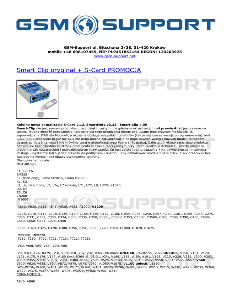 GSM-Support ul. Bitschana 2/38, 31-420 Kraków mobile +48 608107455, NIP PL9451852164 REGON: 120203925 www.gsm-support.net Smart Clip oryginał + S-Card PROMOCJA Kolejna nowa aktualizacja S-Card 2.12, SmartMoto v3.23 i Smart-Clip 4.09 Smart-Clip nie jest nowym produktem, lecz dzięki częstym i bezpłatnym aktualizacjom od prawie 4 lat jest zawsze na czasie. Trudno znaleźć odpowiednią kategorię dla tego urządzenia biorąc pod uwagę jego przyszłe możliwości tj. zapowiedziany JTAG dla Motoroli, a aktualna obsługa wszystkich telefonów (także najnowsze wersje oprogramowania) serii C3xx, E3xx oraz Vxxx to już nie byle co! Klipa można aktualizować o obsługe nowych wersji i nowych modeli telefonów bezpośrednio z Internetu ! Nie mówimy tutaj o aktualizacji typu Pobierz, Rozpakuj, Zainstaluj. Aktualizacja tego produktu odbywa sie bezpośrednio ze strony producenta w czasie rzeczywistym przy użyciu kontrolki ActiveX !!! Jest to pierwszy produkt o tak nowatorskim i przyszłościowym rozwiązaniu. Co jest zaletą tego urządzenia ? Na pewno prosta i intuicyjna obsługa - wystarczy tylko jeden przycisk po podłączeniu telefonu, aby odblokować modele z serii C3xx, E3xx oraz Vxxx bez względu na wersję i bez obawy uszkodzenia telefonu. Obsługiwane modele: MOTOROLA: E1, E2, E6 EM325 F3 (flash only), Foma M702iG, Foma M702iS K1, K3 L2, L6, L6 i-mode, L7, L7e, L7 i-mode, L71, L72, L9, L378i, L1070, U3, U6 Z3, Z6 ZN200 M1000 A630, A830, A835, A845, A920, A925, A1000, A1200 C115, C116, C117, C118, C139, C140, C155, C156, C157, C168, C168i, C236, C250, C257, C260, C261, C266, C268, C275, C330, C331, C332, C333, C334, C335, C336, C350, C350L, C350V, C353, C355V, C359V, C380, C385, C390, C450, C450L, C550, C650, C651, C975, C980 E365, E370, E375, E378i, E380, E396, E398, E550, E770, E920, E1000, E1070, E1075 MPX200, MPX220 T280, T280i, T720, T721, T720i, T722i, T725e V60, V60i, V66, V66i, V70, V80 V3, V3i (R47A, R479), V3r, V3re, V3t, V3v, V3x, V3xx, V6 maxx UNLOCK, RAZR2 V9, V3xx UNLOCK, V150, V151, V170, V171, V175, V176, V177, V180 (incl. R364_G_0B.D1.1CR), V186, V188, V190, V191, V195, V220, V226, V235, V300, V303, V330, V355, V360, V360v, V361, V400, V500, V505, V525, V525M, V535, V545, V547, V550, V551, V555, V557, V560, V600, V620, V635, V690, V872, V878, v975, V980, V1050, V1075. V1100 unlock, V1150 W5, W156, W160, W161, W175, W177, W180, W181, W205, W206, W208, W209, W213, W215, W218, W220, W233, W360, W370, W375, W377, W388, W396, W397v, W450, W490, W510 CDMA MODELS: A840, A860 C290, C343, C364 E815 K1m L7c T720c V260, V262, V265, V266, V276, V323, V323i, V325, V325i, V325xi, V3a, V3c, V3m, V710, V750, V810, V9m, VU204 VE20, VU30 W315, W385, W755 Z6c, Z6m, Z6tv ZN4 SENDO: snd2xx, snd3xx (incl. snd360 s360), snd5xx (incl. snd570 m570), snd6xx (incl. snd600 p600/s600), snd8xx SONYERICSSON: J100, J110, J110i, J120, J120i, T260, T303, Z250, Z320 Program do aktualizowania klipa: Możliwości: Dostępny jest program odczytujący z klipa informacje o nieudanych próbach unlock'a z określonych wersji i pozwalający odczytać flasha z nie obsługiwanych telefonów. Po wysłaniu flasha do producenta można będzie uzyskać aktualizację. Smart Clip posiada specjalne funkcje serwisowe przy pracy z komputerem PC: Kopia zapasowa flasha - Funkcja ta pozwala zgrać firmware z telefonu Motorola. Wgranie pełnego flasha - Dzięki tej opcji można przywrócić telefon do stanu poprzedniego przy pomocy wcześniej zgranego backupu. Auto backup/Przywrócenie security area - Do tych modeli gdzie security area nie przywraca się - ten obszar zostanie automatycznie zapisany przy wchodzeniu w tryb boot. W razie potrzeby security area może zostać przywrócone przy użyciu tej funkcji. Odczyt informacji z telefonu - Można uzyskać pełne informacje o telefonie: Model, IMEI, Kod użytkownika, Kod bezpieczeństwa, Obsługiwane częstotliwości, Firmware, Wersja flexa, Pakiet językowy Flashowanie - Funkcja wygrywania oprogramowania do telefonu - np. zmiana wersji lub języka Flashowanie naprawcze - Zmiana pełnego oprogramowania w telefonie (włącznie z obszarem EEPROM). Biblioteki flashy bedą dostępne wkrótce. Na razie jest możliwość zgrania flasha z jednego telefonu i wgrania do innego (ten sam model). Proces aktualizacji klipa: Specyfikcja: usunięcie simlocka w przeciągu 5 sekund za pomocą jednego przycisku darmowe aktualizacje dla modeli Cxxx, Exxx, Vxxx nie wymaga komputera do pracy urządzenia (całkowita mobilność) aktualizacje urządzenia pobierane ze strony producenta w czasie rzeczywistym przy użyciu kontrolki ActiveX (aktualizacja klipa o obsługę nowych modeli i obsługę najnowszych wersji oprogramowania poprzez Internet przy użyciu LPT) wymiary: 86 x 66 x 32 mm zasilanie AC 9V, 50 mA aluminiowa obudowa niwelująca wyładowania elektrostatyczne Zestaw zawiera: Smart-Clip kable do modeli -serie V -serie C -Motorola E365 -Motorola C115 C116 -Sendo S200/P200 -Sendo M550 klips do podłączenia baterii 9V gwarancja Po dokonaniu zakupu konieczne jest podłaczenie Smart Clipa do komputera PC poprzez kabel LPT (nie załączony do zestawu) i dokonanie bezpłatnej aktualizacji do najnowszej wersji firmware'u. Po dokonaniu updatu rozpoczyna się okres gwarancyjny producenta tj. 6 miesięcy Modele Argon wymagają użycia specjalnego kabla nie załączonego do zestawu - schemat udostępniony na stronie producenta. ©2012 www.gsm-support.net Opis ten nie stanowi oferty w rozumieniu Kodeksu Cywilnego. GSM-Support zastrzega sobie prawo do możliwych błędów w opisie produktu. Prosimy o weryfikację z Państwa strony, a w razie wątpliwości o kontakt. GSM-Support ul. Bitschana 2/38 31-420 Kraków POLSKA tel. 608107455 e-mail: [email protected] Powered by TCPDF (www.tcpdf.org)