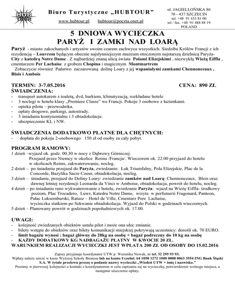 Biuro Turystyczne „HUBTOUR” www.hubtour.pl [email protected] ul. JAGIELLOŃSKA 86 70 - 437 SZCZECIN tel. +48 91 433 81 00 tel / fax. +48 91 488 88 19 POLAND 5 DNIOWA WYCIECZKA PARYŻ I ZAMKI NAD LOARĄ Paryż - miasto zakochanych i artystów swoim czarem zachwyca wszystkich. Siedziba Królów Francji z ich rezydencją – Louvrem będącym obecnie najsłynniejszym muzeum otoczonym najstarszą dzielnicą ParyżaCity z katedrą Notre Dame . Z najbardziej znaną ulicą świata Polami Elizejskimi , niezwykłą Wieżą Eiffla , cmentarzem Per Lachaise z grobem Chopina i magicznym Montmartrem Zobaczycie również Państwo zaczarowaną dolinę Loary z jej wspaniałymi zamkami Chennonceaux , Blois i Ambois TERMIN: 3-7.05.2016 ŚWIADCZENIA: - CENA: 890 ZŁ transport autokarem z toaletą, dvd, barkiem, klimatyzacją, rozkładane hotele 3 noclegi w hotelu klasy „Premiere Classe” we Francji. Pokoje 3 osobowe z łazienkami. opieka pilota – przewodnika. opłaty drogowe, parkingi, autostrady. 3 śniadania kontynentalne i 3 obiadokolacje. ubezpieczenie KL i NW. ŚWIADCZENIA DODATKOWO PŁATNE DLA CHĘTNYCH: - dopłata do pokoju 2-osobowego 150 zł od osoby za cały pobyt. PROGRAM RAMOWY: 1 dzień –wyjazd ok. godz. 00.30 w nocy z Dąbrowy Górniczej. Przejazd przez Niemcy w okolice Reims /Francja/. Wieczorem ok. 22.00 przyjazd do hotelu w okolicach Reims, zakwaterowanie, nocleg. 2 dzień – po śniadaniu przejazd do Paryża, zwiedzanie: Łuk Triumfalny, Pola Elizejskie, Plac de la Concorde, Bazylika Sacre Coeur, obiadokolacja, nocleg. 3 dzień – śniadanie, przejazd do Doliny Loary: zwiedzanie zamków nad Loarą: Chennonceaux, Blois oraz dawnej letniej rezydencji Leonarda da Vinci w Amboise, obiadokolacja, powrót do hotelu, nocleg. 4 dzień – po śniadaniu rano wykwaterowanie z hotelu, zwiedzanie Paryża: wjazd na Wieżę Eiffla- środkowy poziom, Plac Trocadero, Luwr, Katedra Notre Dame, wizyta w perfumerii Fragonard, Panteon, Pałac Luksemburski, Ratusz – Hotel de Ville, Cmentarz Pere Lachaise, wycieczka statkiem po Sekwanie obiadokolacja. Wyjazd do Polski w godzinach wieczornych. 5 dzień – Planowany powrót w godzinach popołudniowych ok. 17.00. UWAGI: - kolejność zwiedzanych obiektów ustala pilot i może ona ulec zmianie. - bilety wstępu do obiektów oraz bilety komunikacji miejskiej pokrywają uczestnicy: dorośli ok. 70 EURO. - limit bagażu wynosi : bagaż główny do 20kg na osobę + bagaż podreczny do 10 kg na osobę - KAŻDY DODATKOWY KG NADBAGAŻU PŁATNY W KWOCIE 20 ZŁ. WARUNKIEM REALIZACJI WYCIECZKI JEST WPŁATA 200 ZŁ OD OSOBY DO 15.02.2016 Zapisy przyjmuje koordynator UTW p. Weronika Nowak, nr tel. 32 295 93 93. Wpłaty należy uiścić w kasie Wyższej Szkoły Biznesu lub na konto Uczelni: 64 1050 1272 1000 0008 0063 3554 ING Bank Śląski S.A. W tytule przelewu proszę o podanie nazwy wycieczki „Wiedeń UTW + imię i nazwisko.” Prosimy w pierwszej kolejności o kontakt z koordynatorem w celu zapisania się na wycieczkę, potwierdzenie wolnego miejsca, a następnie uiszczenie opłaty. WYCIECZKA DO WIEDNIA 15-17.04.2016 Dzień I . Wyjazd z Dąbrowy Górniczej o godz. 6.30. Przejazd przez Czechy, krótki postój w strefie bezcłowej na zakupy i posiłek we własnym zakresie. Przejazd do Wiednia. Zwiedzanie pałacu w Schoenbrunnie wraz z ogrodami. Zwiedzanie domu Hundertwassera z zewnątrz i ewentualny czas wolny - posiłek we własnym zakresie. Przejazd do hotelu Oekotel Traiskirchen*** (Hochmühlstraße 5, 2514 Traiskirchen) około godziny 20.00, zakwaterowanie, nocleg. Dzień II. Śniadanie. Po śniadaniu przejazd do Wiednia, zwiedzanie miasta z licencjonowanym przewodnikiem wiedeńskim ( 3 godziny) i z pilotem. W programie wejście do Krypt cesarskich, Kościół Karola Boromeusza z zewnątrz, Musikverein gdzie odbywają się słynne koncerty noworoczne z zewnątrz, Ring i jego okazałe budowle jak Ratusz, Opera. Zwiedzanie wnętrza Opery z przewodnikiem,Hoffburg, Katedra Stefansdom,czas wolny. Następnie przejazd na Grinzing i kolacja w tradycyjnej restauracji Heuriger ,przy austriackiej muzyce. Impreza max do trzech godzin. Posiłek składa się z ciepłego talerza z uboju, czyli różne rodzaje mięsa + kapusta i ziemniaki + 250ml wina /osobę, lub talerz z uboju,ziemniaki, kapusta+ zupa +wino. Po kolacji przejazd do hotelu na nocleg. Dzień III. Śniadanie. Po śniadaniu przejazd do Wiednia, zwiedzanie Belwederu indywidualnie (możliwość wstępu we własnym zakresie cena ok.12.50€) lub do wyboru uczestnictwo w Mszy Św. w polskim kościele. Przejazd w kierunku Kahlenbergu, gdzie odbyła się w 1683 roku zwycięska bitwa pod dowództwem Króla Jana III Sobieskiego.Panorama miasta. Wyjazd w drogę powrotną około 13.00. Po drodze obiad w Lechovicach. Przyjazd do Dąbrowy Górniczej około godziny 21.30. Program jest ramowy i może ulec zmianie. Cena zawiera: przejazd autokarem, dwa noclegi w hotelu Oekotel Traiskirchen*** ze śniadaniami, wstęp do pałacu w Schoenbrunnie wraz z ogrodami, licencjonowanego przewodnika wiedeńskiego, opiekę pilota, wejście do Krypt cesarskich, zwiedzanie wnętrza Opery z przewodnikiem, kolację w tradycyjnej restauracji Heuriger, przy austriackiej muzyce, obiad na powrocie w Lechovicach, ubezpieczenie KL 10 000 EURO, NNW 8000 zł, bagaż 800 zł, opłatę miejscową. Zaliczka 200 zł płatna do 15.02.2016 Druga zaliczka 200zł do 29.02.2016 Dopłata do 30 marca Kalkulacje były sporządzone na grupę 45 osób CENA 695 zł Zapisy przyjmuje koordynator UTW p. Weronika Nowak, nr tel. 32 295 93 93. Wpłaty należy uiścić w kasie Wyższej Szkoły Biznesu lub na konto Uczelni: 64 1050 1272 1000 0008 0063 3554 ING Bank Śląski S.A. W tytule przelewu proszę o podanie nazwy wycieczki „Wiedeń UTW + imię i nazwisko.” Prosimy w pierwszej kolejności o kontakt z koordynatorem w celu zapisania się na wycieczkę, potwierdzenie wolnego miejsca, a następnie uiszczenie opłaty.