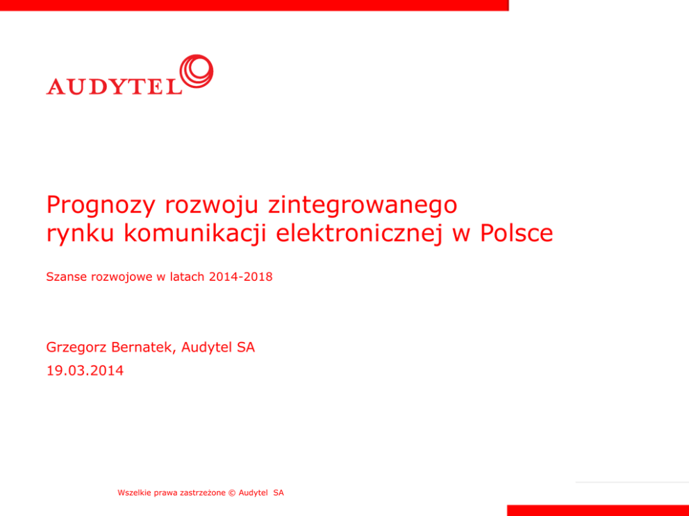 Prognozy rozwoju zintegrowanego rynku komunikacji elektronicznej w Polsce Szanse rozwojowe w latach 2014-2018 Grzegorz Bernatek, Audytel SA 19.03.2014 Wszelkie prawa zastrzeżone © Audytel SA Plan prezentacji • Monitor rynku telekomunikacyjnego • Wyniki i główne obserwacje Rynek komunikacji elektronicznej na tle rynków TMT (Telecom, Media, Technology) Zmiana układu sił Nowe źródła przychodów – gdzie ich szukać? Efektywność operatorów odpowiedzią na spadek przychodów • Podsumowanie Wszelkie prawa zastrzeżone © Audytel SA 2 Monitor Rynku Telekomunikacyjnego Kwartalnie aktualizowana publikacja zawierająca dane operacyjno-finansowe oraz prognozy rozwoju rynku • Sprawdzona metodyka badawcza – Kontynuacja projektu zainicjowanego w roku 2005 wg metodyki Meta Group – Stały monitoring rynku prowadzony przez Audytel od 8 lat – Weryfikacja danych z wielu źródeł • Źródła danych – Dane z własnych badań Audytela – Raporty okresowe operatorów oraz firm będących ich właścicielami – Publiczne prezentacje, informacje prasowe i briefingi analityczne – Dane z rejestrów sądowych – Raporty i publiczne dokumenty UKE – Publicznie dostępne raporty badawcze i analizy niezależnych instytucji – Niezależne oceny ekspertów Wszelkie prawa zastrzeżone © Audytel SA 3 Zawartość Monitora • • Analizowane obszary – Telefonia stacjonarna (detal, hurt, IN) – Telefonia mobilna (pre/post-paid, hurt) – Dostęp do Internetu (6 rodzajów dostępu) – Transmisja danych (6 typów usług) – Rynek datacenter (4 rynki składowe) – Płatna telewizja Zakres informacji – Przychody, liczba klientów i wolumeny minut na poszczególnych rynkach w latach 2003-2012, estymacja na koniec 2013 – Informacje podawane niezależnie dla segmentów klientów indywidualnych i biznesowych – Prognoza ARPU, ARPL i cen usług – Prognozy rozwoju poszczególnych segmentów rynku do 2018 r. • Dodatkowe informacje • Łącznie ponad 120 pól informacyjnych • Forma elektroniczna (arkusz kalkulacyjny) • Wygodny i szybki dostęp do informacji • Baza aktualizowana kwartalnie • Zakup obejmuje subskrypcję na 3 kolejne kwartały • Do każdego wydania Monitora dołączany jest komentarz analityczny Najświeższe dane dotyczące rynku telekomunikacyjnego w Polsce Wszelkie prawa zastrzeżone © Audytel SA 4 Ewolucja rynków TMT Udział poszczególnych segmentów w rynku całkowitym w 2013 r. (prognoza) Telefonia stacjonarna 7,6% • W 2013 r. wartość całego rynku TMT wyniesie ok. 84,3 mld zł… • … w tym wartość rynku komunikacji elektronicznej: 45,6 mld zł • W 2014 r. rynek telekomunikacyjny kolejny rok z rzędu spadnie - o 1% w porównaniu do 2013 r. • W tym samym czasie rynek IT wzrośnie o 8% • Kluczową rolę będą odgrywali operatorzy telefonii komórkowej oraz inwestycje w sieci regionalne i dostępowe • Płatna telewizja staje się głównym motorem utrzymania przychodów operatorów sieci stacjonarnych Dostęp do Internetu 5,9% Rynek IT** 44,1% Telefonia komórkowa 27,5% Rynek gier* 1,8% Płatna TV 8,6% Transmisja danych i udostępnienie infrastruktury 4,5% * ) źródło: Gazeta Prawna oraz analizy własne **) źródło: IDC Polska oraz analizy własne (obejmuje sprzęt, oprogramowanie i usługi) Wszelkie prawa zastrzeżone © Audytel SA 5 Zmiana układu sił na rynku TMT Wartość rynków komunikacji elektronicznej oraz IT w latach 2010-2018 • W 2017 r. wartość rynku IT przekroczy 50 mld zł • W tym samym czasie rynek komunikacji elektronicznej czeka stagnacja • W 2015 r. rynek IT wyprzedzi rynek komunikacji elektronicznej • W okresie prognozy rynek IT w Polsce czeka duża transformacja • Dominujący wpływ będą miały usługi, w szczególności bazujące na architekturach cloudowych (mld zł) 60 CAGR 8,7% 50 40 CAGR 0,4% 30 20 10 0 2010 2011 2012 2013 2014 2015 Komunikacja elektroniczna 2016 2017 2018 IT Źródło: analizy własne Audytel SA Wszelkie prawa zastrzeżone © Audytel SA 6 Wartość rynku w latach 2010-2013 oraz prognoza do roku 2018 Całkowita wartość rynku telekomunikacyjnego w podziale na segmenty CAGR 1,3% [mld zł] 50 -4,0% • CAGR 1,0% 47,92 46,35 46,80 47,55 45,63 45,42 45,97 46,51 47,25 45 Płatna TV 40 Transmisja danych i usługi infrastrukturalne Dostęp do internetu 35 30 25 20 15 Telefonia komórkowa 10 5 Telefonia stacjonarna 0 2010 2011 Czynniki wpływające na wartość rynku: • Organiczny wzrost wynikający z rezerw penetracji (poza telefonią stacjonarną) • Spadek cen usług • Zmienia się model konsumpcji usług i mediów (usługi dodane, rozrywka) • Demografia oraz struktura gospodarstw domowych • Usługi zarządzane • Rozwój telewizji cyfrowej (HD, PVR, IPTV, VoD, ...), Internet w TV • Substytucja ze strony DVB-T 2012 2013P 2014P 2015P 2016P 2017P 2018P Źródło: analizy własne Audytel SA Wszelkie prawa zastrzeżone © Audytel SA 7 Ewolucja sprzedaży usług Liczba usług sprzedawanych na koniec roku • Mobilny internet nadal jest odpowiedzią na braki w ofercie operatorów sieci stacjonarnych Karty SIM • DVB-T oraz OTT osłabiają pozycję operatorów płatnej telewizji Płatna TV (bez OTT) • Telefonia stacjonarna coraz bardziej łączy się z mobilną - Unified Communications Mobilny dostęp do internetu • Zmiana modeli biznesowych (w mln) 60 50 40 30 20 Dostęp do internetu • Internet mobilny „is a must” dla operatorów stacjonarnych i CATV • Zwiększenie limitów (fair use policy) • Taryfy ryczałtowe dla smartfonów, oferty „bez limitów” • Nowe usługi dla LTE/4G? 10 2018P 2017P 2016P 2015P 2014P 2013P 2012 2011 2010 2009 2008 2007 2006 2005 0 Linie przeliczeniowe telefonii stacjonarnej Źródło: analizy własne Audytel SA Wszelkie prawa zastrzeżone © Audytel SA 8 Przychody największych operatorów Przychody całkowite największych operatorów w Polsce w latach 2003-2013 (w mln zł) • Przychody z „tradycyjnych” usług telekom