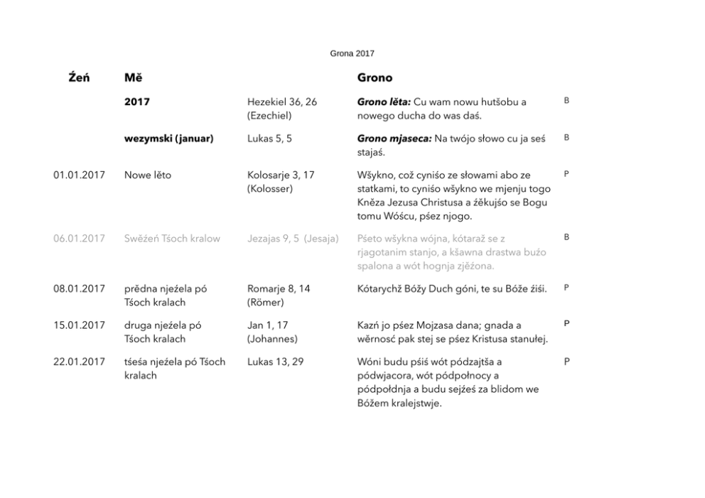 Grona 2017 Źeń Mě Grono 2017 Hezekiel 36, 26 (Ezechiel) Grono lěta: Cu wam nowu hutšobu a nowego ducha do was daś. B wezymski (januar) Lukas 5, 5 Grono mjaseca: Na twójo słowo cu ja seś stajaś. B 01.01.2017 Nowe lěto Kolosarje 3, 17 (Kolosser) Wšykno, což cyniśo ze słowami abo ze statkami, to cyniśo wšykno we mjenju togo Kněza Jezusa Christusa a źěkujśo se Bogu tomu Wóścu, pśez njogo. P 06.01.2017 Swěźeń Tśoch kralow Jezajas 9, 5 (Jesaja) Pśeto wšykna wójna, kótaraž se z rjagotanim stanjo, a kšawna drastwa buźo spalona a wót hognja zjěźona. B 08.01.2017 prědna njeźela pó Tśoch kralach Romarje 8, 14 (Römer) Kótarychž Bóžy Duch góni, te su Bóže źiśi. P 15.01.2017 druga njeźela pó Tśoch kralach Jan 1, 17 (Johannes) Kazń jo pśez Mojzasa dana; gnada a wěrnosć pak stej se pśez Kristusa stanułej. P 22.01.2017 tśeśa njeźela pó Tśoch kralach Lukas 13, 29 Wóni budu pśiś wót pódzajtša a pódwjacora, wót pódpołnocy a pódpołdnja a budu sejźeś za blidom we Bóžem kralejstwje. P Grona 2017 stwórta njeźela pó Tśoch kralach psalm 66, 5 Pójźćo how a glědajśo na te statki Boga, kenž jo tak kšasny ze swójim cynjenim mjazy tymi cłowjecnymi źiśimi. P swěckowny (februar) Lukas 10, 5 Grono mjaseca: Do kótaregožkuli domu pśiźośo, ga grońśo nejpjerwjej: měr buź we tom domje. B 02.02.2017 Swěckowna Marija Jezajas 35, 6 (Jesaja) wóno budu wódy w pusćinje tam a how běžaś a rěki na polach H 05.02.2017 slědna njeźela pó Tśoch kralach Jezajas 60, 2 (Jesaja) Nad tobu zejźo górjej ten Kněz, a jogo kšasnosć se zjawijo wušej tebje. P 12.02.2017 tśeśa njeźela do spótnego casa Daniel 9, 18 My se pówołamy pśed Tobu lažecy z našeju B pšosbu, nic na našu pšawdosć, ale na Twóju wjeliku zmilnosć. 19.02.2017 druga njeźela do spótnego casa Hebrejarje 3, 15 (Hebräer) Źinsa, gaž buźośo słyšaś jogo głos, ga njezatwardniśo waše hutšoby. P 26.02.2017 njeźela do spótnego casa Lukas 18, 31 Glědajśo, my źomy górjej do Jerusalema, a wšykno buźo dopołnjone, což jo pisane pśez profetow wót togo cłowjeka Syna. P 27.02.2017 rožowe pónjeźele psalm 33, 4 Knězowe słowo jo wěrne, a což wón lubi to źaržy wěsće. H 28.02.2017 zapust psalm 33, 22 Twója dobroś, Knězo, buź nad nami, ako my se na tebje naźejamy. H 29.01.2017 Grona 2017 pózymski (měrc) 3. Mojzasa 19, 32 (Levitikus) Grono mjaceca: Pśed šereju głowu dejš stanuś a starych cesćiś, pśeto dejš se bójaś twójogo Boga, dokulaž ja som ten Kněz. H 01.03.2017 popelna srjoda (pódjebnica) 2. Mojzasa 33, 20 (Moses) [Ten Kněz źašo:] Mójo hoblico njamóžoš wiźeś, pśeto žeden cłowjek njebuźo žywy byś, kenž mě wiźi. H 05.03.2017 prědna njeźela spótnego casa (invokavit) 1. Jan 3, 8 (Johannes) K tomu jo se zjawił Bóžy Syn, aby te cartojske statki znicył. P 12.03.2017 druga njeźela spótnego casa (reminiscere) Romarje 5, 8 (Römer) Bog hopokazujo swóju lubosć k nam we tom, až Kristus za nas jo humrěł, ako hyšći grěšniki běchmy. P 19.03.2017 tśeśa njeźela spótnego casa (okuli) Lukas 9, 62 Něchten, kenž ze swójeju ruku za chołujom pśimnjo a naslědk glěda, njegóźi se do Bóžego kralejstwa. P 26.03.2017 stwórta njeźela spótnego casa (laetare) Jan 12, 24 (Johannes) Jo-li až pšenicne zernko do zemje njepadnjo a njezamrějo, wóstanjo same; gaž pak zamrějo pśinjaso wjele płodow. P nalětny (apryl) Lukas 24, 5–6 Grono mjaceca: Co pytašo togo žywego pśi humarłych? Wón njejo tudy, ale jo górjejstanuł. H Grona 2017 02.04.2017 pěta njeźela spótnego casa (judika) Matejus 20, 28 (Matthäus) Cłowjeka Syn njejo pśišeł, aby jomu słužyli, ale aby wón słužył a dał swójo žywjenje za humóženje wjelich. P 09.04.2017 šesta njeźela spótnego casa (palmarum/bałabnica) Jan 3, 14–15 (Johannes) Cłowjeka Syn dej byś pohušony, aby wšykne, kenž we njogo wěrje, nimjerne žywjenje měli. P 13.04.2017 zeleny stwórtk (źeń hustajenja Bóžego blida) Joel 2, 17 Kněžo, lutuj twój lud a njepowdaj twój derbstwo do sromoty B 14.04.2017 śichy pětk Prediger 12, 1 (Prediger) Spominaj na twójogo stwóriśela we twójej młodosći, pjerwjej nježli te złe dny pśidu a se te lěta pśibližaju, wót kótaryž buźoš groniś: wóni se mě njespódobaju H 16.04.2017 jatšownica zjawjenje Jana 1, 18 (Offenbarung) Cłowjeka Syn dej byś pohušony, aby wšykne, kenž we njogo wěrje, nimjerne žywjenje měli. P Jeremias 8, 4 (Jeremia) Źo jo něcht, kenž padnjo a rad zasej njestanjo? Źo jo něcht, kenž błuźi, až zasej na pšawu drogu njejźo? B 1. Pětš 1, 3 (Petrus) Cłowjeka Syn dej byś pohušony, aby wšykne, kenž we njogo wěrje, nimjerne žywjenje měli. P 17.04.2017 23.04.2017 drugi jatšowny swěźeń prědna njeźela pó jatšach (małe jatšy/quasimodogeniti) Grona 2017 druga njeźela pó jatšach (miserikordias domini) Jan 10, 11, 27–29 (Johannes) Cłowjeka Syn dej byś pohušony, aby wšykne, kenž we njogo wěrje, nimjerne žywjenje měli. P rozhelony (maj) Kolosarje 4, 6 (Kolosser) Grono mjaceca: Wašo grono buź pśecej lubosne, ze solu solone. B 07.05.2017 tśeśa njeźela pó jatšach (jubilate) Korintarje 5, 17 (2. Korinther) Jo-li něchten we Kristusu, ga jo wón nowa stwórba; to stare jo zajšło, lej, nowe jo se hucyniło. P 14.05.2017 stwórta njeźela pó jatšach (kantate) psalm 98, 1 Spiwajśo Knězoju nowy kjarliž, pśeto wón cyni źiwy. P 21.05.2017 pěta njeźela pó jatšach (rogate) psalm 66, 20 Chwalony buź Bog, kenž móju módlitwu njezachyśijo, daniž swóju dobroś wóte mnjo njewóthobrośijo. P 28.05.2017 šesta njeźela pó jatšach (exaudi) Jan 12, 32 (Johannes) Kristus groni: Gaž pohušony budu wót teje zemje, cu ja wšyknych ku sebje śěgnuś. P smažki (junij) posołske statki 5, 29 (Apostelgeschichte) Grono mjaceca: wěcej se dej Bogu pósłuchaś nježli cłowjekam B swětkownica Sacharijas 4, 6 (Sac