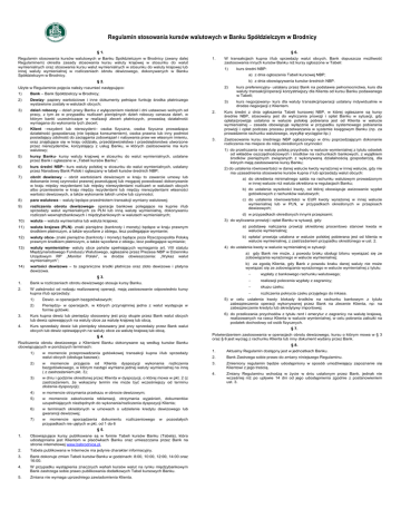 Załącznik nr 1 do Instrukcji „Zasady stosowania kursów walutowych W Banku Spółdzielczym w Brodnicy” Regulamin stosowania kursów walutowych w Banku Spółdzielczym w Brodnicy § 1. § 6. Regulamin stosowania kursów walutowych w Banku Spółdzielczym w Brodnicy (zwany dalej Regulaminem) określa zasady stosowania kursu waluty krajowej w stosunku do walut wymienialnych oraz stosowania kursu walut wymienialnych w stosunku do waluty krajowej lub innej waluty wymienialnej w rozliczeniach obrotu dewizowego, dokonywanych w Banku Spółdzielczym w Brodnicy. 1. W transakcjach kupna i/lub sprzedaży walut obcych, Bank dopuszcza możliwość zastosowania innych kursów Banku niż kursy ogłoszone w Tabeli: 1) kurs średni NBP: a) z dnia ogłoszenia Tabeli kursowej NBP; b) z dnia obowiązywania kursów średnich NBP. § 2. Użyte w Regulaminie pojęcia należy rozumieć następująco: 1) Bank – Bank Spółdzielczy w Brodnicy; 2) Dewizy- papiery wartościowe i inne dokumenty pełniące funkcję środka płatniczego wystawione zostały w walutach obcych; 3) dzień roboczy – dzień pracy Banku z wyłączeniem niedziel i dni ustawowo wolnych od pracy, z tym że w przypadku rozliczeń pieniężnych dzień roboczy oznacza dzień, w którym banki uczestniczące w realizacji zleceń płatniczych, prowadzą działalność wymagana do wykonania tych zleceń; 4) Klient –rezydent lub nierezydent– osoba fizyczna, osoba fizyczna prowadząca działalność gospodarczą (nie będąca konsumentem), osoba prawna lub inny podmiot posiadający zdolność do zaciągania zobowiązań i nabywania praw we własnym imieniu, oraz znajdujące się w kraju oddziały, przedstawicielstwa i przedsiębiorstwa utworzone przez nierezydentów, korzystający z usług Banku, w których zastosowanie ma kurs walutowy; 5) kursy Banku- kursy waluty krajowej w stosunku do walut wymienialnych, ustalane przez Bank i ogłaszane w „Tabeli kursów Banku”. 6) kurs średni NBP– kurs waluty polskiej w stosunku do walut wymienialnych, ustalany przez Narodowy Bank Polski i ogłaszany w tabeli kursów średnich NBP; 7) obrót dewizowy – obrót wartościami dewizowym w kraju to zawarcie umowy lub dokonanie innej czynności prawnej powodującej lub mogącej powodować dokonywanie w kraju między rezydentami lub między nierezydentami rozliczeń w walutach obcych albo przeniesienie w kraju między rezydentami lub między nierezydentami własności wartości dewizowych, a także wykonanie takich umów lub czynności; 2) kurs preferencyjny- ustalany przez Bank na podstawie pełnomocnictwa, kurs dla waluty transakcji/operacji korzystniejszy dla Klienta od kursu Banku podawanego w Tabeli; 3) kurs negocjowany- kurs dla waluty transakcji/operacji ustalany indywidualnie w drodze negocjacji z Klientem. 2. Kurs średni z dnia ogłoszenia Tabeli kursowej NBP, w której ogłaszane są kursy średnie NBP, stosowany jest do wyliczania prowizji i opłat Banku w sytuacji, gdy opłata/prowizja ustalona w walucie polskiej pobierana jest od Klienta w walucie wymienialnej – zasada obowiązuje wyłącznie w przypadku systemowego pobierania prowizji i opłat podczas procesu przetwarzania w systemie księgowym Banku (np. za prowadzenie rachunku walutowego, wysyłkę wyciągów itp.) 3. Zastosowanie kursu średniego NBP ogłoszonego w dniu poprzedzającym dokonanie rozliczenia ma miejsce do niżej określonych czynności: 1) do przeliczania na walutę polską przychodu w walucie wymienialnej z tytułu odsetek od wkładów oszczędnościowych i środków na rachunkach bankowych, z wyjątkiem środków pieniężnych związanych z wykonywaną działalnością gospodarczą, dla których mają zastosowanie kursy Banku; 2) do ustalenia równowartości w danej walucie kwoty wyrażonej w innej walucie, gdy nie ma uzasadnienia stosowanie kursów kupna i/ lub sprzedaży walut obcych: a) do określenia minimalnego salda na rachunku walutowym prowadzonym w innej walucie niż waluta określona w regulacjach Banku; b) do ustalenia wysokości kwoty, od której obowiązuje awizowanie wypłat gotówkowych z rachunków walutowych; c) do ustalenia równowartości w EUR kwoty wyrażonej w innej walucie wymienialnej lub w PLN, w przypadkach określonych w przepisach dewizowych; 8) para walutowa – waluty będące przedmiotem transakcji wymiany walutowej; 9) rozliczenia obrotu dewizowego- operacje bankowe polegające na kupnie i/lub sprzedaży walut wymienialnych za PLN lub inną walutę wymienialną, dokonywaniu rozliczeń wewnątrzbankowych i międzybankowych w walutach wymienialnych; 10) waluta – waluta wymienialna lub waluta krajowa; 11) waluta krajowa (PLN)- znaki pieniężne (banknoty i monety) będące w kraju prawnym środkiem płatniczym, a także wycofane z obiegu, lecz podlegające wymianie; a) podstawę naliczania prowizji określonej procentowo stanowi kwota w walucie wymienialnej; 12) waluty obce- znaki pieniężne (banknoty i monety) będące poza Rzeczpospolita Polską prawnym środkiem płatniczym, a także wycofane z obiegu, lecz podlegające wymianie; b) opłata/ prowizja ustalona w walucie polskiej pobierana jest od klienta w walucie wymienialnej, z zastrzeżeniem przypadku określonego w ust. 2. 13) waluty wymienialne- waluty obce państw spełniających wymagania art. VIII statutu Międzynarodowego Funduszu Walutowego, ogłaszane przez Prezesa NBP w Dzienniku Urzędowym RP „Monitor Polski”, w drodze obwieszczenia: „Wykaz walut wymienialnych”; 14) d) w przypadkach określonych innymi przepisami; 3) do wyliczania prowizji i opłat Banku w sytuacji, gdy: 4) do ustalenia kwoty w walucie wymienialnej w sytuacji: a) gdy Bank nie może, z powodu braku obsługi bilonu wywiązać się ze zobowiązania wyrażonego w walucie wymienialnej; b) za zgodą Klienta, gdy Bank z powodu braku danej waluty nie może wywiązać się ze zobowiązania wyrażonego w walucie wymienialnej z tytułu: wartości dewizowe – to zagraniczne środki płatnicze oraz zło