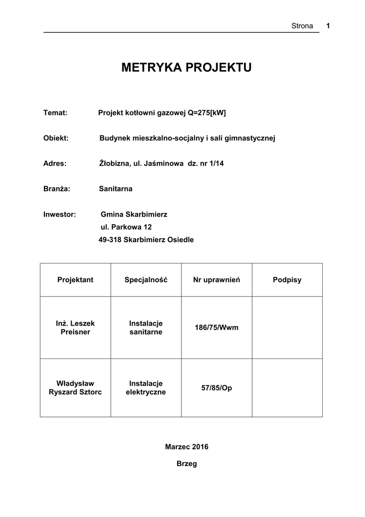 Strona METRYKA PROJEKTU Temat: Projekt kotłowni gazowej Q=275[kW] Obiekt: Budynek mieszkalno-socjalny i sali gimnastycznej Adres: Żłobizna, ul. Jaśminowa dz. nr 1/14 Branża: Sanitarna Inwestor: Gmina Skarbimierz ul. Parkowa 12 49-318 Skarbimierz Osiedle Projektant Specjalność Nr uprawnień Inż. Leszek Preisner Instalacje sanitarne 186/75/Wwm Władysław Ryszard Sztorc Instalacje elektryczne 57/85/Op Marzec 2016 Brzeg Podpisy 1 Strona ZAWARTOŚĆ OPAKOWANIA CZĘŚĆ SANITARNA Oświadczenie i dokumenty autorów projektu………………………………….strona 4 1. Opis techniczny……………………………….………………………………..strona 5 1.1. Zakres opracowania…………..……………………………………. strona 5 1.2. Podstawa opracowania………………..…………………………… strona 5 1.3. Charakterystyka obiektu………………..………………………….. strona 5 1.4. Dane techniczne……………………………..……………………... strona 6 1.5. Instalacja gazowa………………………………………………..…..strona 6 1.6. Pomieszczenie z przyborami gazowymi………………….….….…strona 7 1.6.1 .Warunek wysokości………………………………………...…...strona 7 1.6.2 .Warunek kubatury pomieszczenia …………………………..strona 7 1.6.3 .Kanały spalinowe……………………………………………..….strona 7 1.6.4 .Wentylacja technologiczna pomieszczeń……………………...strona 8 1.7. Kotłownia urządzenia……………………………………………..….strona 8 1.7.1. Armatura…………………………………………………………. strona 9 1.7.2. Rurociągi…………………………………………………………..strona 9 1.7.3. Izolacja termiczna……………………………………………….. strona 9 1.8. Wytyczne branżowe………………………………………………….. strona 9 1.8.1 .Budowlane kotłownia ……………………………………..…….strona 9 1.8.2 .Elektryczne…………………………………………………….….strona 10 1.8.3 .Przeciwpożarowe……………………………………………..….strona 10 1.8.4 .Instalacja kanalizacyjna i wodociągowa..……………………...strona 10 2. Obliczenia kotłowni…….………………………………………………………..strona 11 2.1. Zapotrzebowania na ciepło……………………………………...….. strona 11 2.2. Dobór kotła…….……………………………………………………... strona 11 2.3. Kotłownia………..……………………………………………………..strona 11 2.4. Dobór naczyń przeponowych do instalacji c.o. /PN-99/B-02414...strona 11 2.4.1. Naczynia przeponowe instalacji c.o……………………………strona 11 2.4.2. Rura wzbiorcza…………… ………………………………..….strona 12 2 Strona 2.5. Dobór zaworu bezpieczeństwa wg /PN-82/M-74101/…………….strona 12 2.5.1. Dobór zaworu bezpieczeństwa dla kotła………………..……strona 12 2.6. Wentylacja kotłowni…………………………………………………..strona 13 2.7. Dobór pomp………………………….………………………….…….strona 13 3. Obliczenia ciepłej wody…………………………………………………….…...strona 14 3.1. Zapotrzebowanie ciepła na cele c.w.u..………………………..….. strona 14 3.2. Dobór urządzenia c.w.…………………………………………..…... strona 14 3.3. Dobór pompy ładującej………………………………………...……..strona 15 3.4. Dobór pompy cyrkulacyjnej…………………………………….…….strona 16 3.5. Dobór naczynia przeponowego …………………………….:…..….strona 16 3.6. Dobór zaworu bezpieczeństwa ………………………….:……...….strona 17 4. Wykaz urządzeń kotłowni...………………………………………………...strona 19-20 5. Warunki przyłączenia G.S.G Sp. z o.o. Zd. Gazowniczy w Opolu……….. strona 21 6. Rysunki - plan sytuacyjny rys. nr 1 - rzut kotłowni rys nr 2 - przekrój kotłowni A-A , B-B rys nr 3 - schemat technologiczny kotłowni gazowej rys nr 4 - profil kanalizacji sanitarnej rys nr 5 - rzut budynku kotłowni i Sali gimnastycznej rys nr 6 7. Część elektryczna 3 Strona 4 Brzeg, dnia 20.01.2011 OŚWIADCZENIE Na podstawie art.20, ust. 4 ustawy z dnia 7 lipca 1994 r. Prawo Budowlane (jednolity tekst Dz.U. z 2006 r. Nr. 1118 z późniejszymi zmianami). Oświadczam Że projekt budowlany : Projekt przebudowy kotłowni gazowej dla Gimnazjum w Skarbimierzu Osiedle przy ul. Akacjowej 27 został sporządzony zgodnie z obowiązującymi przepisami oraz zasadami wiedzy technicznej. Projektant: Strona 5 OPIS TECHNICZNY CZĘŚĆ SANITARNA Do projektu kotłowni gazowej dla budynku mieszkalno-socjalnego i sali gimnastycznej w Żłobiźnie nr dz. nr 1/14 1.0. Zakres opracowania Opracowanie obejmuje: - projekt kotłowni gazowej Q= 275 [kW] wraz z układem c.w.u.. 2.0. Podstawa opracowania Dokumentację projektową wykonano na podstawie: - zlecenie inwestora – Gmina Skarbimierz, - wizji lokalnej w obiekcie, - obowiązujących norm i normatywów projektowania, - norm i katalogów branżowych oraz literatury fachowej. 3.0. Charakterystyka obiektu Kotłownia została zaprojektowana w projektowanym pomieszczeniu kotłowni przybudowanym do budynku sali gimnastycznej. Projekt części budowlanej wykonać wg projektu architektoniczno-budowlanego załączonego do niniejszego opracowania. Pomieszczenie kotłowni winno spełniać następujące wymagania techniczne: - wykonać wentylacje nawiewno-wywiewną. - przewód powietrzno – spalinowy koncentryczny do kotłów Ø250/350 mm - doprowadzić gaz do kotłów - wykonanie stropu REI-6O - wymienić drzwi o wymiar