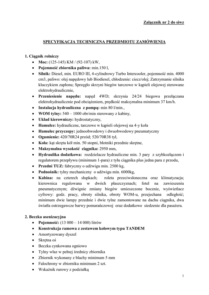Załącznik nr 2 do siwz SPECYFIKACJA TECHNICZNA PRZEDMIOTU ZAMÓWIENIA 1. Ciągnik rolniczy Moc: (125-145) KM / (92-107) kW, Pojemność zbiornika paliwa: min.150 l, Silnik: Diesel, min. EURO III, 4-cylindrowy Turbo Intercooler, pojemność min. 4000 cm3, paliwo: olej napędowy lub Biodiesel, chłodzenie: ciecz/olej; Zatrzymanie silnika kluczykiem zapłonu; Sprzęgło skrzyni biegów tarczowe w kąpieli olejowej sterowane elektrohydraulicznie, Przeniesienie napędu: napęd 4WD; skrzynia 24/24 biegowa przełączana elektrohydraulicznie pod obciążeniem, prędkość maksymalna minimum 37 km/h. Instalacja hydrauliczna z pompą: min 80 l/min., WOM tylny: 540 – 1000 obr/min sterowany z kabiny, Układ kierowniczy: hydrostatyczny, Hamulce: hydrauliczne, tarczowe w kąpieli olejowej na 4-y koła Hamulec przyczepy: jednoobwodowy i dwuobwodowy pneumatyczny Ogumienie: 420/70R24 przód; 520/70R38 tył, Koła: kąt skrętu kół min. 50 stopni, błotniki przednie skrętne, Maksymalna wysokość ciągnika: 2950 mm, Hydraulika dodatkowa: rozdzielacze hydrauliczne min. 3 pary z szybkozłączem i regulatorem przepływu (minimum 1-para) z tyłu ciągnika plus jedna para z przodu, Przedni TUZ: fabryczny o udźwigu min. 2500 kg, Podnośnik: tylny mechaniczny o udźwigu min. 6000kg, Kabina: na czterech słupkach; roleta przeciwsłoneczna oraz klimatyzacja; kierownica regulowana w dwóch płaszczyznach; fotel na zawieszeniu pneumatycznym; dźwignie zmiany biegów umieszczone bocznie, wyświetlacz cyfrowy: godz. pracy, obroty silnika, obroty WOM-u, przejechana odległość; minimum dwie lampy przednie i dwie tylne zamontowane na dachu ciągnika, dwa światła ostrzegawcze barwy pomarańczowej oraz dodatkowe siedzenie dla pasażera. 2. Beczka asenizacyjna Pojemność: (13 000 – 14 000) litrów Konstrukcja ramowa z zestawem kołowym typu TANDEM Amortyzowany dyszel Skrętna oś Beczka cynkowana ogniowo Tylny właz w pełnej średnicy zbiornika Zbiornik wykonany z blachy minimum 5 mm Falochrony w zbiorniku minimum 2 szt. Wskaźnik rurowy z podziałką 1 Stopa podporowa mechanicznie regulowana Ogumienie 19,5/22,5 Błotniki z chlapaczami Układ hamulcowy pneumatyczny Hamulec postojowy Kompresor wydajności minimum 12 000 litrów/minutę z zaworami bezpieczeństwa i tłumikiem Czas napełniania beczki max 6 minut Wałek przekaźnika mocy Rozlewak Zawór pływakowy Zbiornik przelewowy Hydrauliczny tylny zawór 6’’ (150 mm) sterowany z ciągnika Wąż 150 mm długości 10 m i 6 m. 2