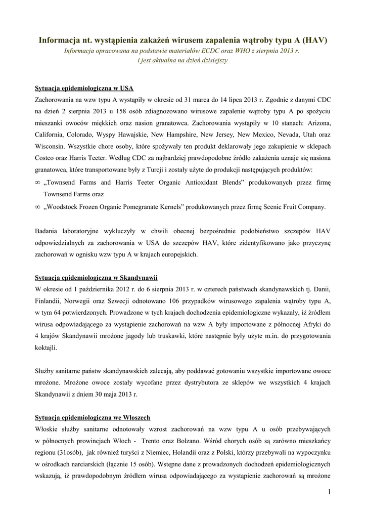 Informacja nt. wystąpienia zakażeń wirusem zapalenia wątroby typu A (HAV) Informacja opracowana na podstawie materiałów ECDC oraz WHO z sierpnia 2013 r. i jest aktualna na dzień dzisiejszy Sytuacja epidemiologiczna w USA Zachorowania na wzw typu A wystąpiły w okresie od 31 marca do 14 lipca 2013 r. Zgodnie z danymi CDC na dzień 2 sierpnia 2013 u 158 osób zdiagnozowano wirusowe zapalenie wątroby typu A po spożyciu mieszanki owoców miękkich oraz nasion granatowca. Zachorowania wystąpiły w 10 stanach: Arizona, California, Colorado, Wyspy Hawajskie, New Hampshire, New Jersey, New Mexico, Nevada, Utah oraz Wisconsin. Wszystkie chore osoby, które spożywały ten produkt deklarowały jego zakupienie w sklepach Costco oraz Harris Teeter. Według CDC za najbardziej prawdopodobne źródło zakażenia uznaje się nasiona granatowca, które transportowane były z Turcji i zostały użyte do produkcji następujących produktów: • „Townsend Farms and Harris Teeter Organic Antioxidant Blends” produkowanych przez firmę Townsend Farms oraz • „Woodstock Frozen Organic Pomegranate Kernels” produkowanych przez firmę Scenic Fruit Company. Badania laboratoryjne wykluczyły w chwili obecnej bezpośrednie podobieństwo szczepów HAV odpowiedzialnych za zachorowania w USA do szczepów HAV, które zidentyfikowano jako przyczynę zachorowań w ognisku wzw typu A w krajach europejskich. Sytuacja epidemiologiczna w Skandynawii W okresie od 1 października 2012 r. do 6 sierpnia 2013 r. w czterech państwach skandynawskich tj. Danii, Finlandii, Norwegii oraz Szwecji odnotowano 106 przypadków wirusowego zapalenia wątroby typu A, w tym 64 potwierdzonych. Prowadzone w tych krajach dochodzenia epidemiologiczne wykazały, iż źródłem wirusa odpowiadającego za wystąpienie zachorowań na wzw A były importowane z północnej Afryki do 4 krajów Skandynawii mrożone jagody lub truskawki, które następnie były użyte m.in. do przygotowania koktajli. Służby sanitarne państw skandynawskich zalecają, aby poddawać gotowaniu wszystkie importowane owoce mrożone. Mrożone owoce zostały wycofane przez dystrybutora ze sklepów we wszystkich 4 krajach Skandynawii z dniem 30 maja 2013 r. Sytuacja epidemiologiczna we Włoszech Włoskie służby sanitarne odnotowały wzrost zachorowań na wzw typu A u osób przebywających w północnych prowincjach Włoch - Trento oraz Bolzano. Wśród chorych osób są zarówno mieszkańcy regionu (31osób), jak również turyści z Niemiec, Holandii oraz z Polski, którzy przebywali na wypoczynku w ośrodkach narciarskich (łącznie 15 osób). Wstępne dane z prowadzonych dochodzeń epidemiologicznych wskazują, iż prawdopodobnym źródłem wirusa odpowiadającego za wystąpienie zachorowań są mrożone 1 jagody lub truskawki produkcji włoskiej, lecz surowiec (świeże owoce) pochodził z kilku krajów europejskich. W okresie od 2007 do 2011 r. na terenie Unii Europejskiej wystąpiło 11 ognisk zakażeń HAV. Źródłem zakażenia były skażone produkty żywnościowe, w szczególności: ryby oraz wyroby z ryb, skorupiaki, mięczaki, produkty zawierające w swoim składzie owoce morza, jak również warzywa, soki oraz podsuszane pomidory. W sierpniu oraz listopadzie 2012 r. w Holandii odnotowano zachorowanie na wzw A spowodowane spożyciem skażonych wirusem truskawek. Sytuacja epidemiologiczna w związku z zachorowaniami turystów UE powracających z podróży do Egiptu W okresie od 1 listopada 2012 r. do 5 czerwca 2013 r. odnotowano łącznie 106 przypadków zakażeń HAV wśród obywateli 15 państw UE, którzy powrócili z podróży do Egiptu. Zachorowania dotyczą obywateli następujących krajów: Dania, Estonia, Finlandia, Francja, Niemcy, Irlandia, Litwa, Łotwa, Norwegia, Słowacja, Szwecja, Szwajcaria, Holandia, oraz Wielka Brytania. Osoby te przebywały w różnych obiektach hotelowych oraz w różnych regionach turystycznych Morza Czerwonego, m.in. w Sharm-El-Sheikh, Hurghada oraz Marsa Alam i Taba-Sinai) Prowadzone jest dochodzenie epidemiologiczne, które wstępnie wskazuje na to, że źródłem zakażenia jest pokarm, który był dystrybuowany do miejsc przebywania turystów. Od lat 80-tych XX wieku, liczba zakażeń HAV nabytych w czasie podróży do Egiptu maleje. Mimo to Egipt nadal jest uznawany za kraj, w którym ryzyko nabycia tego zakażenia wciąż pozostaje wysokie, z uwagi na fakt, iż wciąż notuje się bardzo wysoki odsetek Egipcjan zakażonych wirusem. Zgodnie z danymi ECDC w okresie od 2008 do 2011 r. odnotowano łącznie 52 przypadki zachorowań na wzw typu A wśród turystów UE w związku z podróżą do Egiptu. Zaś w roku 2004 r. wystąpiło jedno z największych ognisk zakażenia wśród podróżnych powracających z Egiptu, któremu uległo ponad 350 osób. Poniżej mapa przedstawiająca dystrybucję wirusa zapalenia wątroby typu A na świecie z podziałem na regiony ze względu na ryzyko nabycia zakażenia. http://wwwnc.cdc.gov/travel/yellowbook/2012/chapter-3-infectious-diseases-related-to-travel/hepatitisa.htm WZW A jest chorobą wywoływaną przez wirus A zapalenia wątroby z rodziny Picornaviridae, który jest odporny na działanie czynników zewnętrznych, tj. temperatura, substancje chemiczne. U osób dorosłych częstym objawem zakażenia HAV jest żółtaczka, której towarzyszą objawy ogólne, tj. gorączka, brak apetytu, nudności, wymioty. Objawy te pojawiają się 2-7 tygodni od momentu zakażenia i mogą trwać nawet przez wiele tygodni. U około 15% pacjentów objawy nawracają lub trwają ciągle nawet 2 przez okres 6-9 miesięcy. U dzieci ponad 90% przypadków zakażenia tym wirusem przebiega bez objawów lub z objawami niespecyficznymi, bez żółtaczki. Ludzie są jedynym rezerwuarem wirusa wywołującego wzw typu A, który przenoszony jest głównie drogą pokarmową. Do zakażenia może dojść przez: - kontakt bezpośredni z zakażonym człowiekiem (np. przeniesienie wirusa poprzez nie umyte 