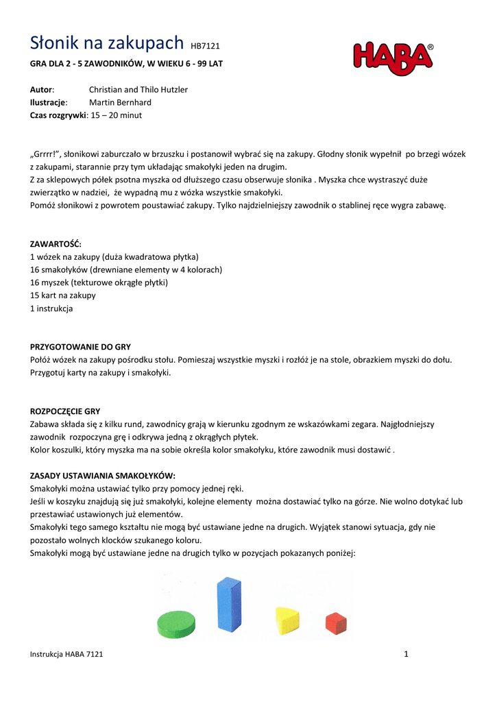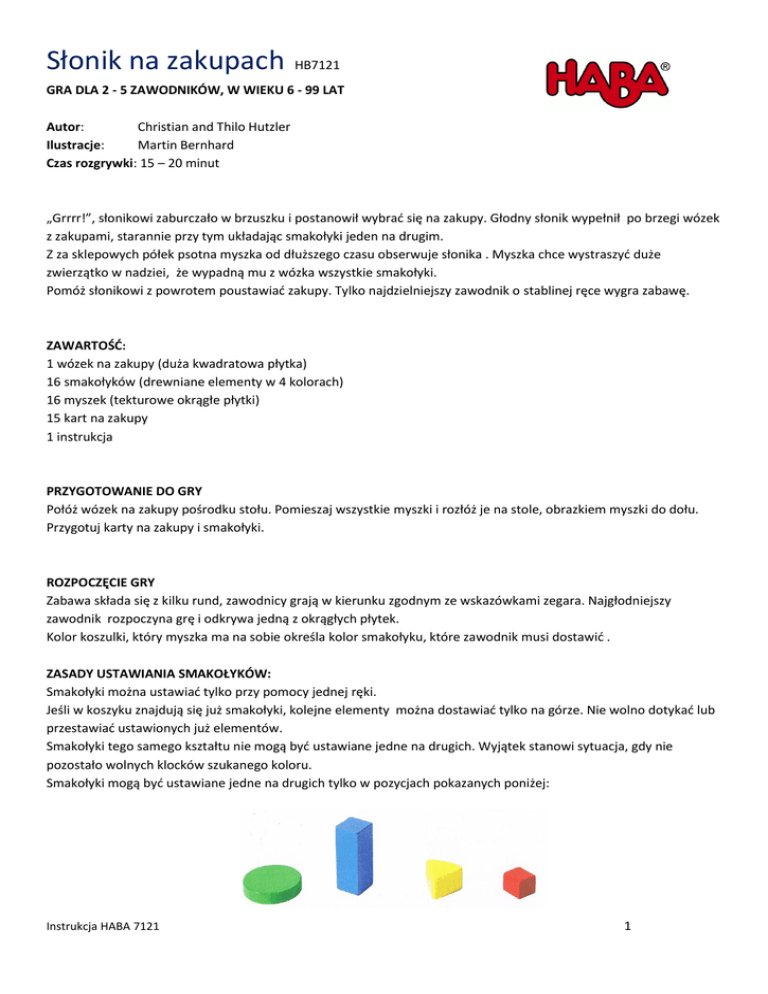 Słonik na zakupach HB7121 GRA DLA 2 - 5 ZAWODNIKÓW, W WIEKU 6 - 99 LAT Autor: Christian and Thilo Hutzler Ilustracje: Martin Bernhard Czas rozgrywki: 15 – 20 minut „Grrrr!”, słonikowi zaburczało w brzuszku i postanowił wybrać się na zakupy. Głodny słonik wypełnił po brzegi wózek z zakupami, starannie przy tym układając smakołyki jeden na drugim. Z za sklepowych półek psotna myszka od dłuższego czasu obserwuje słonika . Myszka chce wystraszyć duże zwierzątko w nadziei, że wypadną mu z wózka wszystkie smakołyki. Pomóż słonikowi z powrotem poustawiać zakupy. Tylko najdzielniejszy zawodnik o stablinej ręce wygra zabawę. ZAWARTOŚĆ: 1 wózek na zakupy (duża kwadratowa płytka) 16 smakołyków (drewniane elementy w 4 kolorach) 16 myszek (tekturowe okrągłe płytki) 15 kart na zakupy 1 instrukcja PRZYGOTOWANIE DO GRY Połóż wózek na zakupy pośrodku stołu. Pomieszaj wszystkie myszki i rozłóż je na stole, obrazkiem myszki do dołu. Przygotuj karty na zakupy i smakołyki. ROZPOCZĘCIE GRY Zabawa składa się z kilku rund, zawodnicy grają w kierunku zgodnym ze wskazówkami zegara. Najgłodniejszy zawodnik rozpoczyna grę i odkrywa jedną z okrągłych płytek. Kolor koszulki, który myszka ma na sobie określa kolor smakołyku, które zawodnik musi dostawić . ZASADY USTAWIANIA SMAKOŁYKÓW: Smakołyki można ustawiać tylko przy pomocy jednej ręki. Jeśli w koszyku znajdują się już smakołyki, kolejne elementy można dostawiać tylko na górze. Nie wolno dotykać lub przestawiać ustawionych już elementów. Smakołyki tego samego kształtu nie mogą być ustawiane jedne na drugich. Wyjątek stanowi sytuacja, gdy nie pozostało wolnych klocków szukanego koloru. Smakołyki mogą być ustawiane jedne na drugich tylko w pozycjach pokazanych poniżej: Instrukcja HABA 7121 1 Po ustawieniu smakołyku , karta z myszką pozostaje odkryta. Do gry przystępuje kolejny gracz który odkrywa dowolną kartę . Uwaga: Nie można dopuścić, aby zakupy przewróciły się! Gdy przyjdzie twoja kolej do gry i masz obawy, że nie uda ci się dostawić smakołyku, możesz zwrócić się z zapytaniem do gracza po swojej lewej stronie, czy nie chciałby ustawić twojego smakołyku na wózku. Jeśli gracz ten odmówi, możesz zapytać się po kolei reszty zawodników. Pierwsza osoba, która przyjmie wyzwanie i z powodzeniem ułoży smakołyk, w nagrodę otrzyma kartę z zakupami; jeśli natomiast podczas układania smakołyku wieża rozpadnie się, wszyscy pozostali gracze otrzymują po karcie. W sytuacji, gdy żaden z pozostałych graczy nie przyjmie wyzwania, musisz sam podjąć wyzwanie i ułożyć smakołyk w koszyku. Jeśli dostawisz smakołyk nie przewracając wieży, w nagrodę otrzymujesz kartę z zakupami; jeśli jednak wieża rozpadnie się, wszyscy oprócz ciebie otrzymują po jednej karcie. ZAKOŃCZENIE RUNDY Runda kończy się w chwili: Gracz umieścił smakołyk innego uczestnika zabawy. Wieża smakołyków przewróciła się. W tej sytuacji, wszyscy oprócz osoba która spowodowała przewrócenie się wieży, otrzymują po jednej karcie zakupów. Wszystkie smakołyki zostały poprawnie ułożone. W tej sytuacji zawodnik, który dostawiał smakołyk jako ostatni, w nagrodę otrzymuje kartę zakupów. Wszystkie smakołyki należy z powrotem położyć koło wózka z zakupami i rozpocząć nową rundę . ZAKOŃCZENIE GRY Zabawa kończy się w chwili, gdy któremuś z graczy uda się zdobyć trzy karty na zakupami, tym samym wygrywając zabawę. Możliwy jest remis. WERSJA GRY DLA POCZĄTKUJĄCYCH Zasady gry pozostają bez zmian za wyjątkiem: Każdy z uczestników zabawy otrzymuje na początku gry po trzy karty z zakupami, które kładzie przed sobą na stole. Osoba, przed ułożeniem smakołyku musi umieścić swoją kartę zakupów na wieży. Runda kończy się w chwili, gdy wieża rozpadnie się. Zawodnik, który zburzył wieżę musi odłożyć do pudełka jedną ze swoich kart z zakupami. W sytuacji, gdy wszystkie smakołyki zostały ułożone i wieża nie przewróciła się, uczestnicy gry, za wyjątkiem osoby która jako ostatnia dokładała smakołyk, muszą odłożyć po jednej karcie z zakupami. Gra kończy się w chwili, gdy któremuś z zawodników zabraknie kart z zakupami. Wygrywa osoba z największą ilością kart. Możliwy jest remis. Instrukcja HABA 7121 2