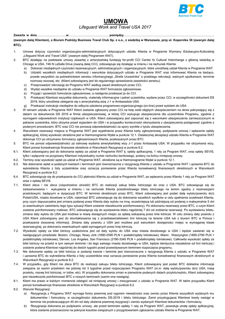 UMOWA Lifeguard Work and Travel USA 2017 Zawarta w dniu...................................w.................................................pomiędzy............................................................................................................ (zwanym dalej Klientem), a Biurem Podróży Business Travel Club Sp. z o.o., z siedzibą w Warszawie, przy ul. Kopernika 30 (zwanym dalej BTC). 1. 2. 3. 4. 5. 6.1. 6.2. 6.3. 6.4. 7.1. 7.2. 7.3. 7.4. 8.1. 8.2. Umowa dotyczy czynności organizacyjno-administracyjnych dotyczących udziału Klienta w Programie Wymiany Edukacyjno-Kulturalnej „Lifeguard Work and Travel USA” (zwanym dalej Programem WAT). BTC działając na podstawie umowy zawartej z amerykańską fundacją for-profit CCI Center fo Cultural Interchange z główną siedzibą w Chicago w USA, 746 N LaSalle Drive (zwaną dalej CCI), zobowiązuje się działając w imieniu i na rachunek Klienta: a) Dokonać niezbędnych czynności rezerwacyjnych, administracyjnych i organizacyjnych, które umożliwią udział Klienta w Programie WAT. b) Udzielić wszelkich niezbędnych informacji i warunków dotyczących udziału w Programie WAT oraz informować Klienta na bieżąco, przede wszystkim za pośrednictwem serwisu informacyjnego „Strefa Uczestnika” o przebiegu rekrutacji, ważnych spotkaniach, terminie rozmowy wizowej, etc. (Klient zobowiązany jest do regularnego sprawdzania zawartości serwisu). c) Przeprowadzić rekrutację do Programu WAT według zasad określonych przez CCI. d) Wydać wszelkie niezbędne do udziału w Programie WAT formularze zgłoszeniowe. e) Przyjąć i sprawdzić formularze zgłoszeniowe, a następnie przekazać je do CCI. f) Przekazać Klientowi wszystkie dokumenty, materiały informacyjne i pakiet uczestnika, wydane przez CCI, w szczególności dokument DS 2019, który umożliwia ubieganie się o amerykańską wizę J-1 w Ambasadzie USA. g) Przekazać instrukcje niezbędne do odbycia szkolenia programowo-organizacyjnego (on-line) przed wylotem do USA. W ramach udziału w Programie WAT Klient zostanie zgłoszony przez CCI na listę osób objętych ubezpieczeniem na okres pokrywający się z datami na dokumencie DS 2019 w firmie ubezpieczeniowej, w której CCI wykupuje ubezpieczenie dla uczestników Programu, zgodnie z wymogami odpowiednich instytucji rządowych w USA. Klient zobowiązany jest zapoznać się z warunkami ubezpieczenia zamieszczonymi w pakiecie uczestnika, który otrzyma przed wyjazdem do USA i w przypadku konieczności skorzystania z ubezpieczenia postępować zgodnie z podanymi procedurami. BTC oraz CCI nie ponoszą odpowiedzialności za spory wynikłe z tytułu ubezpieczenia. Warunkiem rezerwacji miejsca w Programie WAT jest wypełnienie przez Klienta karty zgłoszeniowej, podpisanie umowy i wpłacenie opłaty aplikacyjnej, której wysokość określona jest w Harmonogramie Wpłat w punkcie 12.1. Ostatecznej akceptacji udziału Klienta w Programie WAT dokonuje CCI po otrzymaniu formularzy zgłoszeniowych Klienta, przekazanych przez BTC. BTC nie ponosi odpowiedzialności za odmowę wydania amerykańskiej wizy J-1 przez Ambasadę USA. W przypadku nie otrzymania wizy, Klient ponosi konsekwencje finansowe określone w Warunkach Rezygnacji w punkcie 8.2. Klient zobowiązany jest do dokonania wpłaty za udział w Programie WAT tj. opłaty aplikacyjnej, 1 raty za Program WAT, oraz opłaty SEVIS, tylko i wyłącznie na przypisany Klientowi indywidualny numer rachunku bankowego, podany na końcu niniejszej umowy. Terminy oraz wysokość wpłat za udział w Programie WAT, określone są w Harmonogramie Wpłat w punkcie 12.1. Nie dokonanie wpłat w podanych kwotach i terminach jest równoznaczne z rezygnacją Klienta z udziału w Programie WAT i uprawnia BTC do wykreślenia Klienta z listy uczestników oraz oznacza poniesienie przez Klienta konsekwencji finansowych określonych w Warunkach Rezygnacji w punkcie 8.2. BTC zobowiązuje się do przekazania do CCI płatności Klienta za udział w Programie WAT, po wpłaceniu przez Klienta 1 raty za Program WAT wraz z opłatą SEVIS. Klient zleca / nie zleca (niepotrzebne skreślić) BTC do realizacji zakup biletu lotniczego do oraz z USA. BTC zobowiązuje się do zarezerwowania i wykupienia w imieniu i na rachunek Klienta przedmiotowego biletu lotniczego na termin zgodny z rezerwacjami przelotowymi, będącymi w dyspozycji BTC. W terminie określonym przez BTC, Klient zobowiązany jest podać datę wylotu/powrotu do/z Polski/USA, miasto docelowe w USA, natomiast BTC zobowiązuje się do dokonania wszelkich wysiłków w celu spełnienia oczekiwań Klienta, przy czym dopuszczalna jest zmiana podanej przez Klienta daty wylotu na inną, wcześniejszą lub późniejszą od podanej o maksymalnie 5 dni (o ewentualnym zaistnieniu tego typu sytuacji Klient zostanie niezwłocznie poinformowany). Po dokonaniu rezerwacji przez BTC, o czym Klient zostanie poinformowany mailowo, BTC zobowiązuje się do wystawienia biletu najpóźniej 7 dni od zrobienia rezerwacji. Po wystawieniu biletu, zmiana daty wylotu do USA jest możliwa w miarę dostępnych miejsc za opłatą wskazaną przez linie lotnicze. W celu zmiany daty powrotu z USA Klient zobowiązany jest do skontaktowania się z przedstawicielstwem linii lotniczej na terenie USA lub z biurem BTC w Polsce i przekazania stosownej informacji. Zmiana daty powrotu z USA jest możliwa pod warunkiem dostępności miejsc w wymaganej klasie rezerwacyjnej, po dokonaniu ewentualnych opłat wymaganych przez linię lotniczą. Wysokość opłaty za bilet lotniczy uzależniona jest od daty wylotu do USA oraz miasta docelowego w USA i będzie zawierać się w następującym przedziale: Boston, Chicago, Nowy Jork (1690-2590 PLN + podatki/opłaty lotniskowe); Miami , Waszyngton (1890-2790 PLN + podatki/opłaty lotniskowe); Denver, Los Angeles, San Francisco (2190-3340 PLN + podatki/opłaty lotniskowe). Całkowita wysokość opłaty za bilet lotniczy na przelot w tym samym terminie i