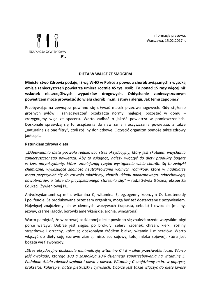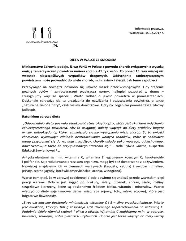 Informacja prasowa, Warszawa, 15.02.2017 r. DIETA W WALCE ZE SMOGIEM Ministerstwo Zdrowia podaje, iż wg WHO w Polsce z powodu chorób związanych z wysoką emisją zanieczyszczeń powietrza umiera rocznie 45 tys. osób. To ponad 15 razy więcej niż wskutek nieszczęśliwych wypadków drogowych. Oddychanie zanieczyszczonym powietrzem może prowadzić do wielu chorób, m.in. astmy i alergii. Jak temu zapobiec? Przebywając na zewnątrz powinno się używać masek przeciwsmogowych. Gdy stężenie groźnych pyłów i zanieczyszczeń przekracza normy, najlepiej pozostać w domu – zrezygnujmy więc ze spaceru. Warto zadbać o jakość powietrza w pomieszczeniach. Doskonale sprawdzą się tu urządzenia do nawilżania i oczyszczania powietrza, a także „naturalne zielone filtry”, czyli rośliny doniczkowe. Oczyścić organizm pomoże także zdrowy jadłospis. Ratunkiem zdrowa dieta „Odpowiednia dieta pozwala redukować stres oksydacyjny, który jest skutkiem wdychania zanieczyszczonego powietrza. Aby to osiągnąć, należy włączyć do diety produkty bogate w tzw. antyoksydanty, które zmniejszają ryzyko wystąpienia wielu chorób. Są to związki chemiczne, wykazujące zdolność neutralizowania wolnych rodników, które w nadmiarze mogą przyczyniać się do rozwoju miażdżycy, chorób układu pokarmowego, oddechowego, nowotworów, a także do przyspieszonego starzenia się.” – radzi Sylwia Górzna, ekspertka Edukacji Żywieniowej PL. Antyoksydantami są m.in. witamina C, witamina E, egzogenny koenzym Q, karotenoidy i polifenole. Są produkowane przez sam organizm, mogą być też dostarczane z pożywieniem. Najwięcej znajdziemy ich w ciemnych warzywach (kapusta, cebula) i owocach (maliny, jeżyny, czarne jagody, borówki amerykańskie, aronia, winogrona). Warto pamiętać, że w zdrowej codziennej diecie powinno się znaleźć przede wszystkim pięć porcji warzyw. Dobrze jest sięgać po brokuły, selery, czosnek, chrzan, kiełki, rośliny strączkowe i orzechy, które są doskonałym źródłem białka, witamin i minerałów. Warto włączyć do diety soję (surowe ziarna, miso, sos sojowy, tofu, mleko sojowe), która jest bogata we flawonoidy. „Stres oksydacyjny doskonale minimalizują witaminy C i E – silne przeciwutleniacze. Warto jeść awokado, którego 100 g zaspokaja 10% dziennego zapotrzebowania na witaminę E. Podobnie działa również szpinak i oliwa z oliwek. Witaminę C znajdziemy m.in. w papryce, brukselce, kalarepie, natce pietruszki i cytrusach. Dobrze jest także włączyć do diety kwasy tłuszczowe omega-3 i witaminę D. Aby tego dokonać w menu powinny znaleźć się ryby – przynajmniej 3 razy w tygodniu. Warto spożywać również tłuszcze roślinne, np. olej lniany czy oliwę z oliwek – tłoczone na zimno.” – dodaje Sylwia Górzna. Korzystnie na zdrowie wpłynie również kurkuma, zawierająca kurkuminę o właściwościach przeciwzakrzepowych, przeciwutleniających oraz przeciwnowotworowych. Oczyszczanie organizmu wesprze również zwiększenie spożycia produktów bogatych w błonnik (pełnoziarniste zboża, kasze), który oczyszcza organizm z toksyn. Do picia zaleca się niegazowaną wodę mineralną – przynajmniej 1,5 l dziennie. Watro sięgać po świeżo wyciskane soki oraz zieloną herbatę. Ograniczyć zaś spożywanie mięsa, zwłaszcza czerwonego, soli oraz produktów przetworzonych. Pozytywnie wpłynie również rezygnacja z cukru i słodyczy, które zakwaszają organizm i przyczyniają się do wielu chorób. Smog jest bardzo poważnym problemem dla mieszkańców każdej większej aglomeracji. Dobrze zbilansowana dieta pomoże walczyć ze skutkami wdychania zanieczyszczonego powietrza, cieszyć się zdrowiem i dobrym samopoczuciem. Więcej informacji: Sylwia Górzna +48 510 210 618 [email protected] Edukacja Żywieniowa.PL to projekt, którego celem jest upowszechnianie wiedzy o prawidłowym, zdrowym odżywianiu oraz pomoc w trwałej i skutecznej budowie postaw żywieniowych. Specjaliści opracowali autorskie programy edukacyjne przeznaczone dla osób w różnym wieku i o różnych potrzebach żywieniowych. Pozwalają one w krótkim czasie zdobyć zarówno teoretyczną wiedzę o odżywianiu, jak i praktyczne umiejętności związane z samodzielnym komponowaniem zdrowych, zbilansowanych posiłków. Więcej informacji: www.edukacjazywieniowa.pl