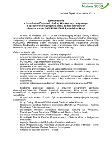 Lwówek Śląski, 16 września 2011 r. Sprawozdanie z I spotkania Zespołu Lokalnej Współpracy związanego z opracowaniem projektu planu zadań ochronnych obszaru Natura 2000 PLH020009 Panieńskie Skały W dniu 16 września 2011 r. w sali konferencyjnej Urzędu Gminy i Miasta w Lwówku Śląskim odbyło się I spotkanie dyskusyjne Zespołu Lokalnej Współpracy związanego z opracowaniem projektu planu zadań ochronnych obszaru Natura 2000 PLH020009 Panieńskie Skały. Warsztaty zorganizowała Regionalna Dyrekcja Ochrony Środowiska we Wrocławiu wraz z wykonawcą planu zadań ochronnych Biurem Urządzania Lasu i Geodezji Leśnej Oddział w Brzegu. Celem spotkania było: wyłonienie członków Zespołu Lokalnej Współpracy; omówienie zasad pracy nad projektem planu zadań ochronnych; przedstawienie obecnego stanu wiedzy o obszarze Panieńskie Skały PLH020009 i jego przedmiotów ochrony; zebranie od uczestników warsztatów informacji o obszarze i znanych im problemów z nim związanych; omówienie granic obszaru i zasad uszczegóławiania ich przebiegu; prezentacja wniosków z analizy zagospodarowania przestrzennego gminy i innych dokumentów planistycznych; analiza mocnych i słabych stron, szans i zagrożeń związanych z obszarem; ustalenie celów działań ochronnych i listy koniecznych do podjęcia działań ochronnych ustalenie zakresu prac na dalszych etapach sporządzania projektu PZO. Spotkanie przebiegło zgodnie z przyjętym programem spotkania dyskusyjnego/warsztatu Zespołu Lokalnej Współpracy, który został przesłany uczestnikom w zaproszeniach i jeszcze raz zaprezentowany na początku warsztatów. W spotkaniu wzięło 13 osób. Byli to reprezentanci następujących instytucji i podmiotów: • Urząd Gminy i Miasta (UGiM) Lwówek Śląski – Lesław Krokosz • Regionalna Dyrekcja Ochrony Środowiska (RDOŚ) we Wrocławiu – Andrzej Ruszlewicz (planista regionalny) • Dolnośląski Ośrodek Doradztwa Rolniczego (DODR) we Wrocławiu, Powiatowy Zespół Doradców (PZD) Lwówek Śląski – Andrzej Larek • Starostwo Powiatowe w Lwówku Śląskim – Alicja Cybulska • Dolnośląski Zespół Parków Krajobrazowych o/Jelenia Góra – Małgorzata Pikożyńska • Agencja Nieruchomości Rolnych – Kazimierz Matkowski • Biuro Urządzania Lasu i Geodezji Leśnej (BULiGL) Oddział w Brzegu – Anna Wójcicka-Rosińska, Dariusz Rosiński (koordynator) • Właściciele prywatni gruntów – 5 osób. Spotkanie rozpoczęło się powitaniem gości przez pana Lesława Krokosza – naczelnika Wydziału Gospodarki Przestrzennej, Nieruchomościami oraz Rolnej i Ochrony Środowiska Urzędu Gminy i Miasta Lwówek Śląski i przedstawieniem zgromadzonym przedstawiciela Regionalnej Dyrekcji Ochrony Środowiska we Wrocławiu oraz wykonawców projektu Planu Zadań Ochronnych obszaru Natura 2000 Panieńskie Skały. Następnie w imieniu Regionalnej Dyrekcji Ochrony Środowiska we Wrocławiu oraz Biura Urządzania Lasu i Geodezji Leśnej Oddział w Brzegu zaproszonych gości powitał Andrzej Ruszlewicz. Dalej zaprezentował plan spotkania, omówił poszczególne jego punkty i zapytał o zgodę uczestników, co do proponowanego przebiegu spotkania. Nikt spośród zgromadzonych nie wniósł uwag w tym zakresie. Po sporządzeniu listy obecności rozpoczęła się pierwsza prezentacja dotycząca zagadnień związanych z podstawami prawnymi funkcjonowania sieci Natura 2000 oraz sporządzania planów zadań ochronnych dla obszarów Natura 2000. Andrzej Ruszlewicz RDOŚ we Wrocławiu (planista regionalny) przedstawił prezentację pt.: „Celowość wprowadzania sieci obszarów chronionych Natura 2000”, w której wyjaśnił ideę sieci Natura 2000 i proces wprowadzania tego programu na obszarze Polski. Prelegent przedstawił m.in. skuteczność prac nad programem w naszym kraju oraz ich jakość na tle pozostałych krajów Unii Europejskiej. Ponadto wskazał na podstawowe akty prawne określające funkcjonowanie sieci. Następnie przedstawił zasady tworzenia planów zadań ochronnych i aktualny stan zaawansowania prac nad tego typu planami w Polsce. Kolejnym punktem programu była prezentacja dotycząca samego obszaru Natura 2000 PLH020009 Panieńskie Skały i jego przedmiotów ochrony. Anna Wójcicka-Rosińska BULiGL Oddział w Brzegu W prezentacji pt.: „Specjalny Obszar Ochrony Natura 2000 Panieńskie Skały PLH020009” prelegentka przedstawiła informacje zawarte w Standardowym Formularzu Danych (SDF) obszaru i scharakteryzowała jego przedmioty ochrony. Wskazała również na położenie przedmiotów ochrony względem podziału na działki ewidencyjne obszaru ostoi. Przy okazji charakterystyki siedlisk wytłumaczyła rozbieżności pomiędzy informacjami w SDF-ie a rzeczywistym stanem potwierdzonym w czasie weryfikacji terenowych. Następnie zaprezentowała chronione krajowym prawem gatunki roślin występujące na siedliskach przyrodniczych. W prezentacji zaproponowano włączenie na listę przedmiotów ochrony nowego siedliska – 6510. Wskazano również na konieczność skorygowania pierwotnej zawartości SDF dotyczącej rzeczywistego udziału poszczególnych siedlisk przyrodniczych w powierzchni ostoi. Po prezentacji rozpoczęła się dyskusja, w której właściciele nieruchomości, (szczególnie ci, na których gruncie znajdowało się proponowane do włączenia jako przedmiot ochrony siedlisko 6510), pytali o konsekwencje faktu istnienia na ich działkach przedmiotów ochrony oraz o ograniczenia, jakie będą mieli z tego tytułu. Anna Wójcicka-Rosińska BULiGL Oddział w Brzegu W odpowiedzi na pytania o ograniczenia w użytkowaniu gruntów, na których znajdują się przedmioty ochrony wyjaśniła, że w przypadku gruntów leśnych (siedlisko 9170, grunty gminne) ograniczenia dotyczą sposobu gospodarowania, które w tym szczególnym przypadku będzie wykluczało pozyskanie drewna i ograniczało się do usuwania istniejących i pojawiających się zagrożeń w istniej