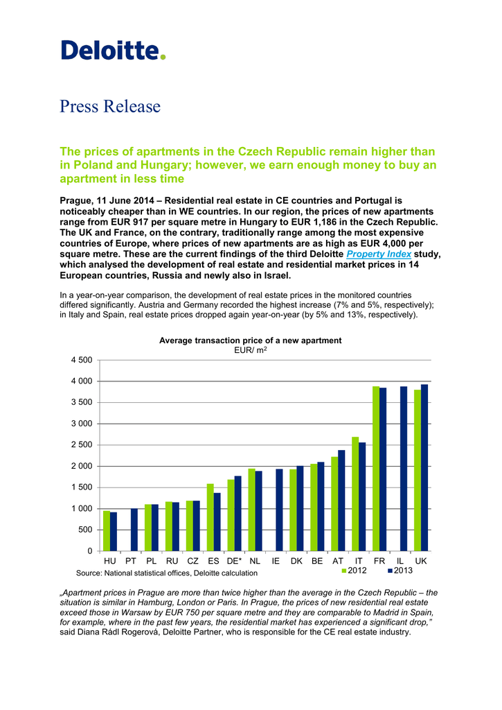 Press Release The prices of apartments in the Czech Republic remain higher than in Poland and Hungary; however, we earn enough money to buy an apartment in less time Prague, 11 June 2014 – Residential real estate in CE countries and Portugal is noticeably cheaper than in WE countries. In our region, the prices of new apartments range from EUR 917 per square metre in Hungary to EUR 1,186 in the Czech Republic. The UK and France, on the contrary, traditionally range among the most expensive countries of Europe, where prices of new apartments are as high as EUR 4,000 per square metre. These are the current findings of the third Deloitte Property Index study, which analysed the development of real estate and residential market prices in 14 European countries, Russia and newly also in Israel. In a year-on-year comparison, the development of real estate prices in the monitored countries differed significantly. Austria and Germany recorded the highest increase (7% and 5%, respectively); in Italy and Spain, real estate prices dropped again year-on-year (by 5% and 13%, respectively). Average transaction price of a new apartment EUR/ m2 4 500 4 000 3 500 3 000 2 500 2 000 1 500 1 000 500 0 HU PT PL RU CZ ES DE* NL Source: National statistical offices, Deloitte calculation IE DK BE AT IT FR 2012 IL UK 2013 „Apartment prices in Prague are more than twice higher than the average in the Czech Republic – the situation is similar in Hamburg, London or Paris. In Prague, the prices of new residential real estate exceed those in Warsaw by EUR 750 per square metre and they are comparable to Madrid in Spain, for example, where in the past few years, the residential market has experienced a significant drop,” said Diana Rádl Rogerová, Deloitte Partner, who is responsible for the CE real estate industry. Munich in Bavaria, the most expensive German city in respect of purchasing real estate, reached an average price of EUR 5,600 per square metre in 2013. Together with Moscow, where the price of a new apartment is at EUR 4,200 per square metre, they exceed the average prices in their countries by more than three times. London and Paris remain the most expensive cities in Europe. The average price for purchasing an apartment near the centre of London is over EUR 10,000 per square metre. In Paris, the average market prices of older apartments have reached EUR 8,140 per square metre. Budapest, Lisbon and Warsaw ranked at the other end of the spectrum – with prices of EUR 1,140, 1,640 a 1,704 per square metre, respectively, they represented the cheapest capitals in 2013. In the majority of the compared countries, the prices of older apartments are lower than those of new ones – the difference being as high as 49% in Hungary. Only Portugal and the United Kingdom displayed the opposite: prices of older flats were 17% and 6% higher. Among the monitored countries, the most significant year-on-year drop in prices was recorded in Madrid (-24.8%), Rome (-5.6%) and Budapest (-4.8%). The highest year-on-year increase, on the other hand, took place in Vienna (+9.1%), Copenhagen (+8.8%) and Berlin (+7.1%). Jerusalem in Israel was specific by displaying the highest speed of price growth for new real estate property yearon-year (+13.3%). “The accessibility of own living varies significantly in the monitored countries. While in Denmark, you only need a 2.1 multiple of the average gross annual earnings to be able to buy new residential property, in the Czech Republic, the number is a 7.2 multiple, similarly to Poland and Hungary with a 7.4 multiple. If you want to buy a new flat in Israel, you have to count on saving 12 annual salaries,” added Petr Hána, Manager at Deloitte in the real estate and construction industry. Accessibility of own living Number of average gross annual salaries needed to purchase a standard apartment (70 m2), 2013 14,0 12,0 10,0 8,0 6,0 4,0 2,0 0,0 DK DE PT BE NL IE ES AT CZ IT HU PL FR UK RU IL Source: National statistical offices, Deloitte calculation An important indicator of the residential market is also the indebtedness of the housing stock. In 2013, the EU average was at 52%; however. the values for individual countries differed considerably. The country with the lowest indebtedness was Russia (3%), followed by a group of transition economies – the Czech Republic, Poland and Hungary – with 14, 20 and 21%, respectively. The highest values of indebtedness of over 100% were recorded by the traditionally stable and saturated residential markets of the Netherlands and Denmark, which also offer well-functioning mortgage markets. Residential market development in selected European countries In 2013, the average EU housing stock increased slightly to almost 476 apartments per 1,000 inhabitants. Spain boasts the largest housing stock out of the compared countries (18% above the EU average); Poland, on the other hand, has the lowest housing stock (25% below the EU average). If we include non-European housing stock in the comparison, the lowest value is found in Israel, where, however, massive construction of apartments is under way (the number of completed apartments per 1,000 inhabitants exceeded the EU average more than twice in 2013). A large intensity of housing development has also been characteristic for Poland, where it exceeded the EU average by more than 50%. The country with the highest housing development intensity in 2013 was Russia (6.5 completed apartments per 1,000 inhabitants). Among European countries, France had the highest housing development intensity (5 completed apartments per 1,000 inhabitants), closely followed by Austria (4.7 completed apartments per 1,000 inhabitants). The country with the highest housing stock, Spain, continued in the decline in housing construction, where the intensity was 45% lower than the European average. The lowest housing development intensity of 2013 was recorded in Hungary (0.7 completed apartments per 1,000 inhabitants), which is alm