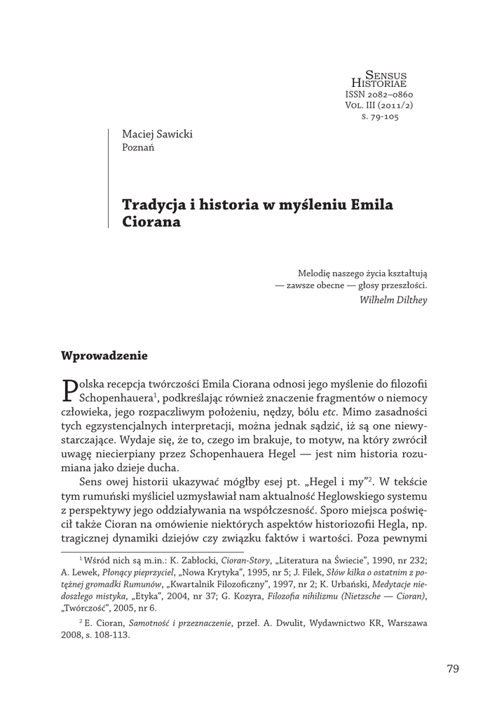 SENSUS HISTORIAE ISSN 2082–0860 Vol. III (2011/2) s. 79-105 Maciej Sawicki Poznań Tradycja i historia w myśleniu Emila Ciorana Melodię naszego życia kształtują — zawsze obecne — głosy przeszłości. Wilhelm Dilthey Wprowadzenie P olska recepcja twórczości Emila Ciorana odnosi jego myślenie do filozofii Schopenhauera1, podkreślając również znaczenie fragmentów o niemocy człowieka, jego rozpaczliwym położeniu, nędzy, bólu etc. Mimo zasadności tych egzystencjalnych interpretacji, można jednak sądzić, iż są one niewystarczające. Wydaje się, że to, czego im brakuje, to motyw, na który zwrócił uwagę niecierpiany przez Schopenhauera Hegel — jest nim historia rozumiana jako dzieje ducha. Sens owej historii ukazywać mógłby esej pt. „Hegel i my”2. W tekście tym rumuński myśliciel uzmysławiał nam aktualność Heglowskiego systemu z perspektywy jego oddziaływania na współczesność. Sporo miejsca poświęcił także Cioran na omówienie niektórych aspektów historiozofii Hegla, np. tragicznej dynamiki dziejów czy związku faktów i wartości. Poza pewnymi 1 Wśród nich są m.in.: K. Zabłocki, Cioran-Story, „Literatura na Świecie”, 1990, nr 232; A. Lewek, Płonący pieprzyciel, „Nowa Krytyka”, 1995, nr 5; J. Filek, Słów kilka o ostatnim z potężnej gromadki Rumunów, „Kwartalnik Filozoficzny”, 1997, nr 2; K. Urbański, Medytacje niedoszłego mistyka, „Etyka”, 2004, nr 37; G. Kozyra, Filozofia nihilizmu (Nietzsche — Cioran), „Twórczość”, 2005, nr 6. 2 E. Cioran, Samotność i przeznaczenie, przeł. A. Dwulit, Wydawnictwo KR, Warszawa 2008, s. 108-113. 79 Maciej Sawicki krytycznymi uwagami pisał Cioran o Heglu z szacunkiem, twierdząc, że był „ojcem nauk humanistycznych” oraz „ostatnim wielkim filozofem”. Ta postawa pokazywałaby zatem, że artefakty myśli nie były mu obojętne. Dlatego historia ducha jest historią czytania tych artefaktów. Celem niniejszej pracy jest opisanie specyfiki namysłu Ciorana. Punktem wyjścia będzie zgłębienie Cioranowskich rozważań o dziejowym początku objawionym w tradycji biblijnej oraz zaproponowanej przez niego interpretacji. Następnie przedstawimy jego rozmyślania o naturalnym charakterze bytu człowieka jako potwierdzenie wyobrażeń zaczerpniętych z religii. Pozwoli to nam pokazać, jak myśliciel rozumiał historię oraz historiografię oraz z jakiej tradycji myślowej wydobył podstawowe dla jego myślenia kategorie historiozoficzne. W ostatniej części spróbujemy, wykorzystując wcześniejsze ustalenia, nakreślić jego projekt dziejów ducha filozofii. Dwie opowieści o początku dziejów Cioranowska refleksja nad genezą historii, ukazując bogactwo nawiązań do wielkich tradycji, stanowi problem dla wszelkiego usystematyzowania. Czy można wskazać jakieś główne źródło tej problematyczności, czy raczej jest ich wiele? Pytanie to komplikuje eklektyzm Emila Ciorana, przez co nie do końca można określić jego stosunek do mityczno-religijnych przekazów. Z jednej strony powie ktoś, że były to tylko fantazje sceptyka. Takie spojrzenie pozwoliłoby zaprezentować mnogość literackich odniesień do mitów początku. Lecz mogłoby również prowadzić do wniosku, że pisarz bawił się tradycją, która stanowiła jedynie pretekst dla jego pisarstwa. Ten sposób prowadzenia interpretacji pomijałby zagadkę dramatu egzystencji, która była jednym z ważniejszych tematów twórczości Ciorana. Dlatego z drugiej strony można stwierdzić przeciwnie, że tradycja stanowiła dla niego prawdziwą odpowiedź. Rozwiązanie to wprawdzie porządkuje Cioranowskie odniesienie do początków dziejów, ale zarazem zubaża możliwą interpretację, ponieważ pomija cały kontekst wątpliwości filozofa. Poza dwoma wspomnianymi ujęciami istnieje jednak trzecia możliwa interpretacja myśli Ciorana, która daje obraz jego dramatycznych poszukiwań źródłowego sensu historii i celu dziejów. „Kres historii — pisał — wpisany jest w jej początki”3. Zapytywanie o genezę jest więc zarazem pytaniem o zasadę, która pozwalałaby zrozumieć ludzką tragedię. Odpowiedzi, jakie niesie w tej kwestii tradycja, różnią się zasadniczo pojęciem początku. Są jednak 3 s. 99. 80 E. Cioran, Sylogizmy goryczy, przeł. I. Kania, Wydawnictwo Aletheia, Warszawa 2009, Tradycja i historia w myśleniu Emila Ciorana one zgodne w tym, że historyczna sytuacja człowieka jest ściśle związana z losem określonego boga. Sprawą sporną będzie natomiast sens winy za początek historii, ponieważ raz odpowiedzialny będzie człowiek, innym razem — bóstwo. Zarysowana charakterystyka nawiązuje do dwóch wielkich tradycji religijnych, które Cioran podejmuje w Upadku w czas (1964) i w Złym demiurgu (1969). Pierwsza z opowieści przedstawia początek dziejów jako skutek grzechu nieposłuszeństwa człowieka wobec boskiego zakazu spożywania owocu z Drzewa Poznania. Wraz ze złamaniem nałożonych na niego ograniczeń zostaje wyrzucony z raju wiecznego szczęścia. Tym samym, kończąc bycie w teraźniejszości, upada w czas, czyli w historię. Lecz szczególnie istotny jest aspekt wyboru porzucenia dobrostanu ze względu na motywację pierwszego człowieka. Emil Cioran wylicza kilka czynników, które mogły go do tego pobudzić: pragnienie czegoś nowego (będące następstwem nudy), niezadowolenie z siebie czy też pierwotna niewygoda.4 Myśliciel odchodzi tutaj od biblijnej tradycji i snuje swoje heretyckie przypuszczenia. Spróbujmy je przybliżyć. Filozof doszukiwał się np. Edenu w miłosnym uczuciu. Pisał: „A kiedy Adam stracił zmysł szczęścia, Raj skrył się w oczach Ewy”5. Początek dziejów będzie więc wynikiem niezrealizowanej miłości pierwszego mężczyzny. Czytamy w różnych fragmentach: „Gdyby Adam był szczęśliwy w miłości, oszczędziłby nam Historii”6; „Wszystko, co nazywamy p r o c e s e m h i s t o r y c z n y m ,