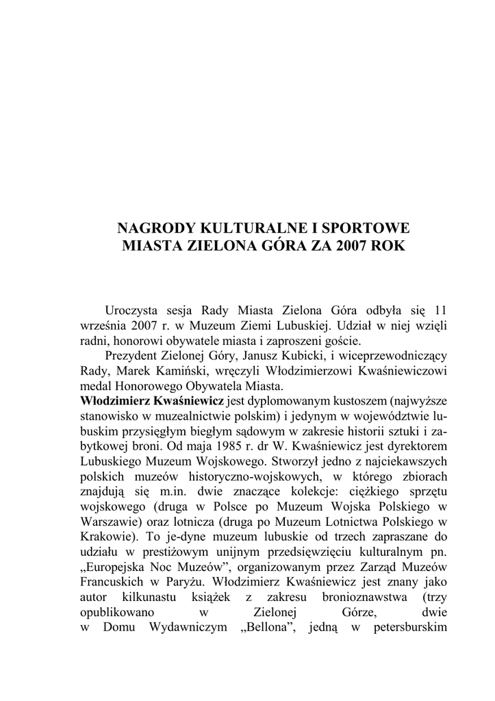 NAGRODY KULTURALNE I SPORTOWE MIASTA ZIELONA GÓRA ZA 2007 ROK Uroczysta sesja Rady Miasta Zielona Góra odbyła się 11 września 2007 r. w Muzeum Ziemi Lubuskiej. Udział w niej wzięli radni, honorowi obywatele miasta i zaproszeni goście. Prezydent Zielonej Góry, Janusz Kubicki, i wiceprzewodniczący Rady, Marek Kamiński, wręczyli Włodzimierzowi Kwaśniewiczowi medal Honorowego Obywatela Miasta. Włodzimierz Kwaśniewicz jest dyplomowanym kustoszem (najwyŜsze stanowisko w muzealnictwie polskim) i jedynym w województwie lubuskim przysięgłym biegłym sądowym w zakresie historii sztuki i zabytkowej broni. Od maja 1985 r. dr W. Kwaśniewicz jest dyrektorem Lubuskiego Muzeum Wojskowego. Stworzył jedno z najciekawszych polskich muzeów historyczno-wojskowych, w którego zbiorach znajdują się m.in. dwie znaczące kolekcje: cięŜkiego sprzętu wojskowego (druga w Polsce po Muzeum Wojska Polskiego w Warszawie) oraz lotnicza (druga po Muzeum Lotnictwa Polskiego w Krakowie). To je-dyne muzeum lubuskie od trzech zapraszane do udziału w prestiŜowym unijnym przedsięwzięciu kulturalnym pn. „Europejska Noc Muzeów”, organizowanym przez Zarząd Muzeów Francuskich w ParyŜu. Włodzimierz Kwaśniewicz jest znany jako autor kilkunastu ksiąŜek z zakresu bronioznawstwa (trzy opublikowano w Zielonej Górze, dwie w Domu Wydawniczym „Bellona”, jedną w petersburskim 214 wydawnictwie „Atlant”, gdzie przygotowane są do druku kolejne dwie publikacje). Dr Kwaśniewicz jest takŜe znanym działaczem społecznym, członkiem wielu stowarzyszeń i organizacji. Wielokrotnie był odznaczany i wyróŜniany – m.in. Nagrodą Kulturalną Miasta Zielona Góra za lata 1993 i 2004, Nagrodą Naukową Miasta Zielona Góra za 2001 r. oraz Złotym i Srebrnym KrzyŜem Zasługi w 1998 r. Podczas sesji gospodarze miasta wręczyli nagrody kulturalne i sportowe przyznane za rok 2007. Indywidualne nagrody kulturalne otrzymali: Andrzej Toczewski – dyrektor Muzeum Ziemi Lubuskiej, redaktor naczelny pisma popularnonaukowego ,,Studia Zielonogórskie”. Inicjator powstania w Muzeum galerii Tadeusza Kuntzego-Konicza, wybitnego XVIII-wiecznego malarza urodzonego w Zielonej Górze. Pomysłodawca i realizator pierwszego i jedynego w Polsce Muzeum Wina, ekspozycji poświęconej historii Zielonej Góry oraz Muzeum Dawnych Tortur. Ewa Lewandowska – autorka scenariuszy, tekstów piosenek, wierszy i opiekun młodych poetów, skupionych w grupie poetyckiej Klub Szufladera w Domu Harcerza. Autorka inicjatyw poetyckich organizowanych w Zielonej Górze. Robert Rudiak – poeta, prozaik, publicysta, krytyk literacki, historyk literatury, regionalista. Autor 12 ksiąŜek, laureat konkursów literackich. Mieczysław Warszawski – autor tomików wierszy, opowiadań i powieści. Laureat licznych nagród w konkursach poetyckich i prozatorskich. Uprawia równieŜ twórczość dla dzieci. Tadeusz Krupa – znany lubuski dziennikarz radiowy, wieloletni redaktor naczelny i prezes Radia Zachód. Inicjator audycji promujących zielonogórską kulturę i jej twórców. Agata Buchalik-Drzyzga – artysta plastyk. Związana z Zieloną Górą od 1968 roku. Uprawia głównie tkaninę artystyczną, grafikę i malarstwo; jej prace znajdują się w zbiorach prywatnych i państwowych na całym świecie. Wielokrotnie nagradzana. W tym roku obchodzi 40-lecie pracy twórczej. 215 Janusz Skiba – artysta plastyk. Mieszka i tworzy w Zielonej Górze od 1963 roku. Uczestnik wielu wystaw indywidualnych i zbiorowych w kraju i za granicą. Uprawia głównie grafikę i malarstwo. W bieŜącym roku obchodzi 75-lecie urodzin. Małgorzata Bukowicz – artysta i pedagog. Od wielu lat związana ze środowiskiem lubuskich plastyków. Uprawia rysunek, malarstwo, rzeźbę i ceramikę. Projektuje witraŜe. Swoje prace prezentowała na wystawach indywidualnych i zbiorowych w kraju i za granicą. Od 1987 roku prowadzi w Domu Harcerza w Zielonej Górze sekcję ceramiki. Marzena Więcek – zielonogórska poetka, dramatopisarka, reŜyser, autorka scenariuszy, reportaŜy radiowych, animatorka kultury. Laureatka wielu ogólnopolskich i międzynarodowych konkursów literackich i filmowych. Pomysłodawczyni i realizatorka Ogólnopolskiego Konkursu Literackiego im. Marka Garbali oraz Międzynarodowego Festiwalu Kina Autorskiego. Zespołową nagrodę kulturalną otrzymała: Formacja SPOKO ze Studia Trans Filipa Czeszyka w Zielonej Górze, 20-osobowa grupa uczniów i studentów Uniwersytetu Zielonogórskiego, którzy uprawiają taniec hip-hop. Laureaci wielu krajowych i międzynarodowych konkursów i turniejów tanecznych. Mistrzowie Polski w Tańcu Hip-Hop w 2006 oraz wicemistrzowie w 2007 roku. W 2005 roku formacja zajęła 5. miejsce na Mistrzostwach Świata w Niemczech. Laureaci nagród sportowych: za wybitne wyniki uzyskane w dyscyplinach indywidualnych Radosław Kawęcki – wychowanek KS „Korner Novita 10”. W przeciągu niespełna roku ustanowił 6 rekordów kraju w kategorii 15 i 16 lat na dystansach 50, 100 i 200 metrów. Do niego naleŜy najlepszy wynik wśród juniorów młodszych w Europie. 216 Grzegorz Walasek – czołowy zawodnik Zielonogórskiego Klubu śuŜlowego, aktualny wicemistrz Europy seniorów. Zdobywca Złotego Kasku w sezonie 2007. DruŜynowy mistrz świata. Robert Floras – tenisista stołowy, reprezentant Zielonogórskiego Klubu Sportowego w Drzonkowie. Czołowy zawodnik I ligi, członek kadry Polski kadetów. Mistrz Polski kadetów. DruŜynowy zdobywca srebrnego i brązowego medalu w deblu. Brązowy medalista Mistrzostw Europy Kadetów 2007, indywidualnie i druŜynowo brązowy medalista międzynarodowych mistrzostw kadetów. Paweł Fertikowski – tenisista stołowy, reprezentant Zielonogórskiego Klubu Sportowego w Drzonkowie. Członek kadry narodowej juniorów, zawodnik ekstraklasy. Złoty medalista mistrzostw Polski juniorów w deblu i mixie, srebrny w druŜynie i brązowy indywidualnie. Małgorzata Kowala – reprezentantka 