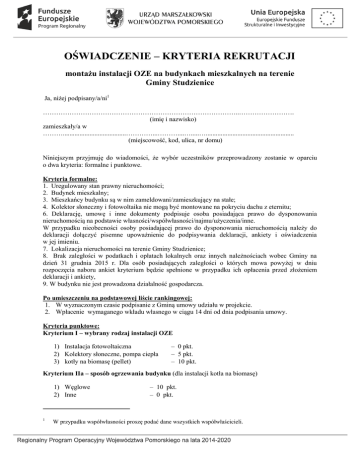 OŚWIADCZENIE – KRYTERIA REKRUTACJI montażu instalacji OZE na budynkach mieszkalnych na terenie Gminy Studzienice Ja, niżej podpisany/a/ni1 ……………………………………………………………………………..……………………. (imię i nazwisko) zamieszkały/a w ………......................................…………...………....….....…..................................................... (miejscowość, kod, ulica, nr domu) Niniejszym przyjmuję do wiadomości, że wybór uczestników przeprowadzony zostanie w oparciu o dwa kryteria: formalne i punktowe. Kryteria formalne: 1. Uregulowany stan prawny nieruchomości; 2. Budynek mieszkalny; 3. Mieszkańcy budynku są w nim zameldowani/zamieszkujący na stałe; 4. Kolektor słoneczny i fotowoltaika nie mogą być montowane na pokryciu dachu z eternitu; 6. Deklarację, umowę i inne dokumenty podpisuje osoba posiadająca prawo do dysponowania nieruchomością na podstawie własności/współwłasności/najmu/użyczenia/inne. W przypadku nieobecności osoby posiadającej prawo do dysponowania nieruchomością należy do deklaracji dołączyć pisemne upoważnienie do podpisywania deklaracji, ankiety i oświadczenia w jej imieniu. 7. Lokalizacja nieruchomości na terenie Gminy Studzienice; 8. Brak zaległości w podatkach i opłatach lokalnych oraz innych należnościach wobec Gminy na dzień 31 grudnia 2015 r. Dla osób posiadających zaległości o których mowa powyżej w dniu rozpoczęcia naboru ankiet kryterium będzie spełnione w przypadku ich opłacenia przed złożeniem deklaracji i ankiety, 9. W budynku nie jest prowadzona działalność gospodarcza. Po umieszczeniu na podstawowej liście rankingowej: 1. W wyznaczonym czasie podpisanie z Gminą umowy udziału w projekcie. 2. Wpłacenie wymaganego wkładu własnego w ciągu 14 dni od dnia podpisania umowy. Kryteria punktowe: Kryterium I – wybrany rodzaj instalacji OZE 1) Instalacja fotowoltaiczna 2) Kolektory słoneczne, pompa ciepła 3) kotły na biomasę (pellet) – 0 pkt. – 5 pkt. – 10 pkt. Kryterium IIa – sposób ogrzewania budynku (dla instalacji kotła na biomasę) 1) Węglowe 2) Inne 1 – 10 pkt. – 0 pkt. W przypadku współwłasności proszę podać dane wszystkich współwłaścicieli. Kryterium IIb – sposób ogrzewania ciepłej wody użytkowej – c.w.u. (dla kolektorów słonecznych + pomp ciepła) 1) Węglowe 2) Inne – 10 pkt. – 0 pkt. Kryterium III – wielkość projektowanej instalacji (max liczba punktów -10 pkt. ): Kryterium będzie rozpatrywane odrębnie dla każdego rodzaju wnioskowanej instalacji OZE. Liczba pkt. wyliczana będzie wg wzoru: P = Mmin / Mw * 10 Gdzie: P – liczba przyznanych punktów Mmin – instalacja o najniższej mocy Mw – moc instalacji Wnioskodawcy Kryterium IV – gospodarstwa dotknięte problemem ubóstwa energetycznego W kryterium można uzyskać 2 pkt. za spełnienie co najmniej jednego z poniższych warunków: 1) posiadane prawo do dodatku mieszkaniowego lub energetycznego lub 2) otrzymanie w ciągu 12 miesięcy poprzedzających złożenie wniosku o dofinansowanie pomocy rzeczowej w postaci opału lub ryczałtu na jego zakup lub 3) zameldowanie w gospodarstwie domowym co najmniej jednej osoby z orzeczeniem o niepełnosprawności2 lub 4) posiadanie przez zameldowanych członków gospodarstwa domowego prawa do świadczenia rodzinnego lub 5) W gospodarstwie zameldowana jest rodzina wielodzietna (co najmniej 3 dzieci) – zgodnie z ustawą o świadczeniach rodzinnych lub zameldowana jest rodzina zastępcza Kryteria powyższe muszą pozostać spełnione również na dzień złożenia wniosku o dofinansowanie (IV kwartał br.) i będą weryfikowane. Wybór Uczestników projektu przebiegał będzie dwuetapowo: W pierwszej kolejności złożona deklaracja wraz z załącznikami sprawdzona zostanie pod względem poprawności formalnej i kompletności informacji. Każdemu Uczestnikowi projektu, który uzyska pozytywną ocenę formalną złożonych dokumentów, przypisane zostaną punkty wg kryteriów 2 W przypadku osób z orzeczoną niepełnosprawnością należy przedstawić oświadczenie dotyczące zamieszkania (zameldowania na stałe) osób niepełnosprawnych z orzeczoną niepełnosprawnością. punktowych. Na tej podstawie utworzona zostanie „lista rankingowa” począwszy od największej liczby punktów aż do wyczerpania wolnych miejsc. W przypadku, gdy liczba wolnych miejsc zostanie wyczerpana, a występować będą osoby z taką samą liczbą punktów, wówczas wśród tej grupy osób o zakwalifikowaniu do projektu decydować będzie kolejność zgłoszeń. Niniejszym oświadczam, że3: I. Rodzaj wybranej instalacji OZE (maksymalnie można wybrać dwie opcje) kocioł na biomasę kolektor słoneczny panele fotowoltaiczne, pompa ciepła IIa. W obiekcie, w którym mają być montowane kotły na biomasę występuje: przygotowanie c.w.u. i CO w oparciu o źródło: węgiel, inne ………….……… IIb. W obiekcie, na którym mają być montowane kolektory słoneczne i pompy ciepła występuje przygotowanie c.w.u. w oparciu o źródło: węgiel, inne ………….……… IV Gospodarstwa dotknięte problemem ubóstwa energetycznego Proszę zaznaczyć właściwą opcję: 1) 2) Otrzymanie w ciągu 12 miesięcy poprzedzających złożenie wniosku o dofinansowanie pomocy rzeczowej w postaci opału lub ryczałtu na jego zakup 3) 4) Członkowie gospodarstwa domowego (zameldowani) posiadają prawo do świadczenia 5) W gospodarstwie zameldowana jest rodzina wielodzietna (co najmniej 3 dzieci) – zgodnie z UWAGA: Podanie danych niezgodnych w prawdą spowoduje skreślenie z listy rankingowej. Świadomy odpowiedzialności karnej za podanie w niniejszym oświadczeniu nieprawdy, zgodnie z art. 233 Kodeksu karnego, potwierdzam własnoręcznym podpisem prawdziwość danych zamieszczonych powyżej. ……………….........………. …………....…………….. (data, miejscowość) 3