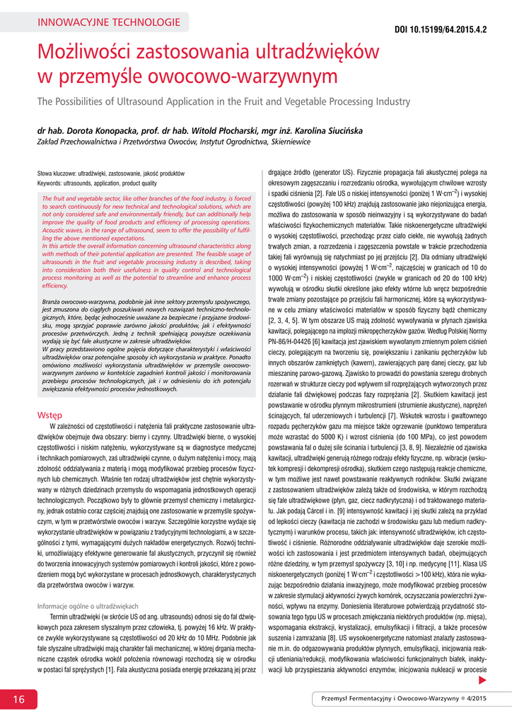 innowacyjne technologie DOI 10.15199/64.2015.4.2 Możliwości zastosowania ultradźwięków w przemyśle owocowo-warzywnym The possibilities of ultrasound application in the fruit and vegetable processing industry dr hab. Dorota Konopacka, prof. dr hab. Witold Płocharski, mgr inż. Karolina Siucińska Zakład Przechowalnictwa i Przetwórstwa Owoców, Instytut Ogrodnictwa, Skierniewice Słowa kluczowe: ultradźwięki, zastosowanie, jakość produktów Keywords: ultrasounds, application, product quality The fruit and vegetable sector, like other branches of the food industry, is forced to search continuously for new technical and technological solutions, which are not only considered safe and environmentally friendly, but can additionally help improve the quality of food products and efficiency of processing operations. Acoustic waves, in the range of ultrasound, seem to offer the possibility of fulfilling the above mentioned expectations. In this article the overall information concerning ultrasound characteristics along with methods of their potential application are presented. The feasible usage of ultrasounds in the fruit and vegetable processing industry is described, taking into consideration both their usefulness in quality control and technological process monitoring as well as the potential to streamline and enhance process efficiency. Branża owocowo-warzywna, podobnie jak inne sektory przemysłu spożywczego, jest zmuszona do ciągłych poszukiwań nowych rozwiązań techniczno-technologicznych, które, będąc jednocześnie uważane za bezpieczne i przyjazne środowisku, mogą sprzyjać poprawie zarówno jakości produktów, jak i efektywności procesów przetwórczych. Jedną z technik spełniającą powyższe oczekiwania wydają się być fale akustyczne w zakresie ultradźwięków. W pracy przedstawiono ogólne pojęcia dotyczące charakterystyki i właściwości ultradźwięków oraz potencjalne sposoby ich wykorzystania w praktyce. Ponadto omówiono możliwości wykorzystania ultradźwięków w przemyśle owocowowarzywnym zarówno w kontekście zagadnień kontroli jakości i monitorowania przebiegu procesów technologicznych, jak i w odniesieniu do ich potencjału zwiększania efektywności procesów jednostkowych. Wstęp W zależności od częstotliwości i natężenia fali praktyczne zastosowanie ultradźwięków obejmuje dwa obszary: bierny i czynny. Ultradźwięki bierne, o wysokiej częstotliwości i niskim natężeniu, wykorzystywane są w diagnostyce medycznej i technikach pomiarowych, zaś ultradźwięki czynne, o dużym natężeniu i mocy, mają zdolność oddziaływania z materią i mogą modyfikować przebieg procesów fizycznych lub chemicznych. Właśnie ten rodzaj ultradźwięków jest chętnie wykorzystywany w różnych dziedzinach przemysłu do wspomagania jednostkowych operacji technologicznych. Początkowo były to głównie przemysł chemiczny i metalurgiczny, jednak ostatnio coraz częściej znajdują one zastosowanie w przemyśle spożywczym, w tym w przetwórstwie owoców i warzyw. Szczególnie korzystne wydaje się wykorzystanie ultradźwięków w powiązaniu z tradycyjnymi technologiami, a w szczególności z tymi, wymagającymi dużych nakładów energetycznych. Rozwój techniki, umożliwiający efektywne generowanie fal akustycznych, przyczynił się również do tworzenia innowacyjnych systemów pomiarowych i kontroli jakości, które z powodzeniem mogą być wykorzystane w procesach jednostkowych, charakterystycznych dla przetwórstwa owoców i warzyw. Informacje ogólne o ultradźwiękach Termin ultradźwięki (w skrócie US od ang. ultrasounds) odnosi się do fal dźwiękowych poza zakresem słyszalnym przez człowieka, tj. powyżej 16 kHz. W praktyce zwykle wykorzystywane są częstotliwości od 20 kHz do 10 MHz. Podobnie jak fale słyszalne ultradźwięki mają charakter fali mechanicznej, w której drgania mechaniczne cząstek ośrodka wokół położenia równowagi rozchodzą się w ośrodku w postaci fal sprężystych [1]. Fala akustyczna posiada energię przekazaną jej przez drgające źródło (generator US). Fizycznie propagacja fali akustycznej polega na okresowym zagęszczaniu i rozrzedzaniu ośrodka, wywołującym chwilowe wzrosty i spadki ciśnienia [2]. Fale US o niskiej intensywności (poniżej 1 W·cm–2) i wysokiej częstotliwości (powyżej 100 kHz) znajdują zastosowanie jako niejonizująca energia, możliwa do zastosowania w sposób nieinwazyjny i są wykorzystywane do badań właściwości fizykochemicznych materiałów. Takie niskoenergetyczne ultradźwięki o wysokiej częstotliwości, przechodząc przez ciało ciekłe, nie wywołują żadnych trwałych zmian, a rozrzedzenia i zagęszczenia powstałe w trakcie przechodzenia takiej fali wyrównują się natychmiast po jej przejściu [2]. Dla odmiany ultradźwięki o wysokiej intensywności (powyżej 1 W·cm–2, najczęściej w granicach od 10 do 1000 W·cm–2) i niskiej częstotliwości (zwykle w granicach od 20 do 100 kHz) wywołują w ośrodku skutki określone jako efekty wtórne lub wręcz bezpośrednie trwałe zmiany pozostające po przejściu fali harmonicznej, które są wykorzystywane w celu zmiany właściwości materiałów w sposób fizyczny bądź chemiczny [2, 3, 4, 5]. W tym obszarze US mają zdolność wywoływania w płynach zjawiska kawitacji, polegającego na implozji mikropęcherzyków gazów. Według Polskiej Normy PN-86/H-04426 [6] kawitacja jest zjawiskiem wywołanym zmiennym polem ciśnień cieczy, polegającym na tworzeniu się, powiększaniu i zanikaniu pęcherzyków lub innych obszarów zamkniętych (kawern), zawierających parę danej cieczy, gaz lub mieszaninę parowo-gazową. Zjawisko to prowadzi do powstania szeregu drobnych rozerwań w strukturze cieczy pod wpływem sił rozprężających wytworzonych przez działanie fali dźwiękowej podczas fazy rozprężania [2]. Skutkiem kawitacji jest powstawanie w ośrodku płynnym mikrostrumieni 