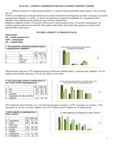 ANALIZA ANKIETY SKIEROWANEJ DO UCZNIÓW ZESPOŁU SZKÓŁ Badania ankietowe zostały przeprowadzono w ramach realizacji projektu edukacyjnego „Nie wyrzucaj jak leci”. Celem tych badań było uzyskanie informacji na temat świadomości ekologicznej uczniów związanej z potrzebą segregowania odpadów w szkole i w domu, uświadomienie zagrożeń wynikających z narastającej ilości odpadów oraz pobudzenie do działań na rzecz ochrony środowiska. Badaniem objętych zostało 135 uczniów (60 uczniów szkoły podstawowej i 75 uczniów gimnazjum). Na niektóre pytania ankietowani udzielali tylko jednej odpowiedzi, były także takie pytania, na które mogli udzielić kilku odpowiedzi. WYNIKI ANKIETY W PROCENTACH Oznaczenia: SP – szkoła podstawowa GIM – gimnazjum ZS – Zespół Szkół 1. Czy popierasz selektywną zbiórkę śmieci i segregowanie odpadów? a b SP GIM ZS 88 71 79 5 4 4 tak nie nie mam zdania c 7 25 17 Zdecydowana większość 79% badanych popiera selektywną zbiórkę śmieci i segregowanie odpadów, 4% nie popiera tych działań, natomiast 17% nie ma zdania na ten temat. 2. Czy wyrzucając śmieci w swoim domu Ty lub Twoja rodzina segregujecie je? a b c d tak nie czasami segreguję, ale nie wszystkie odpady SP GIM ZS 42 21 30 15 36 27 27 27 27 16 16 16 30% badanych odpowiedziało, że w ich domach segreguje się śmieci, u 27% segreguje się czasami, u 16% segreguje się, ale nie wszystkie odpady, zaś u 27% ankietowanych odpady nie są segregowane. 3.Jakie odpady są segregowane u Was w domu? a b c d e f makulatura szkło tworzywa sztuczne metale odpady organiczne inne(jakie?) SP GIM ZS 65 41 71 55 45 68 30 27 45 53 24 34 17 3 21 26 5 6 1 Uczniowie, którzy na pytanie nr 2 odpowiedzieli pozytywnie, w swoich domach segregują: makulaturę (71%), szkło (68%), tworzywa sztuczne (53%), metale (34%), odpady organiczne (26%), oraz inne (6%) np. zużyte baterie, tonery, zepsute telefony. 4. Jak postępuje się w Twoim domu z plastikowymi butelkami? SP a Są wywożone do lasu b Są palone w piecach Są wyrzucane do specjalnych pojemników Są wyrzucane do zwykłego kosza razem z innymi odpadami c d GIM ZS 0 3 2 22 24 23 56 51 53 22 22 22 53% ankietowanych odpowiedziało, że butelki plastikowe są u nich w domu wyrzucane do specjalnych pojemników, przeznaczonych tylko na tworzywa sztuczne, 22% udzieliło odpowiedzi, że wyrzucane są do zwykłego kosza razem z innymi odpadami. Niepokoi fakt, że butelki plastikowe są palone w piecach (takiej odpowiedzi udzieliło 23% ankietowanych), zaś 2% badanych odpowiedziało, że są wywożone do lasu (trafiają na nielegalne wysypiska śmieci). 5.Czy w szkole wyrzucasz butelki plastikowe i zakrętki plastikowe do specjalnych pojemników rozstawionych na korytarzach (zgodnie z ich przeznaczeniem)? a b c tak nie czasami wrzucam tam inne śmieci SP GIM ZS 83 59 69 10 24 18 7 17 13 69% ankietowanych wrzuca butelki plastikowe i zakrętki plastikowe do specjalnych pojemników, zgodnie z zamieszczoną instrukcją. 18% nie postępuje zgodnie z tą instrukcją i wyrzuca swoje butelki plastikowe do koszy przeznaczonych na inne odpady. 13% przyznało się, że czasami do pojemników na plastiki wrzucają inne odpady np. butelki szklane, papier, ogryzki z jabłek itp. 6. Czy przed wyrzuceniem butelki plastikowej do specjalnego pojemnika odkręcasz ją i zgniatasz? a b tak nie SP GIM ZS 70 48 58 30 52 42 2 Część badanych uczniów (58%) zdaje sobie sprawę z konieczności zgniatania opakowań i przed wyrzuceniem butelki plastikowej do pojemnika odkręca ją i zgniata. Niestety aż 42% ankietowanych nie rozumie, jak ważne jest przy segregacji tego typu odpadów ograniczanie ich objętości i odkręcanie zakrętek. 7. Wybierasz się na zakupy do sklepu. Jakiej torby używasz najczęściej? a b c d tekstylnej mocnej torby plastikowej jednorazowej reklamówki foliowej koszyka wiklinowego SP GIM ZS 55 41 47 13 19 16 27 5 21 19 24 13 Większość uczniów chodzi na zakupy z torbą tekstylną (47%), 24% używa jednorazowej reklamówki foliowej, 16% - mocnej torby plastikowej, zaś 13% wkłada swoje zakupy do koszyka wiklinowego. 8. W jakim opakowaniu najchętniej kupujesz napój? a b c d SP GIM w kartoniku 8 14 w plastikowej butelce 73 48 w szklanej butelce 14 25 w metalowej puszce 5 13 ZS 12 59 19 10 Najchętniej ankietowani kupują napoje w butelkach plastikowych – 59%, w szklanej butelce – 19%, w kartoniku – 12%, w metalowej puszce – 10%. 9. Czy w okolicy Twojego domu masz dostęp do odpowiednich pojemników na posegregowane odpady? SP GIM a b c d e Tak, jest ich dużo Tak, ale jest ich za mało Tak, ale nie na wszystkie segregowane odpady Nie Nie wiem ZS 7 5 6 23 20 21 15 45 10 19 43 13 17 44 12 3 44% badanych wskazała na brak pojemników na segregowane odpady w swoich miejscowościach, 21% odpowiedziała, że znajdują się pojemniki, ale jest ich stosunkowo za mało, 6% - że jest ich wystarczająca ilość, natomiast 17% wskazało odpowiedź, że na ich osiedlach są pojemniki, ale nie na wszystkie segregowane odpady. 10. czy widziałeś wysypiska śmieci w lesie w pobliżu Twojego miejsca zamieszkania? a b tak nie SP GIM ZS 40 53 47 60 47 53 47% ankietowanych widziała w lasach nielegalne wysypiska śmieci, niewiele więcej (53%) nie spotkała się z tym negatywnym zjawiskiem zaśmiecania środowiska naturalnego. 11. Recykling oznacza, że śmieci można: a b c palić wrzucać do każdego pojemnika poddać odzyskowi w procesie produkcyjnym 11. Recykling oznacza, że śmieci można: 86 90 SP GIM ZS 7 7 7 83 80 81 70 60 SP 50 GIM 7 12 10 40 ZS 30 20 12 7 10 86 81 83 7 7 10 7 0 a b c 83% badanych zna pojęcie recyklingu i wie, że śmieci mogą być powtórnie przetworzone, natomiast 17% nie ma wiedzy na ten temat. 12. Twoim zdaniem świadomość ekologiczna uczniów na temat potrzeby segregowania odpadów, w tym plastików jest: 60 12. Twoim zdaniem świadomośc ekologiczna uczniów na temat potrzeby segregowania odpadów, w tym 