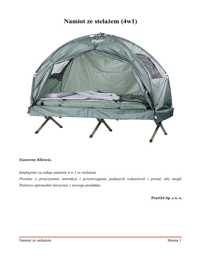 Namiot ze stelażem (4w1) Szanowny Kliencie, dziękujemy za zakup namiotu 4 w 1 ze stelażem. Prosimy o przeczytanie instrukcji i przestrzeganie podanych wskazówek i porad, aby mogli Państwo optymalnie korzystać z nowego produktu. Pearl24 Sp. z o. o. Namiot ze stelażem Strona 1 Zawartość zestawu: • Namiot 4w1 • Łóżko kempingowe • Dmuchany materac • Poduszka dmuchana • Śpiwór • 4 maszty namiotu • Instrukcja obsługi. Namiot ze stelażem Strona 2 Szczegóły produktu 1. Śpiwór 2. Poduszka / pokrycie materaca 3. Ramy łóżka 4. Dmuchany materac 5. Połączenie krzyżowe 6. Maszty namiotu 7. Namiot dachowy 8. Pompka nożna Namiot ze stelażem Strona 3 Łóżko 1. Poluzuj rzepy i rozłóż nogi w bok. 2. Rozłóż nogi łóżka i umieść na płaskiej, stabilnej powierzchni. 3. Rozłóż nogi tak, aby powierzchnia łóżka była rozciągnięta. 4. Wsuń pręt na jednym końcu łóżka, a następnie podłącz do ramy łóżka. 5. Zamocuj drugi pręt na drugim końcu ramy łóżka. 6. Pociągnij za nieprzymocowaną powierzchnię do leżenia nad prętem i przymocuj za pomocą taśmy na rzep na spodzie. Namiot ze stelażem Strona 4 Materac dmuchany 1. Rozłóż najpierw materac na powierzchni do leżenia. 2. Napompuj materac za pomocą pompki nożnej. WSKAZÓWKA Zwróć uwagę, aby nie napompować za dużo powietrza do materaca lub poduszki. Przez zwiększone ciśnienie powietrza dmuchany materac czy poduszka powietrzna może pęknąć. 3. Teraz naciągnij pokrywę materaca na nadmuchany materac i przymocuj za pomocą taśmy na rzep. 4. Obróć dmuchany materac i przymocuj za pomocą zamknięcia zaciskowego na ramie łóżka. Namiot ze stelażem Strona 5 Śpiwór i poduszka 1. Rozłóż śpiwór na dmuchanym materacu. 2. Przeciągnij rzepy materaca przez odpowiednie zakładki na śpiworze. 3. Napompuj poduszkę za pomocą pompki nożnej. 4. Włóż poduszkę w poszewkę. Namiot ze stelażem Strona 6 Ustawianie namiotu 1. Postaw maszty namiotu. Teraz masz 4 długie pręty. 2. Włóż maszty (przy połączeniach kątowych w dół) w odpowiednie oczka ramy łóżka. 3. Teraz dodaj wszystkie cztery pręty do środka z połączeniem krzyżowym. 4. Umieść dach namiotu (ze sznurami wewnątrz) na rusztowaniu z prętów. 5. Przymocuj dach za pomocą sznurów do prętów dachowych. Namiot ze stelażem Strona 7 6. Przymocuj namiot za pomocą gumowych pętli na rogach stelaża. Namiot ze stelażem Strona 8 Bezpieczeństwo • Niniejsza instrukcja ma na celu zapoznanie Państwa z zasadami prawidłowego korzystania z produktu. Zaleca się przechowywanie instrukcji w łatwo dostępnym miejscu, aby w razie potrzeby mogli Państwo zweryfikować informacje. • Wszelkie modyfikacje produktu obniżają poziom jego bezpieczeństwa. UWAGA! Istnieje ryzyko obrażeń! • Zaleca się ostrożne obchodzenie się z produktem. Produkt może ulec uszkodzeniu w wyniku uderzenia, wstrząsów lub upadku nawet z niewielkiej wysokości. • Produkt należy trzymać z dala od wysokiej temperatury. • Wszelkie prawa do wprowadzania zmian technicznych oraz eliminacji błędów są zastrzeżone. Namiot ze stelażem Strona 9
