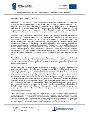 Projekt współfinansowany przez Unię Europejską w ramach Europejskiego Funduszu Społecznego BioTe21 Adam Master, Kraków Firma BioTe21 Adam Master1 z Krakowa rozpoczęła działalność we wrześniu 2005 r. W 2009 roku w ramach podstawowej działalności oferuje usługi w zakresie syntezy i sekwencjonowania DNA, inżynierii genetycznej oraz identyfikacji genetycznej, w tym badań ojcostwa i diagnostyki predyspozycji do chorób genetycznych i nowotworowych. BioTe21 zajmuje się również poszukiwaniem zastosowań i wdrażaniem w biotechnologii i medycynie nowych odkryć naukowych, wynikających z badań podstawowych genomu, transkryptomu i proteomu. Właściciel firmy Adam Master – biotechnolog i chemik – jako pracownik naukowy państwowych oraz prywatnych jednostek zajmujących się badaniami oraz wdrożeniami rezultatów badań genetycznych2, zdobył doświadczenie w obszarze biotechnologii i biologii molekularnej, jak również doświadczenie związane z komercjalizacją i wprowadzaniem na rynek usług i technologii biomedycznych. Punktem wyjścia dla pomysłu założenia firmy były zdobyte umiejętności i wiedza na temat funkcjonowania rynku biotechnologicznego w Polsce i na świecie, a także obserwacje Adama Mastera dotyczące zapotrzebowania na usługi w zakresie syntezy i sekwencjonowania kwasów nukleinowych ze strony pracowników naukowych uczelni wyższych, jak również zapotrzebowania na nowe techniki diagnostyczne predyspozycji do nowotworów. Założyciel BioTe21 postanowił samodzielnie realizować zlecenia wykonywane dotychczas w ramach umowy o pracę. Adam Master wdrożył technologie obejmujące genetykę medyczną, w tym diagnostykę, jak również aplikacje stricte biotechnologiczne: biosyntezę białek rekombinowanych oraz inżynierię genetyczną. Jest on współwłaścicielem trzech patentów. Prowadząc działalność gospodarczą jednocześnie pracował nad doktoratem. Innowacyjność BioTe21 polega na zapewnianiu nowych produktów i usług, będących wdrożeniami najnowszej wiedzy naukowej i technicznej z obszaru chemii, biologii molekularnej i medycyny. Firmie udało się opracować nowe techniki diagnostyczne dotyczące predyspozycji do nowotworów, których koszty są możliwe do poniesienia przez przeciętnego pacjenta. Jest pierwszym komercyjnym laboratorium diagnostyki genetycznej dla pacjentów z Małopolski. Uruchomienie działalności BioTe21 przyczyniło się do zwiększenia dostępności usług w zakresie syntezy i sekwencjonowania kwasów nukleinowych dla pracowników naukowych i ułatwiło bezpośredni kontakt odbiorców tych usług z dostawcą. Firma jest bowiem jedynym laboratorium w Małopolsce, które wprowadziło taki serwis dla pracowników Uniwersytetu Jagiellońskiego oraz innych uczelni, którzy korzystają z niego po konkurencyjnych cenach i przy krótkich terminach realizacji. Zespół BioTe21 ciągle pracuje nad kolejnymi technologiami i planuje wprowadzanie następnych innowacyjnych produktów i usług. Firma obecnie realizuje prace nad nową, tanią i dokładną metodą 1 www.biote21.com Adam Master ukończył Uniwersytet Jagielloński z tytułem magistra na Wydziale Biologii i Nauk o Ziemi (obecny wydział Biotechnologii, kierunek: Biologia, specjalność: Biologia Molekularna, zakład Biologii Komórki), a także Politechnikę Krakowską – z tytułem inżyniera na Wydziale Inżynierii i Technologii Chemicznej (kierunek: Technologia Chemiczna, specjalność: Lekka Synteza Organiczna). Następnie pracował w Instytucie Farmakologii PAN w Krakowie oraz Instytucie Biologii Doświadczalnej im. M. Nenckiego PAN w Warszawie, jak również w Instytucie Badań DNA Sp. z o.o. w Warszawie - komercyjnym przedsiębiorstwie nastawionym na wdrażanie badań genetycznych. 2 1 Projekt współfinansowany przez Unię Europejską w ramach Europejskiego Funduszu Społecznego diagnostyki raka jelita grubego. BioTe21 może poszczycić się między innymi wykryciem 21 mutacji raka piersi (podczas, gdy konkurencyjne laboratoria znają ich przykładowo do siedmiu), co zdecydowanie podnosi prawdopodobieństwo zdiagnozowania choroby. Firma opracowała także zestaw do samodzielnego pobierania materiału genetycznego BioTest21, który umożliwia pobranie i przesłanie zabezpieczonego DNA do laboratorium, bez konieczności wstępnej wizyty u specjalisty. Aktualnie czynione są starania, aby ten nowy produkt, który zdecydowanie zwiększy dostępność badań DNA dla wszystkich chętnych, wprowadzić do sprzedaży. Naturalną konsekwencją podjęcia decyzji o założeniu BioTe21, był pomysł zrealizowania projektu inwestycyjnego pt.: „Synteza genów metodą składania oligonukleotydów w Łańcuchowej Reakcji Polimerazy”, współfinansowanego przez Unię Europejską z Europejskiego Funduszu Rozwoju Regionalnego oraz budżetu państwa w ramach działania 3.4 „Mikroprzedsiębiorstwa” Zintegrowanego Programu Operacyjnego Rozwoju Regionalnego, który z uzyskanym wsparciem banku PKO BP 2 oddziału w Krakowie niewątpliwie przyczynił się do powstania i rozwoju firmy. Aplikowanie o powyższe fundusze dało możliwość stworzenia podstaw prowadzenia działalności gospodarczej, czyli m.in. zakupu niezbędnej, kosztownej aparatury i sprzętu. Pozyskiwanie funduszy na niezbędne inwestycje, pozwalające firmie prowadzić dalszą codzienną działalność, ale też prace badawczo-rozwojowe nad nowymi technologiami jest możliwe, dzięki dużej aktywności w zakresie poszukiwania partnerów do współpracy, jakimi są jednostki naukowe i wspólne z nimi aplikowanie w adekwatnych programach unijnych i krajowych. Jest to stały proces, niezbędny do zapewnienia firmie stabilności oraz możliwości dalszego rozwoju. Na etapie składania pierwszego wniosku aplikacyjnego uzyskano listy intencyjne z Uniwersytetu Jagiellońskiego i Jagiellońskiego Centrum Innowacji o udostępnieniu BioTe21 pomieszczeń biurowych i laboratoryjnych w przypadku uzyskania fina