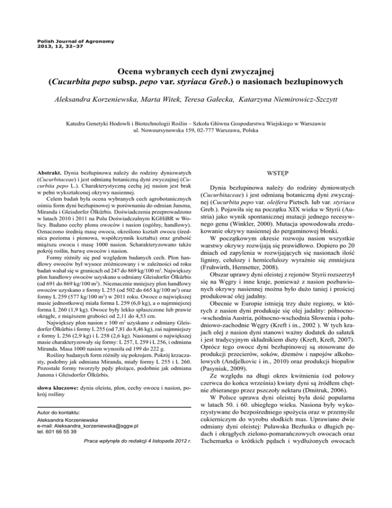 32 Polish Journal of Agronomy, No. 12, 2013 Polish Journal of Agronomy 2013, 12, 32–37 Ocena wybranych cech dyni zwyczajnej (Cucurbita pepo subsp. pepo var. styriaca Greb.) o nasionach bezłupinowych Aleksandra Korzeniewska, Marta Witek, Teresa Gałecka, Katarzyna Niemirowicz-Szczytt Katedra Genetyki Hodowli i Biotechnologii Roślin – Szkoła Główna Gospodarstwa Wiejskiego w Warszawie ul. Nowoursynowska 159, 02-777 Warszawa, Polska Abstrakt. Dynia bezłupinowa należy do rodziny dyniowatych (Cucurbitaceae) i jest odmianą botaniczną dyni zwyczajnej (Cucurbita pepo L.). Charakterystyczną cechą jej nasion jest brak w pełni wykształconej okrywy nasiennej. Celem badań była ocena wybranych cech agrobotanicznych ośmiu form dyni bezłupinowej w porównaniu do odmian Junona, Miranda i Gleisdorfer Ölkürbis. Doświadczenia przeprowadzono w latach 2010 i 2011 na Polu Doświadczalnym KGHiBR w Wolicy. Badano cechy plonu owoców i nasion (ogólny, handlowy). Oznaczono średnią masę owocu, określono kształt owocu (średnica pozioma i pionowa, współczynnik kształtu) oraz grubość miąższu owocu i masę 1000 nasion. Scharakteryzowano także pokrój roślin, barwę owoców i nasion. Formy różniły się pod względem badanych cech. Plon handlowy owoców był wysoce zróżnicowany i w zależności od roku badań wahał się w granicach od 247 do 869 kg/100 m2. Największy plon handlowy owoców uzyskano u odmiany Gleisdorfer Ölkürbis (od 691 do 869 kg/100 m2) . Nieznacznie mniejszy plon handlowy owoców uzyskano z formy L 255 (od 502 do 665 kg/100 m2) oraz formy L 259 (577 kg/100 m2) w 2011 roku. Owoce o największej masie jednostkowej miała forma L 259 (6,0 kg), a o najmniejszej forma L 260 (1,9 kg). Owoce były lekko spłaszczone lub prawie okrągłe, z miąższem grubości od 2,11 do 4,53 cm. Największy plon nasion z 100 m2 uzyskano z odmiany Gleisdorfer Ölkürbis i formy L 255 (od 7,81 do 8,46 kg), zaś najmniejszy z formy L 256 (2,9 kg) i L 258 (2,6 kg). Nasionami o największej masie charakteryzowały się formy: L 257, L 259 i L 256, i odmiana Miranda. Masa 1000 nasion wynosiła od 199 do 222 g. Rośliny badanych form różniły się pokrojem. Pokrój krzaczasty, podobny jak odmiana Miranda, miały formy L 255 i L 260. Pozostałe formy tworzyły pędy płożące, podobnie jak odmiana Junona i Gleisdorfer Ölkürbis. słowa kluczowe: dynia oleista, plon, cechy owocu i nasion, pokrój rośliny Autor do kontaktu: Aleksandra Korzeniewska e-mail: [email protected] tel. 601 66 55 39 Praca wpłynęła do redakcji 4 listopada 2012 r. WSTĘP Dynia bezłupinowa należy do rodziny dyniowatych (Cucurbitaceae) i jest odmianą botaniczną dyni zwyczajnej (Cucurbita pepo var. oleifera Pietsch. lub var. styriaca Greb.). Pojawiła się na początku XIX wieku w Styrii (Austria) jako wynik spontanicznej mutacji jednego recesywnego genu (Winkler, 2000). Mutacja spowodowała zredukowanie okrywy nasiennej do pergaminowej błonki. W początkowym okresie rozwoju nasion wszystkie warstwy okrywy rozwijają się prawidłowo. Dopiero po 20 dniach od zapylenia w rozwijających się nasionach ilość ligniny, celulozy i hemicelulozy wyraźnie się zmniejsza (Fruhwirth, Hermetter, 2008). Obszar uprawy dyni oleistej z rejonów Styrii rozszerzył się na Węgry i inne kraje, ponieważ z nasion pozbawionych okrywy nasiennej można było dużo taniej i prościej produkować olej jadalny. Obecnie w Europie istnieją trzy duże regiony, w których z nasion dyni produkuje się olej jadalny: północno-wschodnia Austria, północno-wschodnia Słowenia i południowo-zachodnie Węgry (Kreft i in., 2002 ). W tych krajach olej z nasion dyni stanowi ważny dodatek do sałatek i jest tradycyjnym składnikiem diety (Kreft, Kreft, 2007). Oprócz tego owoce dyni bezłupinowej są stosowane do produkcji przecierów, soków, dżemów i napojów alkoholowych (Andjelkovic i in., 2010) oraz produkcji biopaliw (Pasyniuk, 2009). Ze względu na długi okres kwitnienia (od połowy czerwca do końca września) kwiaty dyni są źródłem chętnie zbieranego przez pszczoły nektaru (Dmitruk, 2006). W Polsce uprawa dyni oleistej była dość popularna w latach 50. i 60. ubiegłego wieku. Nasiona były wykorzystywane do bezpośredniego spożycia oraz w przemyśle cukierniczym do wyrobu słodkich mas. Uprawiano dwie odmiany dyni oleistej: Puławska Bezłuska o długich pędach i okrągłych zielono-pomarańczowych owocach oraz Tschemarka o krótkich pędach i wydłużonych owocach 33 A. Korzeniewska i in. – Ocena wybranych cech dyni zwyczajnej o nasionach bezłupinowych barwy szarozielonej z żółtymi pasami. W późniejszych latach z powodu braku kwalifikowanych nasion uprawy dyni bezłupinowej w Polsce zanikły (Budzyński, Zając, 2010). Obecnie w krajowym rejestrze odmian roślin warzywnych znajdują się dwie odmiany dyni zwyczajnej bezłupinowej polskiej hodowli w SGGW: Junona (płożący pokrój roślin) oraz Miranda (półkrzaczasty pokrój roślin). Aktualnie na świecie i w Polsce wzrasta zainteresowanie nasionami dyni jako surowcem do pozyskiwania cennego oleju i produkcją nasion do bezpośredniego spożycia. W Japonii nasiona dyni w rankingu najwartościowszych artykułów spożywczych umieszczane są na pierwszym miejscu (Kulaitiene i in., 2009). Celem badań była ocena wybranych cech agrobotanicznych ośmiu form dyni bezłupinowej w porównaniu do odmian Junona, Miranda i Gleisdorfer Ölkürbis. MATERIAŁ I METODY Doświadczenia przeprowadzono w roku 2010 i 2011 na Polu Doświadczalnym Katedry Genetyki, Hodowli i Biotechnologii Roślin w Wolicy, na glebie płowej, klasy bonitacyjnej IVa. Materiał badawczy stanowiło 8 form dyni bezłupinowej oraz trzy odmiany wzorcowe dyni bezłupinowej: Junona (pokrój płożący), Miranda (pokrój krzaczasty) i Gleisdorfer Ölkürbis (pokrój płożący). Doświadczenie jednoczynnikowe założono metodą bloków losowanych, w trzech powtórzeniach. Dynię wysiano bezpośrednio