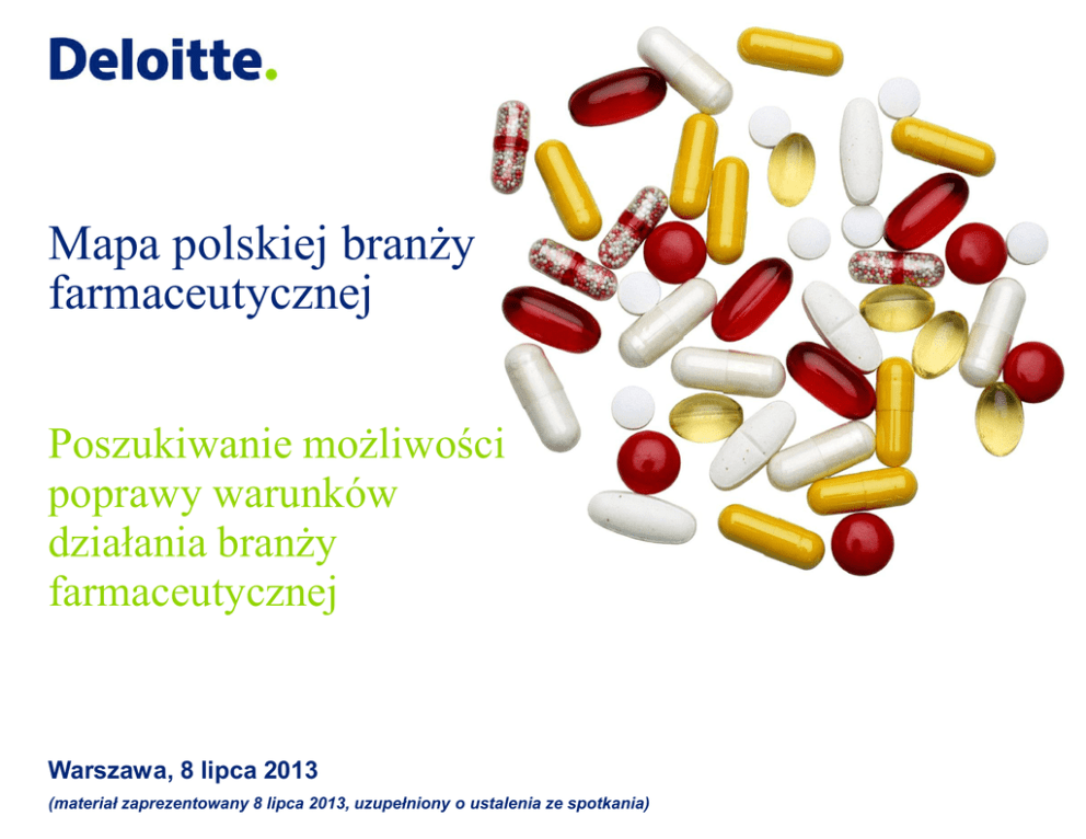 Mapa polskiej branży farmaceutycznej Poszukiwanie możliwości poprawy warunków działania branży farmaceutycznej Warszawa, 8 lipca 2013 (materiał zaprezentowany 8 lipca 2013, uzupełniony o ustalenia ze spotkania) 2 Wstępna propozycja celu wspólnych prac Cel opracowania mapy regulacji branży farmaceutycznej Branża farmaceutyczna jest jednym z najbardziej innowacyjnych i najszybciej rozwijających się sektorów zarówno w Polsce, jak i na świecie Od wielu lat wpływ branży na polską gospodarkę systematycznie rósł W roku 2010 roku sektor ten w sposób bezpośredni i pośredni odpowiadał za prawie 1 procent PKB Długoterminowo, wpływ branży farmaceutycznej nadal może rosnąć i to szybciej niż cała gospodarka* 3 Branża farmaceutyczna jest wyjątkowo wrażliwa na warunki prawno-regulacyjne Legislacja UE (stosowana bezpośrednio i przenoszona do prawa polskiego) Dla zapewnienia optymalnych warunków długoterminowego rozwoju, potrzebne jest: Ustanowienie wspólnej platformy dla transparentnej dyskusji o regulacjach mających wpływ na branżę farmaceutyczną Wypracowywanie wspólnego stanowiska branży wobec planowanych i opracowywanych regulacji Włączenie wspólnej reprezentacji przedstawicieli branży do dialogu w zakresie regulacji dotyczących branży, zarówno na poziomie krajowym, jak i na poziomie Unii Europejskiej Legislacja polska (ustawy, rozporządzenia, komunikaty GIF itd.) Legislacja krajów, do których eksportuje się leki Legislacja krajów, z których sprowadza się leki lub substancje czynne Standardy krajowe i międzynarodowe (technologie, procesy, zarządzanie jakością) * Źródło: Wkład innowacyjnego przemysłu farmaceutycznego w rozwój polskiej gospodarki, raport PwC, IX 2011 © 2013 Deloitte Oczekiwane korzyści uzgodnienia łańcucha wartości i mapy regulacji branży farmaceutycznej Perspektywa krótkoterminowa Wspólna platforma dyskusji o przyszłości branży Perspektywa długoterminowa Kształtowanie regulacji branży Wzrost i poprawa efektywności branży Wspólny słownik pojęć dot. branży farmaceutycznej (w tym główne procesy realizowane przez uczestników branży) Głębsza wiedza branży o planowanych kierunkach zmian regulacyjnych może obniżyć koszt oraz czas ich wdrażania Poprawa konkurencyjności poprzez zapewnienie warunków regulacyjnych nie gorszych, niż w innych krajach UE Ułatwienie funkcjonowania małym graczom, działającym w pojedynczych ogniwach łańcucha wartości Materiał wejściowy do priorytetyzacji prac nad przenoszeniem regulacji UE na grunt polski Redukcja ograniczeń regulacyjnych prawa krajowego nie wynikających z regulacji UE Wspólne i wszechstronne zrozumienie wpływu obecnych i planowanych regulacji na branżę Materiał wejściowy do wyznaczenia krajowych celów negocjacyjnych dla przyszłych regulacji UE Osiągnięcie dzięki eksportowi korzyści skali, której nie można zapewnić wyłącznie na bazie popytu krajowego Podjęcie dyskusji o strategii rozwoju branży w kontekście priorytetów poszczególnych ministerstw Materiał wejściowy do budowy propozycji zmian legislacyjnych w powiązaniu z kierunkami rozwoju branży Wzbogacenie portfela produktów farmaceutycznych wytwarzanych w kraju Poprawa przewidywalności zmian regulacyjnych mających wpływ na branżę Wzbogacenie oferty usług świadczonych przez polskie przedsiębiorstwa w ramach łańcucha wartości branży Wzrost konkurencyjności eksportowej polskiej branży farmaceutycznej Lepsze wykorzystanie potencjału całej branży 4 © 2013 Deloitte 5 Proponowane podejście do wspólnej realizacji prac Proponowane kroki wspólnych prac nad łańcuchem wartości i mapą regulacji 1. Łańcuch wartości branży farmaceutycznej 2. Mapa uczestników branży (rodzaje przedsiębiorstw) Uzgodniony łańcuch wartości branży farmaceutycznej Dla każdego elementu łańcucha wartości, uzgodniony wykaz procesów, umożliwiający podmiotom w branży odniesienie tych działań do własnej działalności Podmioty branży zostaną podzielone na grupy, zależnie od specyfiki działalności, rozumianej jako realizacja konkretnych zadań łańcucha wartości Mapa wiążąca elementy łańcucha wartości z konkretnymi grupami uczestników rynku pozwoli ocenić poziomy zaangażowania polskich przedsiębiorstw w realizację poszczególnych zadań łańcucha wartości 3. Przegląd wpływu obecnych i planowanych regulacji na branżę 6 Podmioty branży zostaną podzielone na grupy, zależnie od specyfiki działalności, rozumianej jako realizacja konkretnych zadań łańcucha wartości Mapa wiążąca elementy łańcucha wartości z konkretnymi grupami uczestników rynku pozwoli ocenić poziomy zaangażowania polskich przedsiębiorstw w realizację poszczególnych zadań łańcucha wartości Mapa powinna objąć zarówno bieżące, pilne zagadnienia, jak i kwestie istotne dla długoterminowego rozwoju branży * Źródło: Sektor farmaceutyczny i biotechnologiczny w Polsce, PAIIZ, 2013 ** Źródło: The global use of medicines: Outlook through 2016, IMS Institute © 2013 Deloitte Łańcuch wartości branży farmaceutycznej w zarysie Poniższy diagram ilustruje wstępną propozycję łańcucha wartości branży farmaceutycznej Wykaz procesów zostanie uzupełniony, uzgodniony i sprecyzowany w stopniu umożliwiającym podmiotom branży identyfikację własnego uczestnictwa w poszczególnych procesach, a następnie szczegółową dyskusję o wpływie obecnych, projektowanych i wprowadzanych regulacji. 1. Badania podstawowe W tym m.in. • Identyfikacja targetu • Poznanie mechanizmów działania 2. Badania przedkliniczne W tym m.in. • Badania przesiewowe • Opracowanie technologii • Badania przedkliniczne • Zakup substancji czynnych • Wytworzenie serii pilotażowej 3. Badania kliniczne W tym • Badanie biorównoważności albo • Odstępstwo od badań klinicznych albo • Fazy I-III badań klinicznych 4. Rejestracja Realizacja wg jednej z pro