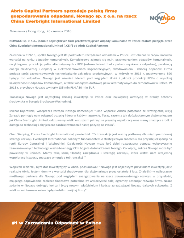 Abris Capital Partners sprzedaje polską firmę gospodarowania odpadami, Novago sp. z o.o. na rzecz China Everbright International Limited Warszawa / Hong Kong, 26 czerwca 2016 NOVAGO sp. z o.o., jedna z największych firm przetwarzających odpady komunalne w Polsce została przejęta przez China Everbright International Limited („CEI”) od Abris Capital Partners Założona w 1992 r., spółka Novago jest #1 podmiotem zarządzania odpadami w Polsce. Jest obecna w całym łańcuchu wartości na rynku odpadów komunalnych. Kompleksowo zajmuje się m.in. przetwarzaniem odpadów komunalnych, recyklingiem, produkcją paliw alternatywnych - RDF (refuse-derived fuel - paliwo uzyskane z odpadów), produkcją energii elektrycznej i cieplnej w elektrociepłowniach kogeneracyjnych, składowaniem i zbiórką odpadów. Firma posiada sześć zaawansowanych technologicznie zakładów produkcyjnych, w których w 2015 r. przetworzono 890 tysięcy ton odpadów. Novago jest również liderem pod względem ilości i jakości produkcji RDFu o wysokiej kaloryczności z odpadów komunalnych, a także wiodącym dostawcą paliw alternatywnych do cementowni w Polsce. W 2015 r. przychody Novago wyniosły 135 mln PLN / 30 mln EUR. Transakcja Novago jest największą chińską inwestycja w Polsce oraz największą akwizycją w branży ochrony środowiska w Europie Środkowo-Wschodniej. Michał Dąbrowski, wiceprezes zarządu Novago komentuje: “Silne wsparcie Abrisu połączone ze strategiczną wizją Zarządu pomogły nam osiągnąć pozycję lidera w każdym aspekcie. Teraz, razem z tak doświadczonym akcjonariuszem jak China Everbright Limited, odczuwamy wielki entuzjazm patrząc na przyszłą współpracę oraz mamy znaczące środki i dostęp do technologii aby jeszcze bardziej wzmocnić naszą pozycję na rynku”. Chen Xiaoping, Prezes Everbright International, powiedział: "Ta transakcja jest ważną platformą dla międzynarodowej strategii rozwoju Everbright International i solidnym fundamentem o strategicznym znaczeniu dla przyszłej ekspansji na rynki Europy Centralnej i Wschodniej. Działalność Novago może być dalej rozszerzona poprzez wykorzystanie zaawansowanych technologii waste-to-energy CEI i bogate doświadczenie Novago. Co więcej, sukces Novago może być powielony w Chinach. Mamy taką samą filozofię zarządzania i strategię rozwoju, która ułatwi nam wzajemną współpracę i stworzy znaczące synergie z tej transakcji." Wojciech Jezierski, Dyrektor Inwestycyjny w Abris, podsumował: ”Novago jest najlepszym przykładem inwestycji jakie realizuje Abris. Jestem dumny z wartości zbudowanej dla akcjonariuszy przez ostatnie 3 lata. Znaleźliśmy najlepszego możliwego partnera dla Novago pod względem zaangażowania na rzecz zrównoważonego rozwoju w przyszłości, mającego odpowiednie zaplecze finansowe potrzebne by wykorzystać dalej ogromny potencjał rozwoju firmy. Nasze zadanie w Novago dobiegło końca i życzę nowym właścicielom i kadrze zarządzającej Novago dalszych sukcesów. Z wielkim zainteresowaniem będę śledził rozwój tej firmy”. #1 w Zarządzaniu Odpadami w Polsce O China Everbright International Limited (CEI) CEI jest wiodącą i jedną z największych firm ochrony środowiska w Chinach, działającą w czterech głównych segmentach: ekologicznej energii, ekologicznej wody, greentech oraz ekologicznej technologii. W segmencie energii, CEI koncentruje się głównie na biznesie pozyskiwania energii z odpadów (waste-to-energy, WTE), będąc wiodącym inwestorem WTE w Azji z możliwościami przetwarzania ok. 13,8 mln ton odpadów rocznie, co może generować nawet 4,1 mld kWh elektryczności typu on-grid rocznie (wg stanu na 31 grudnia 2015 r.). CEI jest spółką giełdową o kapitalizacji 37,1 mld HKD (4,2 mld EUR) wg stanu na 14 czerwca 2016 r. notowaną na giełdzie papierów wartościowych w Hong Kongu. O Abris Capital Partners Abris jest wiodącym niezależnym funduszem private equity koncentrującym się na firmach średniej wielkości w regionie Europy Środkowej i Wschodniej. Fundusz inwestuje w przedsiębiorstwa o ugruntowanej pozycji na rynku, odznaczających się wyraźnym potencjałem dalszego wzrostu biznesu poprzez ekspansję, przejęcia oraz zmiany strategiczno-operacyjne. Abris ma szczególne kwalifikacje i doświadczenie w partnerstwie biznesowym z firmami prowadzonymi przez prywatnych przedsiębiorców. Transakcja jest uwarunkowana wydaniem zgody przez Urząd Ochrony Konkurencji i Konsumentów. Doradcy uczestniczący w transakcji: - Dla Abris: Pekao Investment Banking (M&A), Norton Rose Fullbright (prawne), Deloitte (finansowe, podatkowe, komercyjne), Ramboll Environ (środowiskowe) - Dla China Everbright International Limited: Lazard (M&A), CMS (prawne), BCG (komercyjne), KPMG (finansowe i podatkowe)