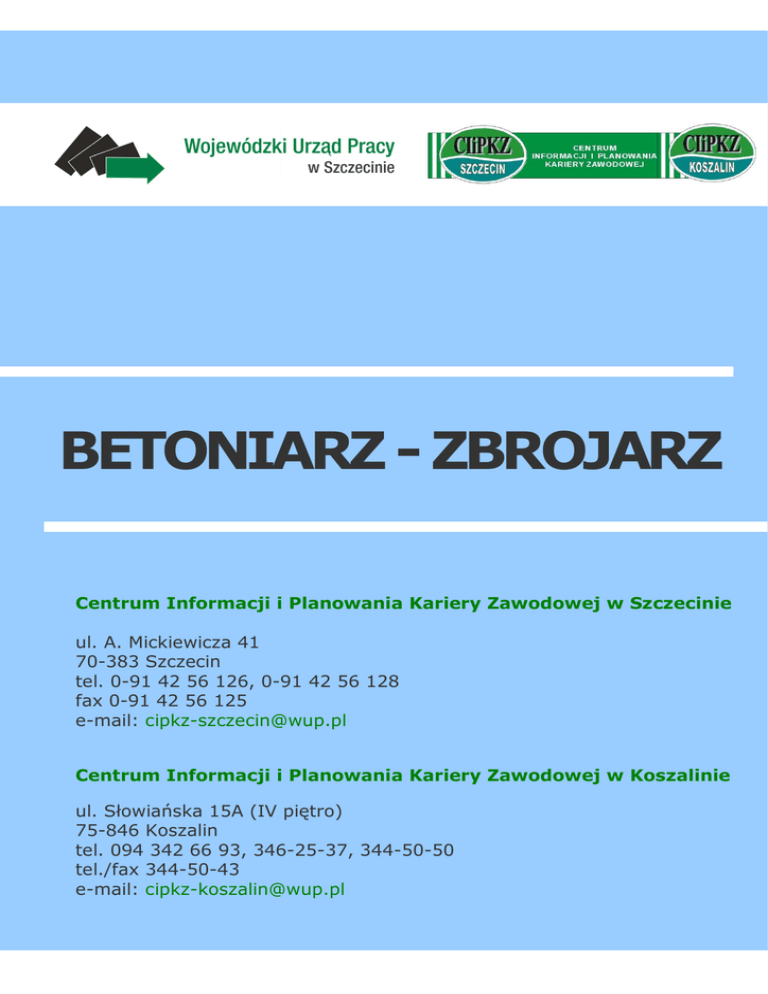 BETONIARZ - ZBROJARZ Centrum Informacji i Planowania Kariery Zawodowej w Szczecinie ul. A. Mickiewicza 41 70-383 Szczecin tel. 0-91 42 56 126, 0-91 42 56 128 fax 0-91 42 56 125 e-mail: [email protected] Centrum Informacji i Planowania Kariery Zawodowej w Koszalinie ul. Słowiańska 15A (IV piętro) 75-846 Koszalin tel. 094 342 66 93, 346-25-37, 344-50-50 tel./fax 344-50-43 e-mail: [email protected] Betoniarz – zbrojarz Celem pracy betoniarza-zbrojarza jest wykonywanie elementów betonowych lub Ŝelbetonowych, słuŜących jako konstrukcje nośne budowli lub jako elementy wypełniające budowlę oraz wykonanie elementów Ŝelbetowych dróg, mostów, budowli melioracyjnych i innych. Zadania i czynności robocze Betoniarz-zbrojarz operuje dwoma rodzajami materiałów: betonem i stalą. Beton jest materiałem uniwersalnym: pozwala wylewać się w róŜne kształty, ma duŜą wytrzymałość na ściskanie oraz na działanie czynników zewnętrznych. Jego wady, to mała odporność na wysokie temperatury i mała wytrzymałość na rozciąganie. Ta ostatnia cecha spowodowała konieczność zbrojenia tj. umacniania betonu stalowymi prętami. Powstała więc moŜliwość budowania z Ŝelbetu (konstrukcje stalowe zalane betonem) takich elementów, jak belki, płyty i inne. Roboty zbrojarskie na większych budowlach lub obiektach o specjalnym znaczeniu wykonują zbrojarze, ale na średnich budowach czynności zbrojarza są z reguły połączone z czynnościami betoniarza. Betoniarzzbrojarz, by wykonać swe zadania, musi przygotować i zmontować zbrojenie oraz przygotować i ułoŜyć mieszankę betonową, składającą się ze Ŝwiru, piasku, cementu i wody. Beton otrzymuje się mieszając te wszystkie składniki dokładnie, według ustalonych receptur. Betoniarz - zbrojarz montując zbrojenie powinien wybrać odpowiedni gatunek stalowych prętów o określonej średnicy. Przyciąć je na odpowiedni wymiar i wygiąć w odpowiedni kształt. Do tych czynności betoniarz-zbrojarz uŜywa suwmiarki, noŜyc zbrojarskich i giętarki ręcznej lub mechanicznej. Zbrojenie transportuje się do miejsca wbudowania. Tam betoniarz zbrojarz układa je w szalunkach i formach w sposób zgodny z projektem konstrukcyjnym. Zarówno podczas przygotowywania zbrojenia jak i montaŜu konieczna jest umiejętność czytania rysunków technicznych. Formy, w których ułoŜone jest zbrojenie zalewa się betonem. W czasie układania betonu w formach powinien być on zagęszczany przy pomocy wibratorów. Forma wypełniona zbrojeniem i betonem przemieszczana jest pod nadzorem betoniarza-zbrojarza do autoklawu, gdzie poddaje się ją naparzaniu parą wodną o wysokiej temperaturze. Gdy naparzony element (prefabrykat) osiągnął potrzebną wytrzymałość wyjmuje się go z formy i transportuje na stanowiska magazynowe. Obowiązkiem betoniarzazbrojarza jest czuwanie nad procesem „dojrzewania" betonu, wyjmowanie z form prefabrykatów, zwilŜanie ich wodą w magazynach. Środowisko pracy materialne środowisko pracy W zaleŜności od stanowiska w zawodzie betoniarze-zbrojarze pracują w zróŜnicowanych środowiskach. Inne są warunki pracy w stałym zakładzie produkcji elementów budowlanych, inne w polowym zakładzie produkcyjnym, a jeszcze inne na budowie. W zakładach produkcyjnych betoniarz zbrojarz wykonuje pracę w halach, czyli w pomieszczeniach zamkniętych i ogrzewanych zimą. Zupełnie inne warunki są na budowie, w szczególności zaś na budowach drogowo-mostowych, melioracyjnych czy budynkach lub obiektach niemających jeszcze dachu i ścian. Tu pracują betoniarze-zbrojarze często na duŜych wysokościach przy utrudnionym dostępie do stanowiska pracy lub pod ziemią w głębokich wykopach np. przy zbrojeniu metra. Przy robotach melioracyjnych betoniarz-zbrojarz pracuje w rowach i w błocie. Podczas przygotowywania betonu oddycha powietrzem zanieczyszczonym pyłami cementu. Pracy betoniarza-zbrojarza towarzyszą hałas, wywołany pracą maszyn na budowie i wibracje wytwarzane podczas zagęszczania betonu. Niekiedy pracuje w sąsiedztwie spawaczy, młotów pneumatycznych, dźwigów, walców drogowych i asfalciarek. Betoniarze-zbrojarze pracują ostrymi narzędziami i w twardych oraz ostrych materiałach. Mogą więc być naraŜeni na zranienia rąk. Utrudnienie w pracy stanowią wąskie, prowizoryczne przejścia, stojące rusztowania i stemplowania. społeczne środowisko pracy Betoniarz-zbrojarz pracuje zarówno w zespołach jak i indywidualnie. Wielkość zespołów, jak i praca indywidualna uzaleŜnione są od wielkości i pilności wykonywanych zadań. Często na budowach tworzone są zespoły, składające się oprócz ze zbrojarzy-betoniarzy, takŜe z cieśli. Brygadzista zespołu powinien być w stałym kontakcie z kierownikiem budowy. Konieczna bowiem jest koordynacja pracy brygad oraz dostaw materiałów. Bliskie współdziałanie wewnątrz brygad jest nieodzowne. organizacyjne środowisko pracy Praca betoniarza-zbrojarza trwa ok. 8 godzin. Godziny jego pracy ulegają zmianie tylko w wyjątkowych wypadkach i są dyktowane pilnością wykonania zadań, a w wypadku betoniarzy-zbrojarzy pracujących na otwartych przestrzeniach - warunkami atmosferycznymi. PoniewaŜ betoniarze-zbrojarze często pracują poza stałym miejsca zamieszkania, pracodawcy organizują im zakwaterowanie w pobliŜu miejsca pracy. Wykonywanie pracy betoniarza-zbrojarza jest kontrolowane przez majstra i kierownictwo budowy. Wymagania psychologiczne Betoniarz-zbrojarz wykonuje swoje zadania będąc w ciągłym ruchu. Pracuje na ogół na płaszczyznach poziomych, ale często musi wspinać się wysoko na rusztowania. Nieodzowna jest zatem dyscyplina w uŜywaniu urządzeń zabezpieczających jak np. pasy BHP, hełmy, rękawice, ubrania robocze. Wyniki jego pracy, gdy wiąŜe pręty, montuje zbrojenie, manipuluje narzędziami zaleŜą od jego umiejętności manualnych. W zawodzie betoniarza-zbrojarza konieczna jest dokładność i wyobraźn