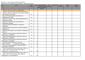 Załacznik nr 1, znak sprawy DZ-2501/24737/2763/13 FORMULARZ OPISU PRZEDMIOTU ZAMÓWIENIA - FORMULARZ CENOWY lp. 1 2 3 4 5 6 7 8 9 10 11 12 13 14 nazwa Zadanie 1 tonery do drukarek i kserokopiarek bęben do drukarki Brother DCP 9040CN /9045CDN, HL 4040CN / 4050CDN / 4070CDW, MFC 9440CN, 9450CDN (nr katalogowy: DR-130CL) bęben do drukarki Brother MFC-8510DN (nr katalogowy: DR-3300) bęben do drukarki d-Copia 120D/150D/200D/201D (nr katalogowy: B0266) bęben do drukarki HP Color LaserJet 2550 (nr katalogowy: Q3964A ) bęben do drukarki OKI MC562 (nr katalogowy: 44968301) bęben do drukarki Xerox Phaser 7760 (nr katalogowy: 108R00713) bęben do kserokopiarki Canon iR2016J (nr katalogowy: CEXV-14) bęben do kserokopiarki Xerox WorkCentre 5020 (nr katalogowy: 101R00432) bęben do kserokopiarki Xerox WorkCentre 5230 (nr katalogowy: 101R00435) bęben do kserokopiarki Xerox WorkCentre M118 (nr katalogowy: 013R00589) taśma do drukarki igłowej OKI - Microline 321/3320/3321 (nr katalogowy: RIB-320) taśma do drukarki igłowej OKI - Microline 390FB (nr katalogowy: 09002310) toner do drukarki Brother DCP 9040 / 9042 / 9045, HL 4040 / 4050 / 4070, MFC 9440 / 9450 / 9840 (nr katalogowy: TN-135BK (czarny)) toner do drukarki Brother DCP 9040 / 9042 / 9045, HL 4040 / 4050 / 4070, MFC 9440 / 9450 / 9840 (nr katalogowy: TN-135C (błękitny)) jedn. miary nazwa producenta/ cena nr katalogowy/ okres jedn.netto gwarancji/ wydajność produktu* ilość szt. 3 szt. 1 szt. 1 szt. 3 szt. 1 szt. 5 szt 1 szt. 2 szt. 2 szt 4 szt. 24 szt. 1 szt. 19 szt. 14 stawka VAT cena jedn.brutto wartość netto wartość brutto 15 16 17 18 19 20 21 22 23 24 25 26 27 28 29 30 31 toner do drukarki Brother DCP 9040 / 9042 / 9045, HL 4040 / 4050 / 4070, MFC 9440 / 9450 / 9840 (nr katalogowy: TN-135M (purpurowy)) toner do drukarki Brother DCP 9040 / 9042 / 9045, HL 4040 / 4050 / 4070, MFC 9440 / 9450 / 9840 (nr katalogowy: TN-135Y (żółty)) toner do drukarki Brother HL 5240 / 5250 / 5270, DCP 8060 / 8065, MFC 8860 / 8460 (nr katalogowy: TN-3130 (czarny)) toner do drukarki Brother HL-6180DW/ HL-5450DN/ HL5470DW (nr katalogowy: TN-3330 (czarny)) toner do drukarki HP Color LaserJet 2550 (nr katalogowy: Q3960A (czarny)) toner do drukarki HP Color LaserJet 2550 (nr katalogowy: Q3961A (błękitny)) toner do drukarki HP Color LaserJet 2550 (nr katalogowy: Q3962A (żółty)) toner do drukarki HP Color LaserJet 2550 (nr katalogowy: Q3963A (purpurowy)) toner do drukarki HP Color LaserJet 2600 / 2605 (nr katalogowy: Q6000A (czarny)) toner do drukarki HP Color LaserJet 2600 / 2605 (nr katalogowy: Q6001A (błękitny)) toner do drukarki HP Color LaserJet 2600 / 2605 (nr katalogowy: Q6002A (żółty)) toner do drukarki HP Color LaserJet 2600 / 2605 (nr katalogowy: Q6003A (purpurowy)) toner do drukarki HP Color LaserJet 3600 (nr katalogowy: Q6470A (czarny)) toner do drukarki HP Color LaserJet 3600 (nr katalogowy: Q6471A (błękitny)) toner do drukarki HP Color LaserJet 3600 (nr katalogowy: Q6472A (żółty)) toner do drukarki HP Color LaserJet 3600 (nr katalogowy: Q6473A (purpurowy)) toner do drukarki HP Color LaserJet CP1515 / CM1312nfi MFP (nr katalogowy: CB540A (czarny)) szt. 14 szt. 14 szt. 5 szt. 7 szt. 15 szt. 12 szt. 12 szt. 12 szt. 80 szt. 45 szt. 45 szt. 45 szt. 11 szt. 10 szt 10 szt. 10 szt. 18 32 33 34 35 36 37 38 39 40 41 42 43 44 45 46 47 48 49 toner do drukarki HP Color LaserJet CP1515 / CM1312nfi MFP (nr katalogowy: CB541A (błękitny)) toner do drukarki HP Color LaserJet CP1515 / CM1312nfi MFP (nr katalogowy: CB542A (żółty)) toner do drukarki HP Color LaserJet CP1515 / CM1312nfi MFP (nr katalogowy: CB543A (purpurowy)) toner do drukarki HP Color LaserJet CP2025N / CM2320fxi MFP (nr katalogowy: CC530A (czarny)) toner do drukarki HP Color LaserJet CP2025N / CM2320fxi MFP (nr katalogowy: CC531A (błękitny)) toner do drukarki HP Color LaserJet CP2025N / CM2320fxi MFP (nr katalogowy: HP CC532A (żółty)) toner do drukarki HP Color LaserJet CP2025N / CM2320fxi MFP (nr katalogowy: HP CC533A (purpurowy)) toner do drukarki HP Color LaserJet CP3525 (nr katalogowy: CE252A (żółty)) toner do drukarki HP Color LaserJet CP3525 (nr katalogowy: CE251A (błękitny)) toner do drukarki HP Color LaserJet CP3525 (nr katalogowy: CE250X (czarny)) toner do drukarki HP Color LaserJet CP3525 (nr katalogowy: CE253A (purpurowy)) toner do drukarki HP LaserJet 1000 / 1005 (nr katalogowy: C7115A (czarny)) toner do drukarki HP LaserJet 1015 / 1018 / 1020 (nr katalogowy: Q2612A (czarny)) toner do drukarki HP LaserJet 1100 / 1100A (nr katalogowy: C4092A (czarny)) toner do drukarki HP LaserJet 1150 (nr katalogowy: Q2624A (czarny)) toner do drukarki HP LaserJet 1160 (nr katalogowy: Q5949A (czarny)) toner do drukarki Hp LaserJet 1200 (nr katalogowy: C7115X (czarny)) toner do drukarki HP LaserJet 1300 (nr katalogowy: Q2613X (czarny)) szt. 16 szt. 16 szt. 16 szt. 45 szt. 30 szt. 30 szt. 30 szt. 3 szt. 3 szt. 6 szt. 3 szt. 4 szt. 15 szt. 3 szt 2 szt. 4 szt. 6 szt. 5 50 51 52 53 54 55 56 57 58 59 60 61 62 63 64 65 66 67 toner do drukarki HP LaserJet 1320 (nr katalogowy: Q5949X (czarny)) toner do drukarki HP LaserJet 2300 (nr katalogowy: Q2610A (czarny)) toner do drukarki HP LaserJet 5 / 5M (nr katalogowy: 92298X (czarny)) toner do drukarki HP LaserJet 5100 (nr katalogowy: C4129X (czarny)) toner do drukarki HP LaserJet 5200n (nr katalogowy: Q7516A (czarny)) toner do drukarki HP LaserJet 5L / 6L / 3100 / 3150 (nr katalogowy: C3906A (czarny)) toner do drukarki HP LaserJet 5P / MP, 6P / MP (nr katalogowy: C3903A (czarny)) toner do drukarki HP LaserJet Enterprise P3015 (nr katalogowy: CE255X (czarny)) toner do drukarki HP LaserJet P1005 / P1006 (nr katalogowy: CB435A (czarny)) toner do drukarki HP LaserJet P1102 (nr katalogowy: CE285A (czarny)) toner do drukarki HP LaserJet P2014 / P2015 (nr katalogowy: Q7553X (czarny)) toner do drukarki HP LaserJet P2035 / P2055 (nr katalogowy: CE505X (czarny)) toner do drukarki HP LaserJet Pro 400 Color M451dn (nr katalogowy: CE411A (
