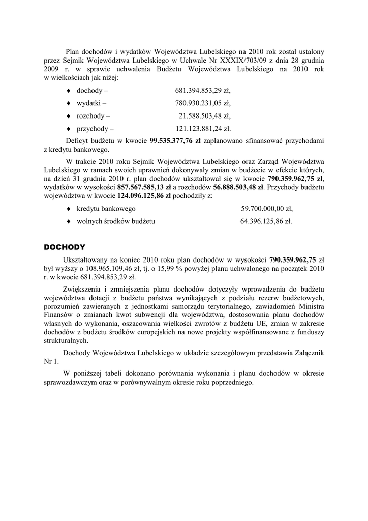 Plan dochodów i wydatków Województwa Lubelskiego na 2010 rok został ustalony przez Sejmik Województwa Lubelskiego w Uchwale Nr XXXIX/703/09 z dnia 28 grudnia 2009 r. w sprawie uchwalenia BudŜetu Województwa Lubelskiego na 2010 rok w wielkościach jak niŜej: ♦ dochody – 681.394.853,29 zł, ♦ wydatki – 780.930.231,05 zł, ♦ rozchody – 21.588.503,48 zł, ♦ przychody – 121.123.881,24 zł. Deficyt budŜetu w kwocie 99.535.377,76 zł zaplanowano sfinansować przychodami z kredytu bankowego. W trakcie 2010 roku Sejmik Województwa Lubelskiego oraz Zarząd Województwa Lubelskiego w ramach swoich uprawnień dokonywały zmian w budŜecie w efekcie których, na dzień 31 grudnia 2010 r. plan dochodów ukształtował się w kwocie 790.359.962,75 zł, wydatków w wysokości 857.567.585,13 zł a rozchodów 56.888.503,48 zł. Przychody budŜetu województwa w kwocie 124.096.125,86 zł pochodziły z: ♦ kredytu bankowego 59.700.000,00 zł, ♦ wolnych środków budŜetu 64.396.125,86 zł. DOCHODY Ukształtowany na koniec 2010 roku plan dochodów w wysokości 790.359.962,75 zł był wyŜszy o 108.965.109,46 zł, tj. o 15,99 % powyŜej planu uchwalonego na początek 2010 r. w kwocie 681.394.853,29 zł. Zwiększenia i zmniejszenia planu dochodów dotyczyły wprowadzenia do budŜetu województwa dotacji z budŜetu państwa wynikających z podziału rezerw budŜetowych, porozumień zawieranych z jednostkami samorządu terytorialnego, zawiadomień Ministra Finansów o zmianach kwot subwencji dla województwa, dostosowania planu dochodów własnych do wykonania, oszacowania wielkości zwrotów z budŜetu UE, zmian w zakresie dochodów z budŜetu środków europejskich na nowe projekty współfinansowane z funduszy strukturalnych. Dochody Województwa Lubelskiego w układzie szczegółowym przedstawia Załącznik Nr 1. W poniŜszej tabeli dokonano porównania wykonania i planu dochodów w okresie sprawozdawczym oraz w porównywalnym okresie roku poprzedniego. Tabela 1 Wykonanie dochodów budŜetu województwa w 2010 r. w porównaniu do planu roku 2010 oraz wykonania za 2009 r. w złotych Lp. Źródło Wykonanie Plan na koniec 2010 roku 2010 2009 (4/3) (4/5) (4/∑4) 4 5 6 7 8 1 2 1 Udziały w podatkach 109 997 412,55 123 213 883,25 137 011 563,71 112,02 89,93 16,37 2 Subwencje 318 150 846,00 318 150 846,00 292 188 391,00 100,00 108,89 42,28 3 Dochody z budŜetu UE* 109 432 465,05 73 789 063,02 44 848 316,72 67,43 164,53 9,81 w tym z budŜetu środków 103 298 894,94 europejskich 67 764 077,77 44 848 316,72 65,60 151,09 55,00 4 Pozostałe dochody własne 22 777 984,71 19 624 472,18 25 415 782,90 86,16 77,21 2,61 5 Dotacje bieŜące na zadania 63 611 285,00 z zakresu administracji 60 410 257,56 53 087 284,90 94,97 113,79 8,03 45 248 288,00 45 231 507,68 1 180 159,74 99,96 3.832,66 6,01 Dotacje bieŜące na zadania 45 822 802,19 własne 41 828 946,53 3 118 262,95 91,28 1.341,42 5,56 6 7 Dotacje majątkowe na zadania z zakresu 3 Wskaźnik Udział Wskaźnik wykonania wykonania wykonania 2010 r. do w 2010 r. do wykonania dochodach planu w% 2009 r. ogółem w% w% 8 Dotacje majątkowe na zadania własne 39 263 439,74 38 786 030,32 18 890 663,99 98,78 205,32 5,15 9 Dotacja rozwojowa na zadania bieŜące - - 193 150 904,02 - - - 10 Dotacja rozwojowa na zadania majątkowe - - 202 989 191,08 - - - Środki uzyskane z pomocy finansowej od innych jst 13 601 376,71 9 561 824,17 - 70,30 - 1,27 11 Dotacje z budŜetów innych jst 166 300,00 - 7 451 100,16 - - - 12 Dotacje z funduszy celowych 19 675 000,00 19 617 009,00 852 199,00 99,71 2.301,93 2,61 13 Dotacje na zadania bieŜące wynikające z porozumień 1 603 762,80 1 247 564,52 886 579,93 77,79 140,72 0,17 Dotacje na zadania inwestycyjne wynikające z 1 009 000,00 1 008 997,50 8 651 860,30 100,00 11,66 0,13 95,21 76,03 - 14 Razem 790 359 962,75 752 470 401,73 989 722 260,40 * bez środków przekazywanych do budŜetu województwa w formie dotacji na zadania własne bądź z zakresu administracji rządowej, a takŜe wynikających z porozumień. Spadek wykonania dochodów za rok 2010 w stosunku do roku 2009 wynika ze zmian Sprawozdanie roczne z wykonania BudŜetu Województwa Lubelskiego za 2010 r. Strona 2 z 142 zawartych w ustawie z dnia 27 sierpnia 2009 r. o finansach publicznych, która weszła w Ŝycie z dniem 1 stycznia 2010 r. Ustawa ta niosła za sobą fundamentalne zmiany w systemie wdraŜania programów operacyjnych współfinansowanych ze środków funduszy strukturalnych i Funduszu Spójności. Nowy system wyłączył środki Unii Europejskiej z budŜetu państwa i utworzył budŜet środków europejskich, przeznaczony do finansowania programów operacyjnych. Środki z budŜetu środków europejskich były przekazywane Beneficjentowi na podstawie zleceń płatności Instytucji Zarządzającej i Pośredniczącej bezpośrednio z rachunku Ministerstwa Finansów. W budŜecie województwa pozostały jedynie środki z budŜetu państwa przeznaczone dla Beneficjentów na współfinansowanie krajowe zadań w ramach programów operacyjnych, środki przeznaczone na pomoc techniczną w ramach Regionalnego Programu Operacyjnego Województwa Lubelskiego oraz Programu Operacyjnego Kapitał Ludzki, a takŜe środki z budŜetu środków europejskich w zakresie wydatków podlegających refundacji z budŜetu UE poniesionych na realizację projektów własnych Samorządu Województwa Lubelskiego. Największą pozycję w strukturze wykonanych dochodów województwa w 2010 r. stanowią subwencje – 42,28%, kolejną natomiast stanowią udziały województwa w podatkach stanowiących dochód budŜetu państwa – 16,37%. NajwyŜszy wskaźnik wykonania dochodów w stosunku do planu zanotowano w udziałach województwa w podatkach stanowiących dochód budŜetu państwa – 112,02%. Ustalony plan dochodów Województwa Lubelskiego w wysokości 790.359.962,75 zł został zrealizowany na dzień 31.12.2010 r. w kwocie 752.470.401,73 zł, tj. w 95,21%. Wykonanie dochod