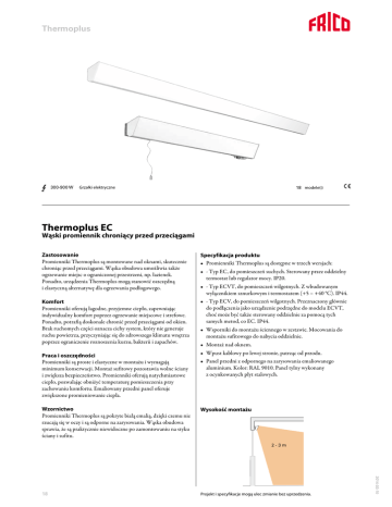 Thermoplus 300-900 W Grzałki elektryczne 18 modele(i) Thermoplus EC Wąski promiennik chroniący przed przeciągami Zastosowanie Promienniki Thermoplus są montowane nad oknami, skutecznie chroniąc przed przeciągami. Wąska obudowa umożliwia także ogrzewanie miejsc o ograniczonej przestrzeni, np. łazienek. Ponadto, urządzenia Thermoplus mogą stanowić oszczędną i elastyczną alternatywę dla ogrzewania podłogowego. Specyfikacja produktu • Promienniki Thermoplus są dostępne w trzech wersjach: Komfort Promienniki oferują łagodne, przyjemne ciepło, zapewniając indywidualny komfort poprzez ogrzewanie miejscowe i strefowe. Ponadto, potrafią doskonale chronić przed przeciągami od okien. Brak ruchomych części oznacza cichy system, który nie generuje ruchu powietrza, przyczyniając się do zdrowszego klimatu wnętrza poprzez ograniczenie roznoszenia kurzu, bakterii i zapachów. • - Typ ECV, do pomieszczeń wilgotnych. Przeznaczony głównie do podłączenia jako urządzenie podrzędne do modelu ECVT, choć może być także sterowany oddzielnie za pomocą tych samych metod, co EC. IP44. Praca i oszczędności Promienniki są proste i elastyczne w montażu i wymagają minimum konserwacji. Montaż sufitowy pozostawia wolne ściany i zwiększa bezpieczeństwo. Promienniki oferują natychmiastowe ciepło, pozwalając obniżyć temperaturę pomieszczenia przy zachowaniu komfortu. Emaliowany przedni panel oferuje zwiększone promieniowanie ciepła. • Wpust kablowy po lewej stronie, patrząc od przodu. Wzornictwo Promienniki Thermoplus są pokryte białą emalią, dzięki czemu nie rzucają się w oczy i są odporne na zarysowania. Wąska obudowa sprawia, że są praktycznie niewidoczne po zamontowaniu na styku ściany i sufitu. Wysokość montażu • - Typ EC, do pomieszczeń suchych. Sterowany przez oddzielny termostat lub regulator mocy. IP20. • - Typ ECVT, do pomieszczeń wilgotnych. Z wbudowanym wyłącznikiem sznurkowym i termostatem (+5 – +40 °C). IP44. • Wsporniki do montażu ściennego w zestawie. Mocowania do montażu sufitowego do nabycia oddzielnie. • Montaż nad oknem. • Panel przedni z odpornego na zarysowania emaliowanego aluminium. Kolor: RAL 9010. Panel tylny wykonany z ocynkowanych płyt stalowych. 2-3m Projekt i specyfikacje mogą ulec zmianie bez uprzedzenia. 2014-03-10 18 Thermoplus Po wyeliminowaniu przeciągów można wykorzystać przestrzeń w pobliżu okien. Montowane razem promienniki Thermoplus tworzą spójny szereg. Promienniki Thermoplus służą do ochrony przed przeciągami. Promienniki umieszczone wysoko wzdłuż dźwigarów są bardzo dyskretne. Promienniki Thermoplus zamontowane na połączeniu ściany i sufitu zajmują minimum miejsca. Promienniki Thermoplus tworzą przyjemne ciepło w pomieszczeniu i na podłodze, będąc oszczędną alternatywą dla ogrzewania podłogowego. 19 Thermoplus Dane techniczne | Typ Thermoplus EC. Do pomieszczeń suchych. 3 Moc grzewcza Napięcie Natężenie [W] [V] [A] Temperatura powierzchni [°C] EC45021 450 230V~ 2,0 180 1076x100x90 2,6 EC45031 450 400V~ 1,1 180 1076x100x90 2,6 EC60021 600 230V~ 2,6 180 1505x100x90 3,7 EC60031 600 400V~ 1,5 180 1505x100x90 3,7 EC75021 750 230V~ 3,3 180 1810x100x90 4,4 EC75031 750 400V~ 1,9 180 1810x100x90 4,4 EC90021 900 230V~ 3,9 180 2140x100x90 4,8 EC90031 900 400V~ 2,3 180 2140x100x90 4,8 Dane techniczne | Typ Wymiary DxWxG [mm] Masa [kg] Thermoplus ECVT. Do pomieszczeń wilgotnych. Wbudowany termostat, wyłącznik elektryczny, kontrolka. 3 Moc grzewcza Napięcie Natężenie [W] [V] [A] Temperatura powierzchni [°C] ECVT30021 300 230V~ 1,3 180 870x100x90 2,6 ECVT55021 550 230V~ 2,4 180 1505x100x90 4,3 ECVT55031 550 400V~ 1,4 180 1505x100x90 4,3 ECVT70021 700 230V~ 3,0 180 1810x100x90 5,0 ECVT70031 700 400V~ 1,8 180 1810x100x90 5,0 Dane techniczne | Wymiary DxWxG [mm] Masa [kg] Thermoplus ECV. Do pomieszczeń wilgotnych. Podłączany jako urządzenie podrzędne do ECVT. 3 Typ Moc grzewcza Napięcie Natężenie [W] [V] ECV30021 300 230V~ ECV55021 550 ECV55031 Wymiary DxWxG [mm] Masa [A] Temperatura powierzchni [°C] 1,3 180 870x100x90 2,3 230V~ 2,4 180 1505x100x90 4,0 550 400V~ 1,4 180 1505x100x90 4,0 ECV70021 700 230V~ 3,0 180 1810x100x90 4,7 ECV70031 700 400V~ 1,8 180 1810x100x90 4,7 Stopień ochrony: Thermoplus EC: (IP20) normal design.Thermoplus ECVT and ECV: (IP44) splash-proof design. Certyfikat CE. 20 [kg] Thermoplus Wymiary Montaż na ścianie Montaż na suficie Typ EC Typ ECV, ECVT A [mm] B [mm] EC450 1076 600 EC600 1505 900 EC750 1810 1200 EC900 2140 1800 Mocowanie sufitowe A [mm] B [mm] ECV(T)300 870 400 ECV(T)550 1505 900 ECV(T)700 1810 1200 Montaż i podłączenie Montaż Promienniki Thermoplus są montowane poziomo nad oknami, skutecznie chroniąc m.in. przed przeciągami. W odróżnieniu do konwencjonalnych grzejników, promienniki Thermoplus montuje się powyżej okien, dzięki czemu są szczególnie odpowiednie do miejsc, w których przebywają dzieci. Standardowa dostawa obejmuje dwa uchwyty do montażu na ścianie. Mocowania do montażu sufitowego do nabycia oddzielnie, TF1. Minimalna odległość montażowa, patrz Rys. 1. Przyłącze Model Thermoplus jest przeznaczony do montażu stacjonarnego. W skrzynce zaciskowej znajduje się 5-biegunowa listwa (4 x 6 mm2 + uziemienie), która umożliwia połączenie mostkowe. Kilka promienników Thermoplus można podłączyć do jednego termostatu lub regulatora ogrzewania elektrycznego. Typ EC jest sterowany przez oddzielny termostat lub regulator mocy. Typ ECVT ma wbudowany wyłącznik sznurkowy i termostat. Typ ECV jest przeznaczony głównie do podłączenia jako urządzenie podrzędne do modelu ECVT, maks. 3600 W przy 230 V~ lub 4000 W przy 400 V~, choć może być także sterowany oddzielnie za pomocą tych samych metod, co EC. Materiał łatwopalny Rys. 1: Minimalna odległość przy montażu stacjonarnym. 21 Thermoplus Wpływ na temperaturę w pobliżu okien Szerokość okna, typ Niedobór ukie
