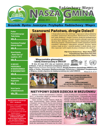 Radziechowy-Wieprz Nasza GmiNa Nr 6 (89) Czerwiec 2015 egzemplarz bezpłatny ISSN 2353-821X Urząd Gminy Bystra Juszczyna Przybędza Radziechowy Wieprz Brzuśnik Radziechowy Wieprz Puchar Przewodniczącego Rady Gminy str. 3 Powiatowy Przegląd Orkiestr Dętych str. 4 Dzień Dziecka „ Mama Tata i ja” wspólnie z JP II str. 4 III MIEJSCE PRZEDSZKOLA W RADZIECHOWACH W WOJEWÓDZTWIE!! str. 6 Konkurs Poezji Regionalne str. 7 Dzień Sportu w Radziechowach str. 19 Wyniki konkursu teatralnego 2015 – raz jeszcze W ostatnim wydaniu gazetki Nasza Gmina w wynikach III konkursu teatralnego „Uśmiech lekiem na całe zło!” jedna ze zwycięskich grup została błędnie podana: III miejsce w Kategorii szkół podstawowych zajęła: Grupa ze Szkoły Podstawowej im. Jana Klina w Wieprzu. W imieniu redakcji przepraszamy i jeszcze raz gratulujemy! Szanowni Państwo, drogie Dzieci! Z okazji zakończenia roku szkolnego i rozpoczęcia wakacji składamy wszystkim Szanownym Nauczycielom, Wychowawcom, Pracownikom szkół, Rodzicom i Drogim Uczniom serdeczne podziękowania za całoroczną współpracę i szczere życzenia udanego wypoczynku. Życzymy Wam dobrego zdrowia i radości, bezpiecznych podróży, słonecznej pogody i niezapomnianych wrażeń przeżytych podczas wszystkich niezwykłych wakacyjnych przygód. Życzymy, byśmy wszyscy mogli się dnia 1 września spotkać w szkole zdrowi, szczęśliwi, wypoczęci i pełni zapału do pracy w kolejnym roku szkolnym. Życzą Wójt Gminy Radziechowy - Wieprz Maciej Mika Przewodniczący Rady Gminy Piotr Piela Radni oraz Sołtysi Gminy Radziechowy - Wieprz Wieprzańskie gimnazjum - Szkołą Stowarzyszoną w UNESCO! W dniu 20 maja 2015 roku po trzyletnim okresie próbnym, w tym po otrzymaniu pozytywnej rekomendacji Polskiego Komitetu Narodowego UNESCO, decyzją Dyrektora Generalnego UNESCO z siedzibą w Paryżu, Gimnazjum Międzynarodowego Partnerstwa z Oddziałami Dwujęzycznymi w Wieprzu, zostało włączone do międzynarodowej sieci szkół UNESCO. Więcej na str. 25-27 SERDECZNIE ZAPRASZAJAMY NA III PRZEGLĄD POTRAW REGIONALNYCH „ŚWIĘTO ŁASUCHA” oraz JUBILEUSZ – „GROJCOWIANIE” – XX LAT KU ZACHOWANIU TRADYCJI Amfiteatr w Wieprzu 4 lipca 2015 o godzinie 16.00! Więcej na str. 13-16 NIETYPOWY DZIEŃ DZIECKA W BRZUŚNIKU Radości i śmiechu nie było końca. 1 czerwca 2015 r. w Brzuśniku odbyło się otwarcie długo wyczekiwanego placu zabaw! Setna rocznica urodzin Patrona szkoły Ks. Jana Twardowskiego, Dzień Dziecka, Rambit z Księdzem Janem i Dzień Sportu oraz otwarcie placu zabaw – taki zestaw wydarzeń nie mógł przejść bez echa. W tym dniu odbył się festyn dla wszystkich szkolnych dzieci. Choć uwagę milusińskich przyciągała niewątpliwie dmuchana zjeżdżalnia, zawody sportowe i smaczny poczęstunek przygotowany przez Panie z Koła Gospodyń Wiejskich w Brzuśniku, rodziców i sponsorów, to największą atrakcją był nowy plac zabaw. – Do tej pory Brzuśnik był jedyną wsią w gminie, gdzie brakowało miejsca na odpoczynek i zabawę dla najmłodszych. Cieszymy się, że w koń- cu jest, bo długo się o nie staraliśmy – komentuje Pani Czesława Kłusak – Przewodnicząca Stowarzyszenia Koła Gospodyń Wiejskich „Brzuśnik”, którego członkinie w sfinalizowanie inwestycji włożyły nie tylko serce, ale także pieniądze. Nasza Gmina Problem budowy placu zabaw był tematem nie tylko żywo omawianym w społeczeństwie sołectwa i będącym od dłuższego czasu przedmiotem starań gminy. W roku 2014 powstał projekt – o wartości 105556,21 zł – budowy miejsca rekreacji w Brzuśniku, który uzyskał dofinansowanie w ramach środków Programu Rozwoju Obszarów Wiejskich, w wysokości 35 tysięcy złotych. Reszta środków finansowych na ten cel pochodziła z budżetu gminy – 37 856,21 zł, oraz z darowizny przeznaczonej przez Stowarzyszenie Koło Gospodyń Wiejskich „Brzuśnik” w wysokości 32 700 zł! Uroczystości rozpoczęły się w Szkole Podstawowej im. Ks. Jana Twardowskiego występami uczniów, przygotowanymi specjalnie na ten dzień. Przed gośćmi wystąpiły: młodszy i starszy skład szkolnego zespołu tanecznego „ORANGE”, zespół wokalny „Wiolinki”, zespół taneczno-gimnastyczny „Akrobatki”, uczniowie klasy 1b z programem „O zdrowie dbamy, bo jedno mamy”, uczniowie klasy 5 z recytacją wierszy Ks. Jana Twardowskiego. Po obejrzeniu występów, goście wraz nauczycielami i wychowankami szkoły przeszli na plac przed Budynkiem Kulturalno-Oświatowym w Brzuśniku, gdzie Redyk w Przybędzy dokonano uroczystego przecięcia symbolicznej czerwonej wstęgi. Otwarcia tego wraz z Panem Wójtem, Sołtysem oraz Panią Czesławą Kłusak z KGW dokonały – wybrane w drodze szkolnego losowania – uczennice: Magdalena Misiarz i Emilia Sikora. Nowo otwarty plac zabaw został także poświęcony przez ks. Ireneusza Kurkowskiego. Kilka słów do dzieci i w podziękowaniu dla sponsorów wygłosili: Wójt gminy Pan Maciej Mika, Przewodniczący Rady Gminy Pan Piotr Piela, zastępca Dyrektora szkoły Pani Dorota Ryżka oraz Sołtys Brzuśnika Pan Stanisław Kupczak. Obecny w tym dniu był także radny sołectwa Brzuśnik Pan Stanisław Gołek oraz Pani Irena Rodak przewodnicząca Komisji Oświaty, Kultury, Sportu i Spraw Socjalnych. Całą uroczystość z wielkim profesjonalizmem i humorem prowadziła Pani Jadwiga Jurasz. Pani Marcie Husar organizatorzy dziękują za nagłośnienie. Nad bezpieczeństwem wszystkich świętujących i bawiących się dzieci czuwali dodatkowo strażacy z OSP Bystra, za co organizatorzy składają podziękowania. Serdecznie dziękujemy jeszcze raz wszystkim sponsorom uroczystości, twórcom placu zabaw oraz osobom, które przygotowały to piękne wydarzenie i wspomogły jego organizację! (M.H., D.R.) W dniu 17 maja w Kościele Matki Boskiej Częstochowskiej w Przybędzy odbyła się uroczysta Msza Św. w intencji pasterzy, po której zakończeniu kolorowy, uroczys