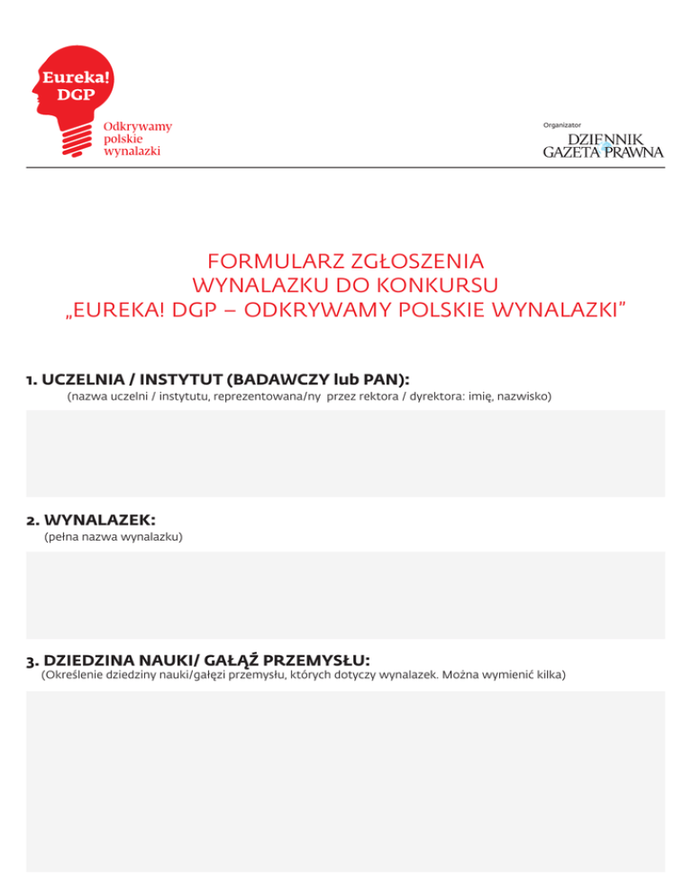 Organizator Organizator FORMULARZ ZGŁOSZENIA WYNALAZKU DO KONKURSU „EUREKA! DGP – ODKRYWAMY POLSKIE WYNALAZKI” 1. UCZELNIA / INSTYTUT (BADAWCZY lub PAN): (nazwa uczelni / instytutu, reprezentowana/ny przez rektora / dyrektora: imię, nazwisko) 2. WYNALAZEK: (pełna nazwa wynalazku) 3. DZIEDZINA NAUKI/ GAŁĄŹ PRZEMYSŁU: (Określenie dziedziny nauki/gałęzi przemysłu, których dotyczy wynalazek. Można wymienić kilka) 4. CO MOŻNA OSIĄGNĄĆ DZIĘKI WYNALAZKOWI? (Krótkie wyjaśnienie, w prosty sposób, zrozumiały dla nie specjalistów, czego dotyczy wynalazek i co można dzięki niemu osiągnąć) 5. ZESPÓŁ AUTORSKI: (skład, kierownik zespołu) 6. ISTOTA WYNALAZKU: (prezentacja wynalazku prostym, nienaukowym językiem, zrozumiałym dla osób spoza branży, opis zawierający maksymalnie 3600 znaków ze spacjami). Uzupełnieniem opisu będzie załącznik nr 3 – zdjęcie lub wideoprezentacja wynalazku. 7. POTENCJAŁ KOMERCJALIZACYJNY WYNALAZKU: (przedstawienie możliwości wdrożenia wynalazku, opis przystępnym językiem, zrozumiałym dla niefachowców, objętość do 1000 znaków ze spacjami) 8. OSOBA DO KONTAKTU Z ORGANIZATORAMI KONKURSU: (osoba do kontaktu, numer telefonu komórkowego, adres e-mail) 9. POTRZEBY ZESPOŁU W CELU WDROŻENIA WYNALAZKU ORAZ PROWADZENIA DALSZYCH PRAC ROZWOJOWYCH: (określenie potrzeb ma służyć partnerom projektu oraz zainteresowanym podmiotom biznesowym w nawiązaniu współpracy z zespołem projektowym) - laboratorium: - know-how: - pomoc prawna: - finanse: - inne, jakie: 10.ZAŁĄCZNIK nr 1 – POTWIERDZENIE ZGŁOSZENIA WYNALAZKU DO URZĘDU PATENTOWEGO – skan 11. ZAŁĄCZNIK nr 2 – zgoda członków zespołu na publikację przekazanych materiałów na stronie internetowej konkursu oraz wykorzystanie ich przez Redakcję Dziennika Gazety Prawnej w jej publikacjach papierowych i serwisach internetowych oraz na publikację ich wizerunku i danych osobowych – skan (wzór załącznika w ząłączeniu) 12. ZAŁĄCZNIK nr 3 – materiały zdjęciowe lub wideo przedstawiające wynalazek (wystarczająca jakość – tel. komórkowy)