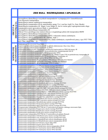 KOPIOWANIE GENEROWANIE TRANSPONDERÓW TRANSPONDERÓW ODCZYT & IDENTYFIKACJA ZED BULL ROZWIĄZANIA I APLIKACJE Szczegółowa identyfikacja wszystkich transponderów występujących w immobilizerach Test obecności transpondera Identyfikacja statusu zamknięcia transpondera Identyfikacja transpondera 48 do samochodów grupy Vw ( can bus Audi,Vw, Seat, Skoda) Identyfikacja transpondera 48 Magic I oraz Magic II. Jest to ważne gdyż zaprogramowanie złego transpondera może spowodować błędy w samochodzie. Szczegółowa identyfikacja transpondera 8C Odczyt Vin-u przebiegu oraz numeru klucza z oryginalnego pilota lub transpondera BMW Szczegółowa identyfikacja transpondera 4C Szczegółowa identyfikacja transpondera TPX2, wskazanie statusu zamknięcia. Szczegółowy odczyt transpondera 8E ( Honda, Audi ) Szczegółowa Identyfikacja transpondera 46 ( status zamknięcia, częstotliwość pracy, typ ( PCF 7936, PCF 7941, PCF 7946 …)) Stałokodowe : 11,12,13,33,73 na TP05 Kopiowanie wszystkich transponderów 4C na główki elektroniczne ( Key Line, Silca) Kopiowanie wszystkich transponderów 4C na TPX1 Kopiowanie niektórych 40 ( informacja o możliwości kopiowania) na TP05 lub transp. 40 Kopiowanie wszystkich transponderów 41 na prekodowany transponsponder lub 44 Kopiowanie wszystkich transponderów 42 na transponder TPH1 Kopiowanie wszystkich otwartych transponderów 44 ( Philips Crypto VW) na prekodowany transponder 44 Kopiowanie wszystkich transponderów 45 na prekodowany transponder 44 Kopiowanie wszystkich transponderów 4D na TPX2 lub Silca EH2 Kopiowanie transponderów 4D przy pomocy TPX Clonner JMA lub przez Internet Kopiowanie transponderów 4D Suzuki, Kawasaki, Yamaha, bez Internetu Kopiowanie transponderów 46 na transponder TPX3/4 online Generowanie transpondera 33 GM przy użyciu czystego PCF7930/31 Generowanie transpondera 33 Vag przy użyciu czystego PCF7930/31 Generowanie transpondera 33 Peugeot 1 przy użyciu czystego PCF7930/31 Generowanie transpondera 33 Peugeot 2 przy użyciu czystego PCF7930/31 Generowanie transpondera 33 Nissan przy użyciu czystego PCF7930/31 Generowanie transpondera 13 Megamos przy użyciu TP05 Generowanie transpondera 40 Opel przy użyciu czystego PCF7935 Generowanie transpondera 41 Nissan przy użyciu czystego PCF7935 Generowanie transpondera 42 Vag przy użyciu czystego PCF7935 Generowanie transpondera 44 Opel przy użyciu czystego PCF7935 Generowanie transpondera 44 Mitsubishi przy użyciu czystego PCF7935 Generowanie transpondera 45 Nissan przy użyciu czystego PCF7935 Generowanie transpondera 73 Mitsubishi przy użyciu czystego PCF7930/31 Generowanie transpondera Audi A8 ( 2003-2008) przy użyciu czystego PCF7936 Generowanie transpondera Citroen C3 ( 2000-2004) przy użyciu czystego PCF7936 Generowanie transpondera Citroen Picasso ( 2000-2004) przy użyciu czystego PCF7936 Generowanie transpondera Chrysler Circle+ przy użyciu czystego PCF7936 Generowanie transpondera Chrysler Hybrid przy użyciu czystego PCF7936 Generowanie transpondera Chrysler Grey przy użyciu czystego PCF7936 Generowanie transpondera GMC Buick przy użyciu czystego PCF7936 Generowanie transpondera GMC (can) przy użyciu czystego PCF7936 Generowanie transpondera Mitsubishi przy użyciu czystego PCF7936 Generowanie transpondera Nissan przy użyciu czystego PCF7936 Generowanie transpondera Opel Corsa D przy użyciu czystego PCF7936 Przygotowanie transpondera PCF7946 do 2,3 przyciskowych pilotów zdalnego sterowania Opla. Generowanie transpondera Peugeot przy użyciu czystego PCF7936 Generowanie transpondera Renault przy użyciu czystego PCF7936 Generowanie transpondera Porshe przy użyciu czystego PCF7936 Przygotowanie transpondera PCF7946 do 2,3 przyciskowych pilotów Renault Generowanie transpondera VW Phaeton przy użyciu czystego PCF7936 Generowanie transpondera VW Touareg przy użyciu czystego PCF7936 Generowanie transpondera 61 Mitsubishi przy użyciu transpondera 4D 60 Generowanie transpondera 62 Mitsubishi przy użyciu transpondera 4D 60 Generowanie transpondera 63 Ford przy użyciu Silca EH2 Generowanie transpondera 64 przy użyciu Silca EH2 Generowanie transpondera 65 Suzuki przy użyciu transpondera 4D 60 Generowanie transpondera 67 Toyota przy użyciu TPX2 lub EH2 Generowanie transpondera 68 Touota przy użyciu TPX2 lub EH2 BAZA BANYCH KODY PIN Lista 76 różnych aplikacji eeprom oraz Mcu ( szczegóły w liście aplikacji eeprom, Mcu) Automatyczny system rozpoznawanie modułu. Szczegółowe zdjęcia puszek immobilizera oraz jego obwodów drukowanych Szczegółowe zdjęcia adapterów programatora Szczegółowo rozrysowane wyprowadzenia pamięci lub procesora. Informacja o typie immobilizera wg modelu samochodu oraz roku jego produkcji Informacje na temat oryginalnego transpondera użytego w danym samochodzie Zdjęcie klucza do samochodu używającego dany typ immobilizera Generator zawartości transpondera na podstawie bajtów pamięci eeprom. Dla samochodów używających transponderów 11,12,13,33,4C oraz 4D. Procedura krok po kroku do przygotowania oraz zaprogramowania transpondera oraz pilota zdalnego sterowania w systemie mimo 1 Renault Generowanie transpondera do Mercedesa klasy C,E,G. Generowanie zawartości pamięci eeprom sterownika na podstawie kodu pin lub zawartości transpondera dla mimo 1 Renault DODATKOWE FUNKCJE PROGRAM PC Konwerter kodów PIN do samochodów Hyoundai, Kia. Konieczne ostatnie 6 cyfr kodu VIN. Przelicznik ten dotyczy samochodów wyprodukowanych do maja 2007. Generowanie kodu PIN z klucza klienta dla systemu 1 Renault ( system używa transpondera 33) Generowane kodu PIN z klucz klienta z transponderem 45 z samochodów Peugeot Generowane kodu PIN z klucz klienta z transponderem 4D 60-64 z samochodów Renault ZAAWANSOWANE FUNKCJE ( PROGRAM PC) Zapisywanie transponderów klienta (11,12,13,33,73,4C,40 kopiowalne,41,42,44 kopiowalne,45,4D w bazie danych. Zapisywanie kodów nacięć. Zapisywanie numeru telefonu, numeru VIN, kodu PIN. Łatw