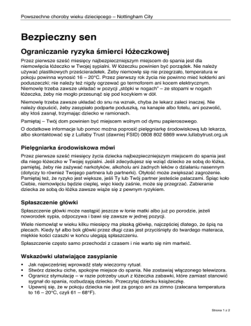Powszechne choroby wieku dziecięcego – Nottingham City Bezpieczny sen Ograniczanie ryzyka śmierci łóżeczkowej Przez pierwsze sześć miesięcy najbezpieczniejszym miejscem do spania jest dla niemowlęcia łóżeczko w Twojej sypialni. W łóżeczku powinien być porządek. Nie należy używać plastikowych prześcieradełek. Żeby niemowlę się nie przegrzało, temperatura w pokoju powinna wynosić 16 – 20°C. Przez pierwszy rok życia nie powinno mieć kołderki ani poduszeczki; nie należy też nigdy ogrzewać go termoforem ani kocem elektrycznym. Niemowlę trzeba zawsze układać w pozycji „stópki w nogach” – ze stopami w nogach łóżeczka, żeby nie mogło przesunąć się pod kocykiem w dół. Niemowlę trzeba zawsze układać do snu na wznak, chyba że lekarz zaleci inaczej. Nie należy dopuścić, żeby zasypiało podparte poduszką, na kanapie albo fotelu, ani pozwolić, aby ktoś zasnął, trzymając dziecko w ramionach. Pamiętaj – Twój dom powinien być miejscem wolnym od dymu papierosowego. O dodatkowe informacje lub pomoc można poprosić pielęgniarkę środowiskową lub lekarza, albo skontaktować się z Lullaby Trust (dawniej FSID) 0808 802 6869 www.lullabytrust.org.uk Pielęgniarka środowiskowa mówi Przez pierwsze sześć miesięcy życia dziecka najbezpieczniejszym miejscem do spania jest dla niego łóżeczko w Twojej sypialni. Jeśli zdecydujesz się wziąć dziecko ze sobą do łóżka, pamiętaj, żeby nie zażywać narkotyków, alkoholu ani żadnych leków o działaniu nasennym (dotyczy to również Twojego partnera lub partnerki). Otyłość może zwiększać zagrożenie. Pamiętaj też, że ryzyko jest większe, jeśli Ty lub Twój partner jesteście palaczami. Śpiąc koło Ciebie, niemowlęciu będzie cieplej, więc kiedy zaśnie, może się przegrzać. Zabieranie dziecka ze sobą do łóżka zawsze wiąże się z pewnym ryzykiem. Spłaszczenie główki Spłaszczenie główki może nastąpić jeszcze w łonie matki albo już po porodzie, jeżeli noworodek sypia, odpoczywa i bawi się zawsze w jednej pozycji. Wiele niemowląt w wieku kilku miesięcy ma płaską główkę, najczęściej dlatego, że śpią na plecach. Kiedy tył albo bok główki przez długi czas jest przyciśnięty do twardego materaca, miękkie kości czaszki w końcu ulegają spłaszczeniu. Spłaszczenie często samo przechodzi z czasem i nie warto się nim martwić. Wskazówki ułatwiające zasypianie Jak najwcześniej wprowadź stały wieczorny rytuał. Stwórz dziecku ciche, spokojne miejsce do spania. Nie zostawiaj włączonego telewizora. Ogranicz stymulację – w razie potrzeby usuń z łóżeczka zabawki, które zamiast stanowić sygnał do spania, rozbudzają dziecko. Przeczytaj dziecku książeczkę. Upewnij się, że w pokoju dziecka nie jest za gorąco ani za zimno (zalecana temperatura to 16 – 20°C, czyli 61 – 68°F). Strona 1 z 2 Powszechne choroby wieku dziecięcego – Nottingham City Raz Zawsze układaj niemowlę do snu w pozycji „na wznak do snu” i „stópki w nogach”. Dwa Organizm niemowlęcia nie potrafi skutecznie regulować swojej temperatury, więc staraj się, żeby dziecku nie było za gorąco ani za zimno. Trzy Przez pierwsze sześć miesięcy łóżeczko dziecka powinno stać w Twojej sypialni. Strona 2 z 2