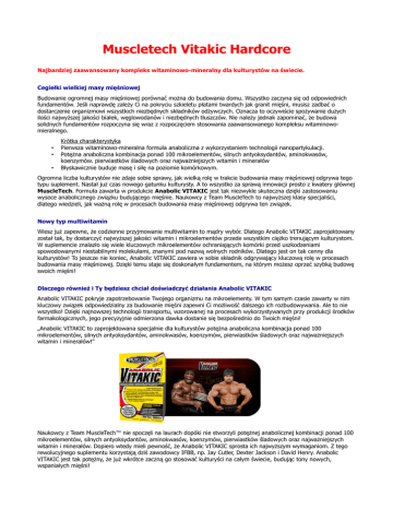 Muscletech Vitakic Hardcore Najbardziej zaawansowany kompleks witaminowo-mineralny dla kulturystów na świecie. Cegiełki wielkiej masy mięśniowej Budowanie ogromnej masy mięśniowej porównać można do budowania domu. Wszystko zaczyna się od odpowiednich fundamentów. Jeśli naprawdę zależy Ci na pokryciu szkieletu płatami twardych jak granit mięśni, musisz zadbać o dostarczenie organizmowi wszystkich niezbędnych składników odżywczych. Oznacza to oczywiście spożywanie dużych ilości najwyższej jakości białek, węglowodanów i niezbędnych tłuszczów. Nie należy jednak zapominać, że budowa solidnych fundamentów rozpoczyna się wraz z rozpoczęciem stosowania zaawansowanego kompleksu witaminowomieralnego. • • • Krótka charakterystyka Pierwsza witaminowo-mineralna formuła anaboliczna z wykorzystaniem technologii nanopartykulacji. Potężna anaboliczna kombinacja ponad 100 mikroelementów, silnych antyoksydantów, aminokwasów, koenzymów. pierwiastków śladowych oraz najważniejszych witamin i minerałów Błyskawicznie buduje masę i siłę na poziomie komórkowym. Ogromna liczba kulturystów nie zdaje sobie sprawy, jak wielką rolę w trakcie budowania masy mięśniowej odgrywa tego typu suplement. Nastał już czas nowego gatunku kulturysty. A to wszystko za sprawą innowacji prosto z kwatery głównej MuscleTech. Formuła zawarta w produkcie Anabolic VITAKIC jest tak niezwykle skuteczna dzięki zastosowaniu wysoce anabolicznego związku budującego mięśnie. Naukowcy z Team MuscleTech to najwyższej klasy specjaliści, dlatego wiedzieli, jak ważną rolę w procesach budowania masy mięśniowej odgrywa ten związek. Nowy typ multiwitamin Wiesz już zapewne, że codzienne przyjmowanie multiwitamin to mądry wybór. Dlatego Anabolic VITAKIC zaprojektowany został tak, by dostarczyć najwyższej jakości witamin i mikroelementów przede wszystkim ciężko trenującym kulturystom. W suplemencie znalazło się wiele kluczowych mikroelementów ochraniających komórki przed uszkodzeniami spowodowanymi niestabilnymi molekułami, znanymi pod nazwą wolnych rodników. Dlatego jest on tak cenny dla kulturystów! To jeszcze nie koniec, Anabolic VITAKIC zawiera w sobie składnik odgrywający kluczową rolę w procesach budowania masy mięśniowej. Dzięki temu staje się doskonałym fundamentem, na którym możesz oprzeć szybką budowę swoich mięśni! Dlaczego również i Ty będziesz chciał doświadczyć działania Anabolic VITAKIC Anabolic VITAKIC pokryje zapotrzebowanie Twojego organizmu na mikroelementy. W tym samym czasie zawarty w nim kluczowy związek odpowiedzialny za budowanie mięśni zapewni Ci możliwość dalszego ich rozbudowywania. Ale to nie wszystko! Dzięki najnowszej technologii transportu, wzorowanej na procesach wykorzystywanych przy produkcji środków farmakologicznych, jego precyzyjnie odmierzona dawka dostanie się bezpośrednio do Twoich mięśni! „Anabolic VITAKIC to zaprojektowana specjalnie dla kulturystów potężna anaboliczna kombinacja ponad 100 mikroelementów, silnych antyoksydantów, aminokwasów, koenzymów, pierwiastków śladowych oraz najważniejszych witamin i minerałów!” Naukowcy z Team MuscleTech™ nie spoczęli na laurach dopóki nie stworzyli potężnej anabolicznej kombinacji ponad 100 mikroelementów, silnych antyoksydantów, aminokwasów, koenzymów, pierwiastków śladowych oraz najważniejszych witamin i minerałów. Dopiero wtedy mieli pewność, że Anabolic VITAKIC sprosta ich najwyższym wymaganiom. Z tego rewolucyjnego suplementu korzystają dziś zawodowcy IFBB, np. Jay Cutler, Dexter Jackson i David Henry. Anabolic VITAKIC jest tak potężny, że już wkrótce zaczną go stosować kulturyści na całym świecie, budując tony nowych, wspaniałych mięśni! Naukowe podejście do kulturystyki zmieniło się raz jeszcze, i to na zawsze! Lata badań, różnorodne mieszanki firmowe i najnowocześniejsze technologie doprowadziły do stworzenia najbardziej zaawansowanego kompleksu multiwitaminowomineralnego dla kulturystów na świecie! Dlatego jeśli chcesz przyśpieszyć rozrost swoich mięśni do prędkości, o jakich nie śmiałeś nawet śnić, to potrzebujesz właśnie najbardziej zaawansowanego kompleksu multiwitaminowo-mineralnego, zaprojektowanego specjalnie dla współczesnych kulturystów. Jako ciężko trenujący kulturysta na pewno każdego dnia robisz wszystko, co tylko możliwe, by zmaksymalizować wzrost tkanki mięśniowej. Spożywasz tony protein i skupiasz się nad najdrobniejszymi detalami swojej harówki na siłowni. Dlaczego więc Twoje mięśnie nie rosną w tempie, w jakim powinnyω Jedna z możliwych odpowiedzi brzmi: nie przyśpieszasz do maksimum działania mechanizmów biochemicznych i procesów wewnątrzkomórkowych zachodzących w Twoim ciele. Z pomocą przyjdą Ci jednak naukowcy z Team MuscleTech™ - to najwyższej klasy specjaliści, którzy postanowili rozwiązać ten problem raz na zawsze. W skład formuły Anabolic VITAKIC™ wchodzą nie tylko mikroelementy i witaminy, ale również specjalny składnik o silnym działaniu anabolicznym! Naukowcy z Team MuscleTech™ dołożyli wszelkich starań, by każda porcja Anabolic Vitakic zawierała odpowiednią dawkę tego naukowo opracowanego komponentu. Dzięki temu Twoja masa mięśniowa i siła zaczną w końcu rosnąć! Anaboic VITAKIC to prawdziwe dzieło sztuki. Suplement nie służy jedynie pokryciu zapotrzebowania na mikroelementy, ale zawiera również zaawansowany składnik wpływający na wzrost masy mięśniowej, który wpływa na przebieg procesów wewnątrzkomórkowych, przyśpieszając tempo wzrostu! Formuła ta jest tak nowoczesna, że chroni ją aż siedem patentów. Opracowana została w oparciu o technologie stosowane przy tworzeniu systemów transportujących środki farmakologiczne bezpośrednio do odpowiednich organów ciała. Połączenie nowatorskiej technologii z szybkim dostarczeniem składników 